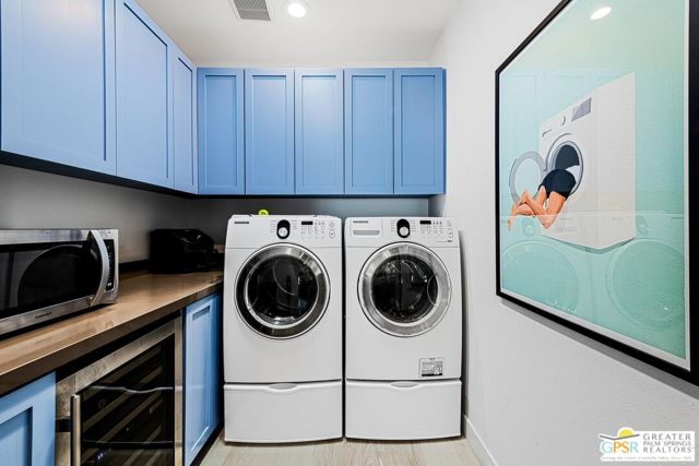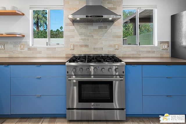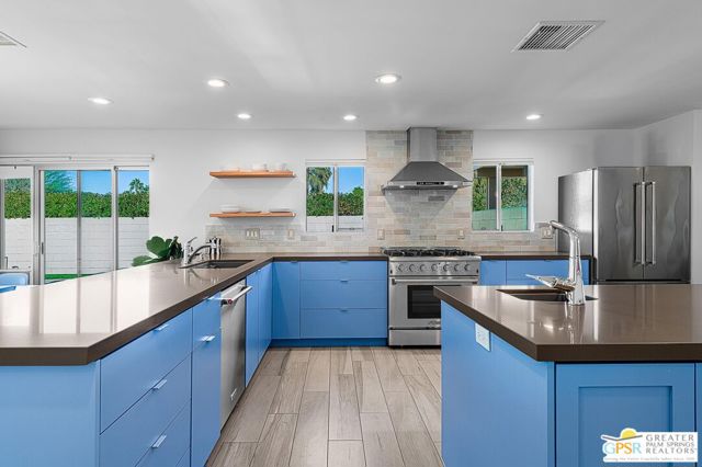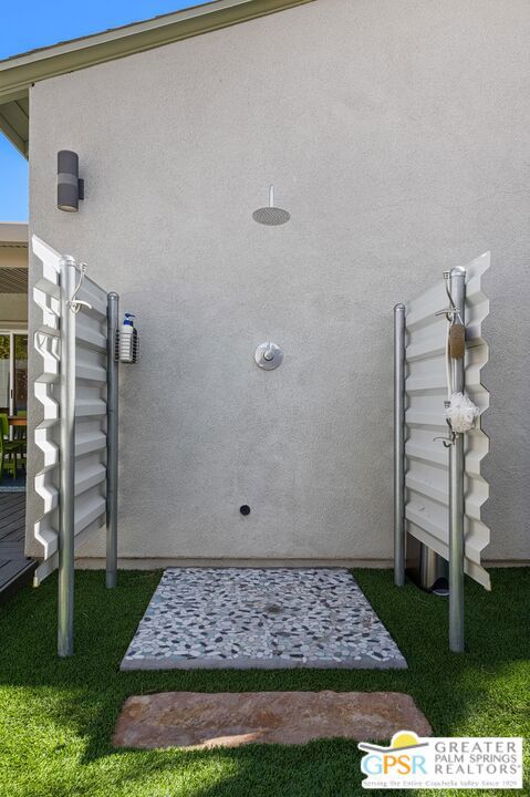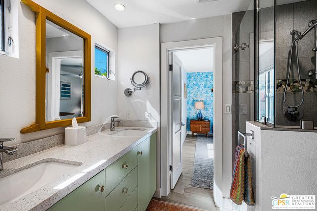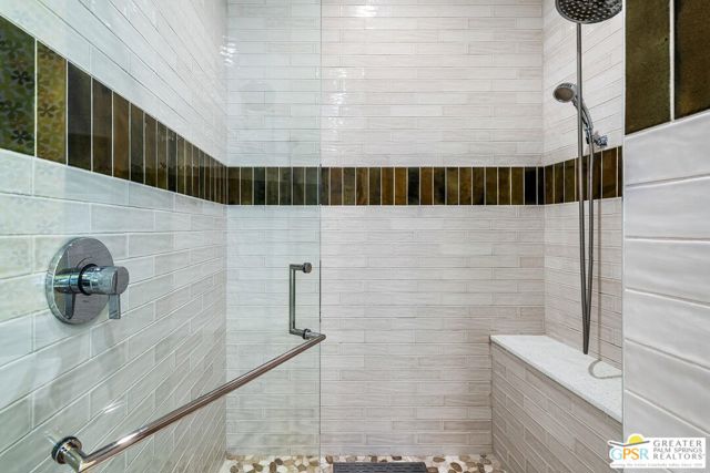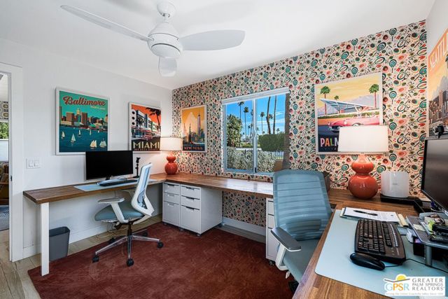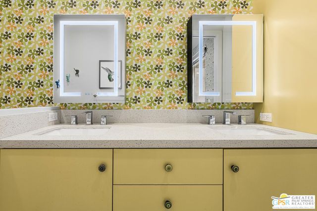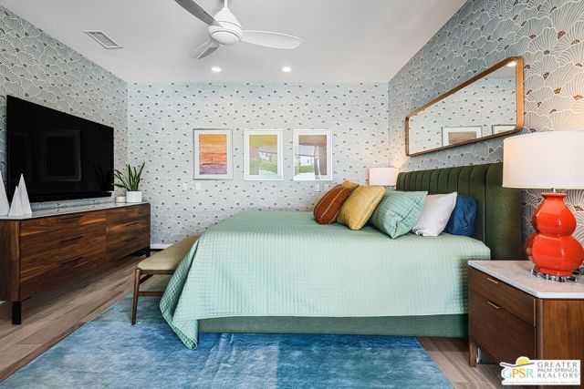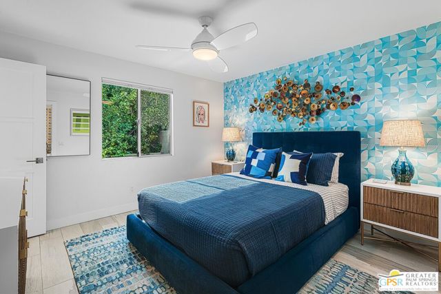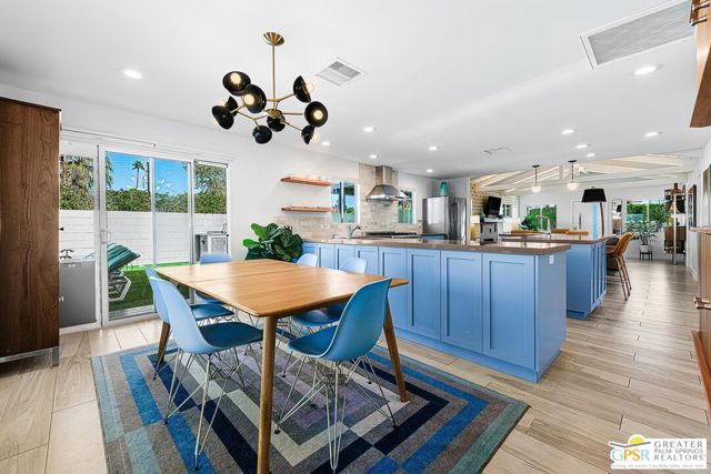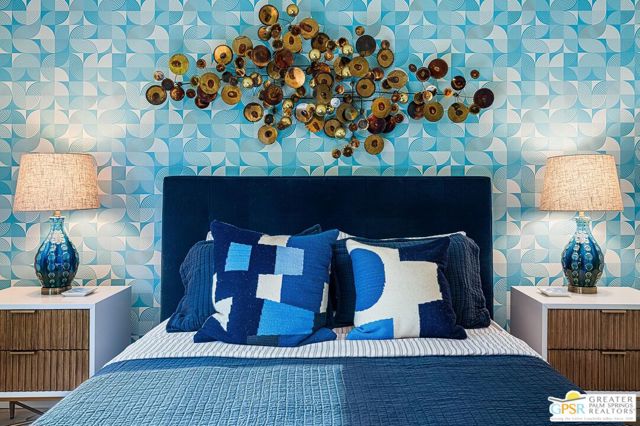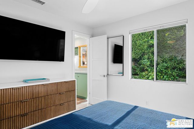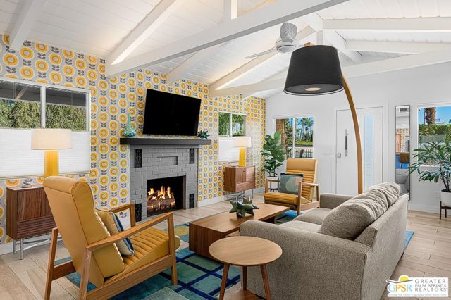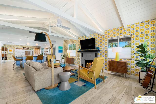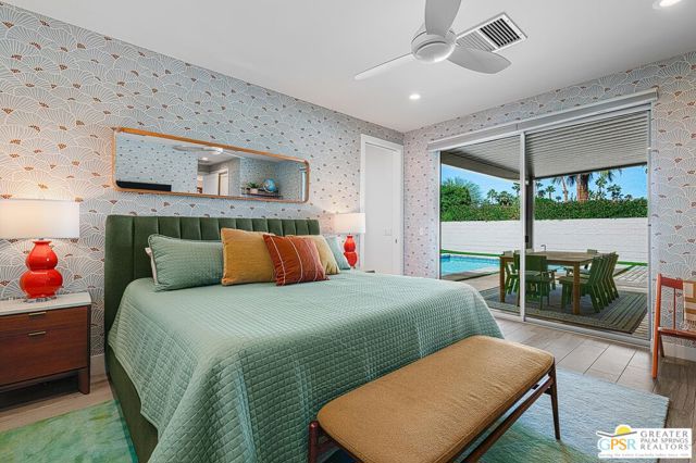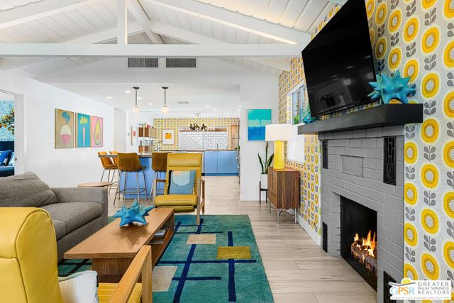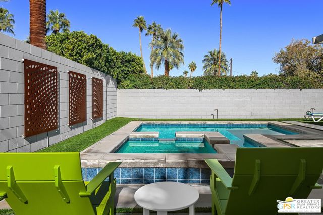 This sensational corner lot bungalow in Movie Colony East is better than ever. Sure to impress and delight at every turn, the enhanced wall-gated front yard and patio entrance leads to open concept living, dining and a gourmet kitchen at the heart of the home; complete with oversized island, 6-burner chef stove, prep sink, walk-in pantry with sleek finishes, perfect for entertaining family and friends. Walls of glass frame the dining area which opens to a beautiful and private covered back patio with bamboo decking. Take in awe-inspiring San Jacinto views out back from your pool and spa, outdoor shower, BBQ area and private sky lounge, perfect for soaking up the Palm Springs sunshine. The living room features architectural exposed beams and trusses along with its original fireplace. Beautiful Italian faux bois tile flooring throughout. Energy efficient insulation in exterior walls and ceilings, windows and doors. The primary suite provides direct patio and pool deck access, large walk-in closet, floor-to-ceiling built-ins, Solatube skylights, and bespoke finishes. Guest bedrooms feature a refreshing shared bath with state of the art commode and frameless glass shower. The laundry room is perfectly appointed, complete with utility sink and separate beverage fridge and plenty of storage. Gated and motorized carport and block walls with side gate provide for privacy and security. The 24 solar panel system is owned, adding energy efficiency. Whole house water filtration system (LifeSource). Low irrigation maintenance enhanced landscaping with multi-zone system. Prime location; enjoy the best of nearby Downtown and Uptown Palm Springs with Ruth Hardy Park virtually at your doorstep.
