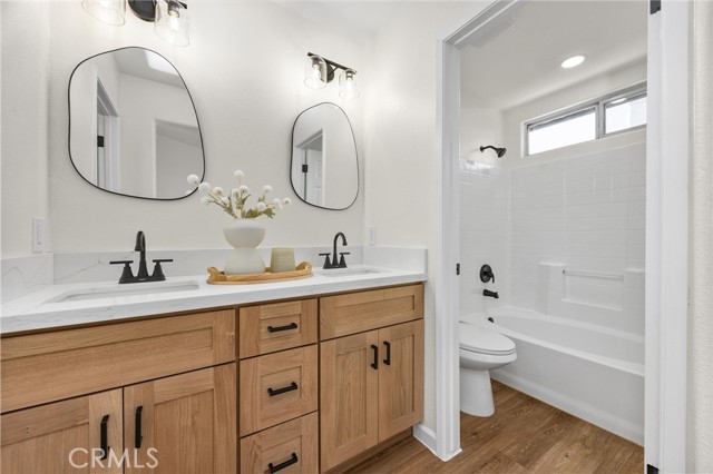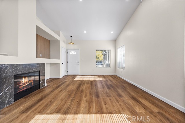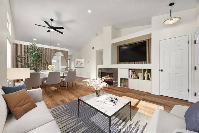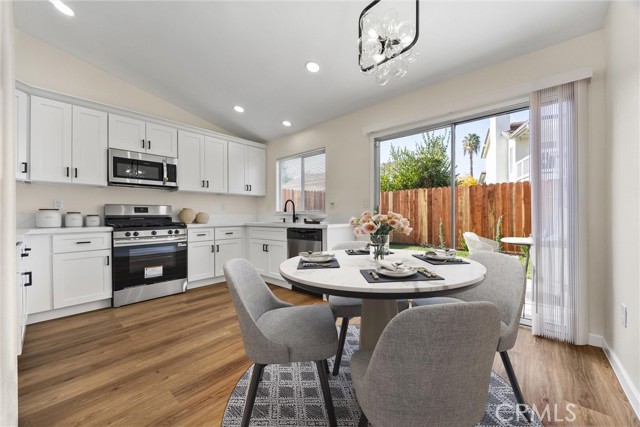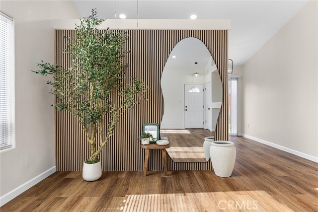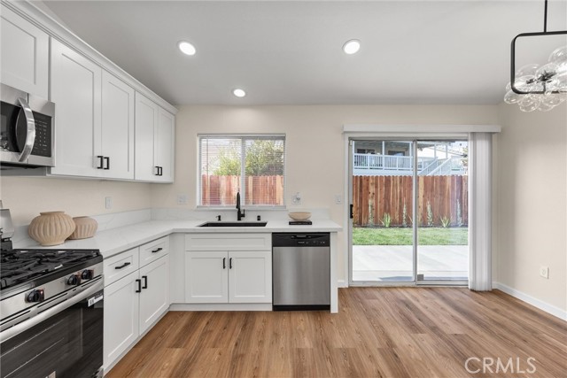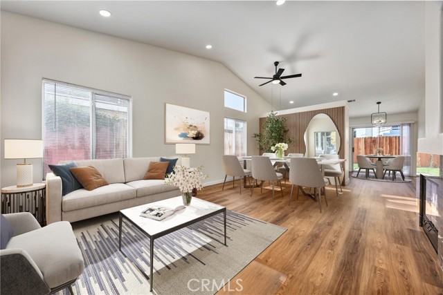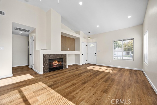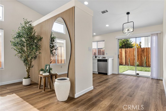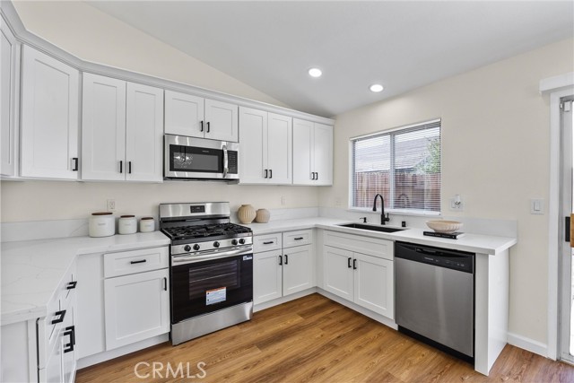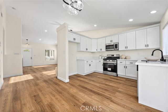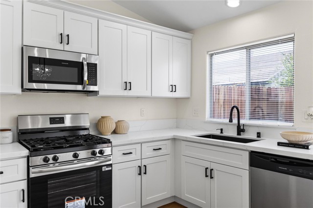 This Southwest Bakersfield home, nestled in the desirable Oaks, is a true gem. It offers 3 bedrooms and 2 bathrooms and has been thoughtfully updated with fresh interior and exterior paint, new wood-like flooring, and quartz countertops throughout. The kitchen features new cabinetry, stainless steel appliances, and refined black hardware. The open-concept living and dining area is anchored by an accented fireplace and a stunning wood slat feature wall with a built-in mirror. Both bathrooms include chic new vanities and mirrors, and the freshly reglazed showers create a clean and modern finish. An interior laundry room with new cabinets adds ample storage and convenience. The exterior showcases new sod in the back yard, complemented by refreshed landscaping and new wood fencing, for an inviting outdoor setting. With a tile roof, stone accents at the exterior, a new garage door and classic curb appeal, this home is move-in ready. Make this Oaks treasure yours today!