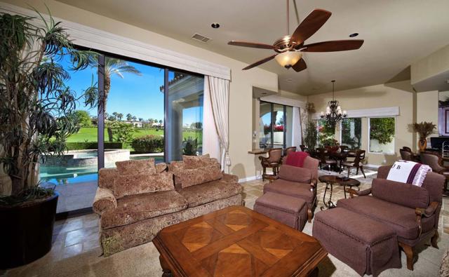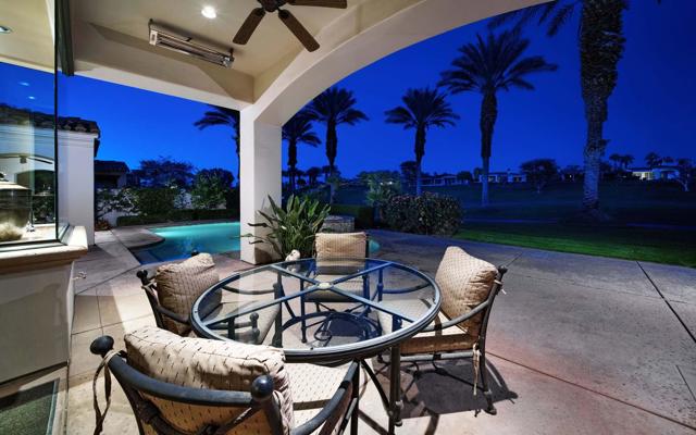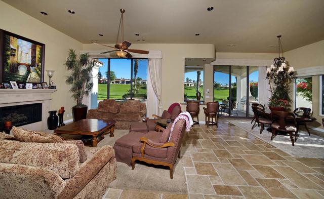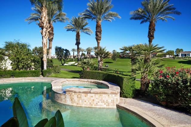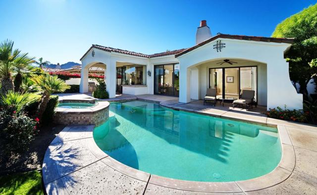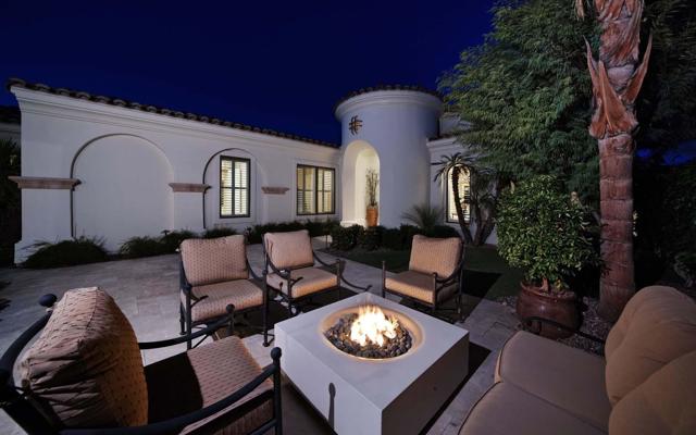 Nestled within the prestigious Toscana Country Club, this exquisite Plan 621 home combines the best of Early California design with stunning views of the Jack Nicklaus Signature South Course. The airy and open great room welcomes you with a cozy fireplace and expansive windows that flood the space with natural light while framing picturesque golf course vistas. The well-appointed kitchen is a culinary delight, featuring custom cabinetry, generous counter space, and high-end appliances, including a built-in refrigerator and gas range. Retreat into the serene master suite, which provides private access to the outdoor living area and sweeping views of the golf course. The luxurious en-suite bath showcases a freestanding soaking tub, a walk-in shower, dual vanities, and a spacious walk-in closet, all designed to create a peaceful and relaxing atmosphere. This home features a versatile office space and comfortable guest rooms. An added bonus room within the veranda off the main home offers additional space for leisure or hobbies, while the detached guest house with its en-suite bath ensures visitors enjoy the utmost privacy and comfort. The front courtyard is adorned with new hardscape and a cozy fire pit, perfect for relaxation. The backyard boasts a serene escape. An expansive patio and built-in BBQ area invite you to host memorable outdoor gatherings and meals while enjoying the breathtaking surroundings. This Early California style home harmoniously intertwines luxury, comfort, and desert elegance, establishing itself as the ideal retreat in Toscana Country Club.