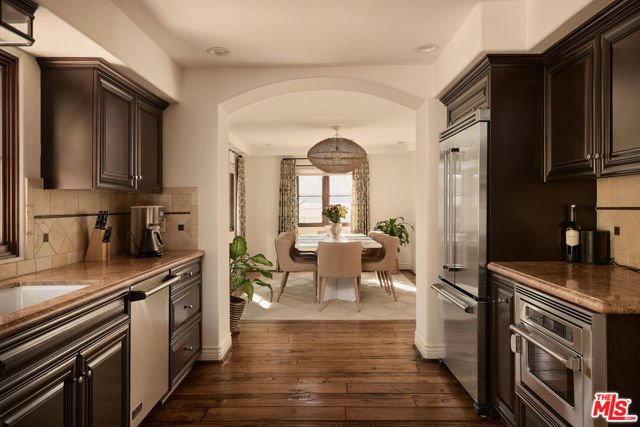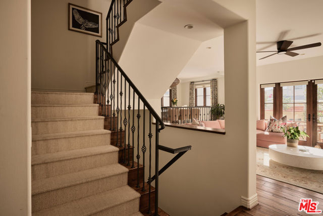 Just moments from Montana Avenue, this spacious Spanish townhouse sits on a peaceful, tree-lined stretch of 17th Street and offers generous interiors, remarkable natural light, refined craftsmanship, and thoughtfully designed privacy. Set within an impeccably maintained courtyard community, Unit 8 welcomes you with classic arches, terracotta detailing, and a lush landscape of mature palms and sculpted hedges. Inside, sunlight fills the well-proportioned living and dining areas. French doors open to a charming terrace, one of three private outdoor spaces. The cook's kitchen features stone countertops, Viking appliances, and abundant cabinetry designed with rich materials and functional hardware. Upstairs, the primary suite includes its own fireplace and a spacious bathroom finished in warm stone, complete with a soaking tub and separate glass shower. Two additional bedrooms complete the upper level. A standout feature is the serene, private rooftop terrace, an extension of the home with sweeping views, a pergola, and multiple seating areas. It's a true Santa Monica luxury: space to unwind, entertain, or simply enjoy the coastal breeze and palm-tree views. Additional amenities include in-unit laundry, central air, secure entry, and private gated garage parking. This coveted location offers close access to Santa Monica's best dining, shopping, and the beach.