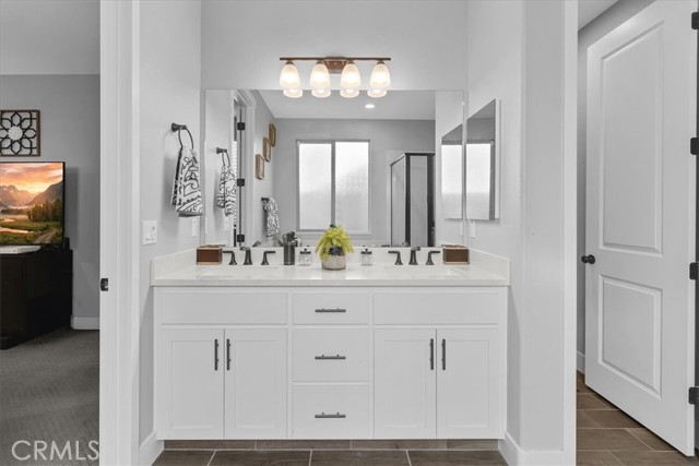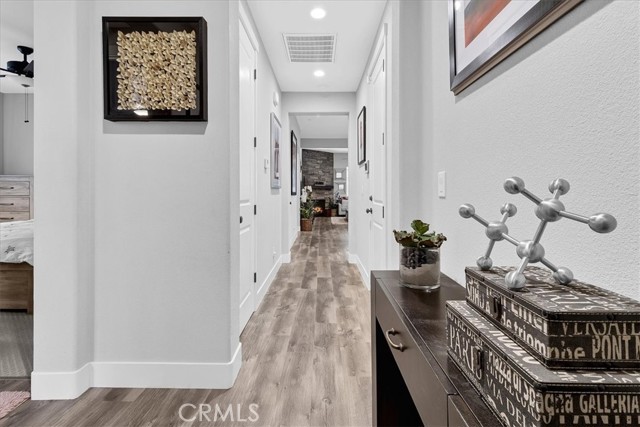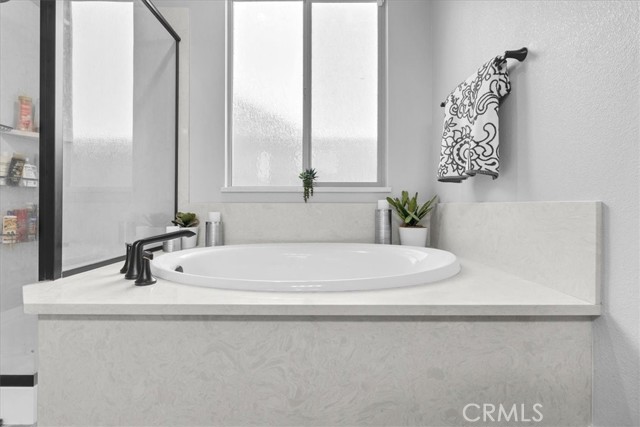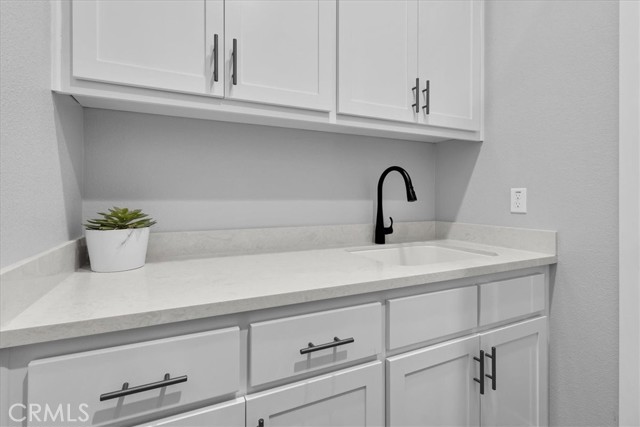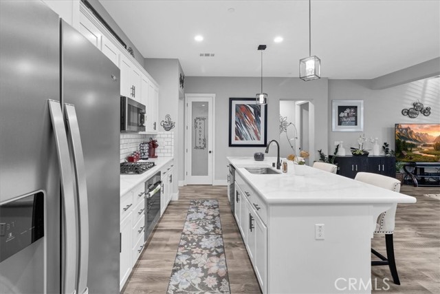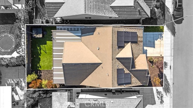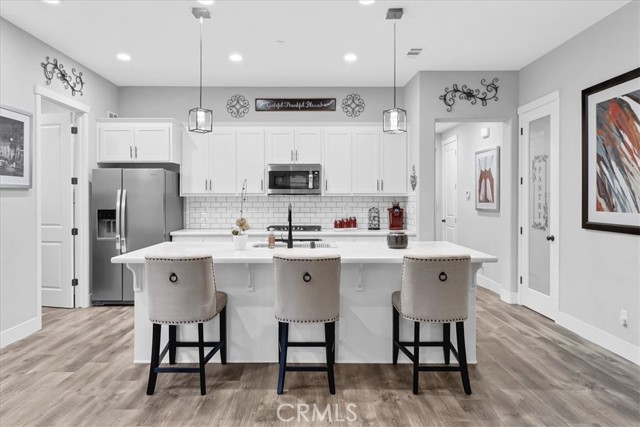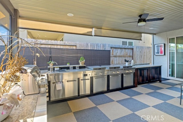 This completely upgraded single-story home offers modern style, thoughtful design, and an entertainer’s dream backyard. The open-concept living area features a spacious great room with abundant natural light, LVP flooring, and a seamless flow into the gourmet kitchen. The kitchen boasts white shaker cabinets, sleek quartz countertops, stainless steel appliances, a subway tile backsplash, and an oversized island with bar seating—perfect for hosting and everyday living. Just off the side of the kitchen, you'll find a dedicated laundry room offering added convenience, extra storage, and easy access without disrupting the home's main living spaces. The luxurious primary suite includes a spa-inspired bathroom with a relaxing soaking tub, a spacious walk-in shower, and walk-in closet. Two additional bedrooms provide comfort and flexibility, ideal for family, guests, or a home office. Step outside to your newly designed backyard oasis, complete with a full-length patio awning, roll-down privacy shades, low-maintenance turf, and an impressive outdoor kitchen setup, offering multiple built-in stainless steel appliances and extensive counter space. Whether relaxing or entertaining, this space is built to enjoy year-round. Additional features include upgraded lighting, custom window treatments, ample storage, and a clean, modern aesthetic throughout. Move-in ready and truly turnkey—this home combines comfort, luxury, and convenience in every detail. *Solar panels are leased, 12 panels* @ $97.73 per month