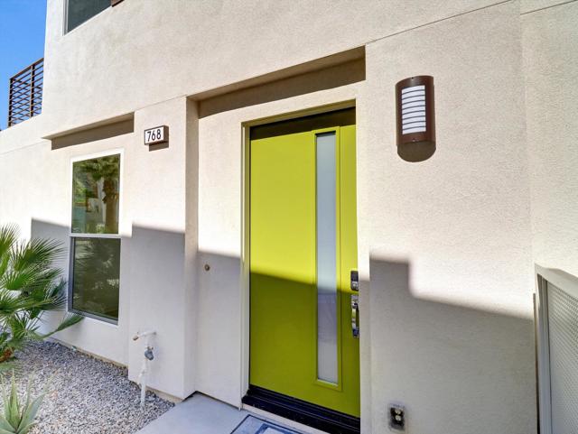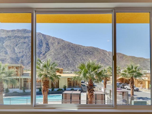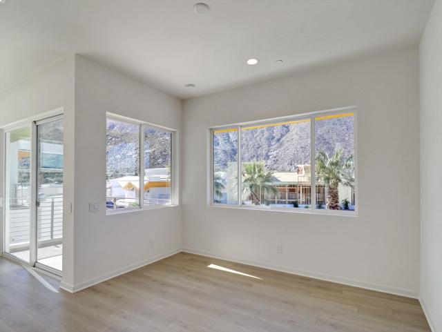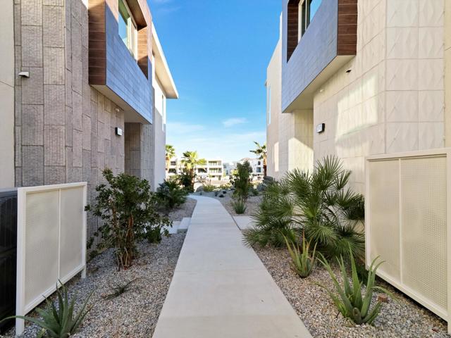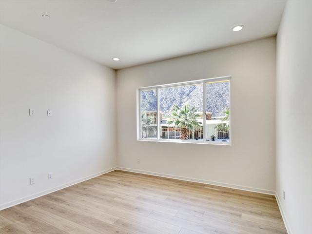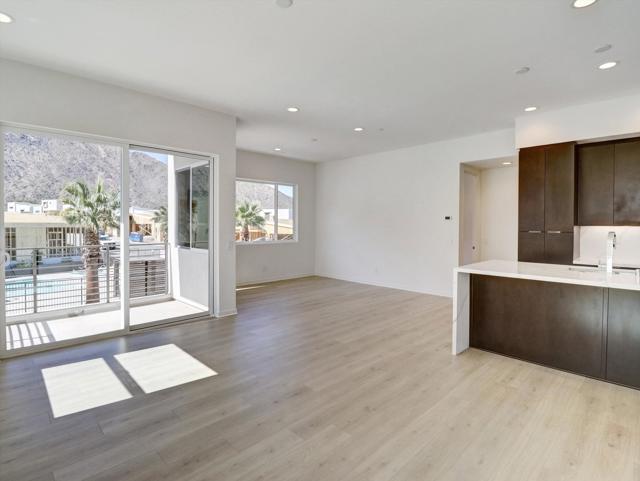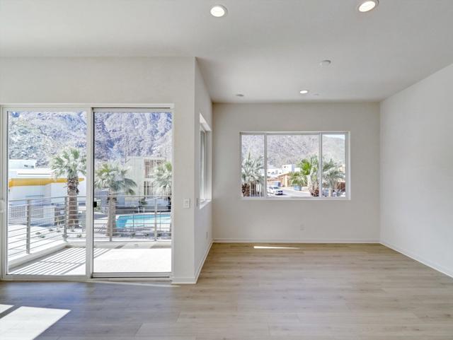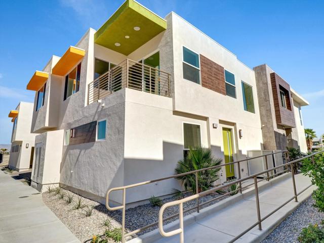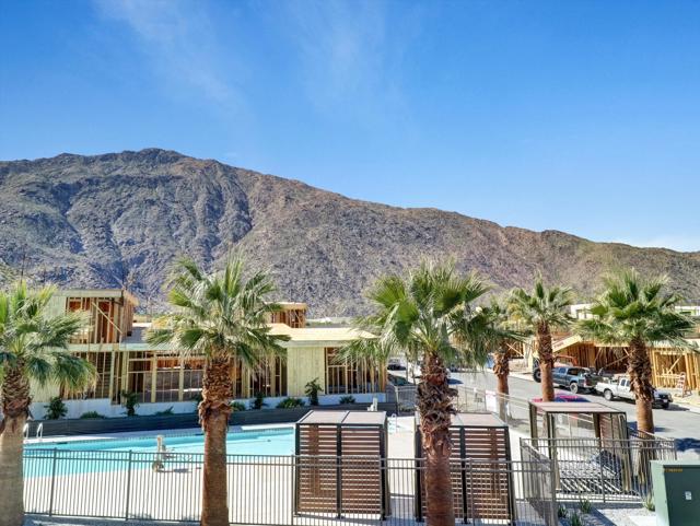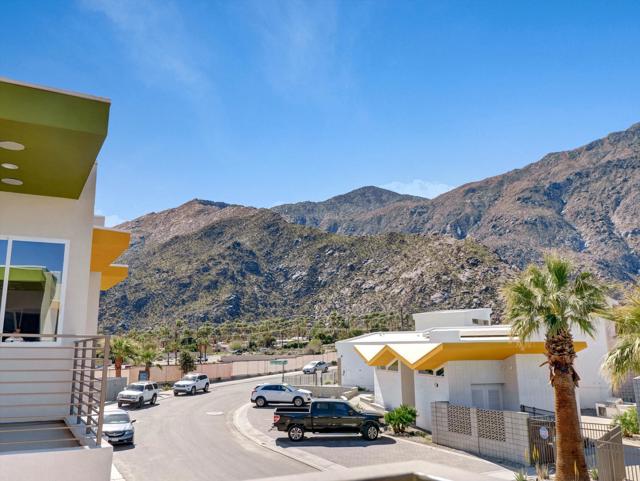 Welcome to Retro at E'lan Community and its offering of a mid-century modern townhome. This beautiful townhome features 1750 sqft of spacious living. This corner unit offers convenient location to the community pool and spa. This unit offers mountain Views from the living room, primary bedroom, and outside deck. Enter into 1st floor flex room and full bathroom which can be used as an office or gym! Head upstairs to the open family/living room and large kitchen featuring S/S Appliances, plenty of counter space, and island covered with upgraded quartz with water fall finish at island. Primary bedroom and bath with conveniently spacious walk in closet and dual vanities. Head down the hall to cozy guest bedroom with full bathroom. The home has Georgius Luxury Vinyl Plank Flooring throughout. This energy efficient home comes with Solar that is paid for and not leased. Paved shared driveway entering into 2 car garage offers direct access to your home. If you have a dog, you can enjoy the dark park included at elan. If you enjoy the nightlife, you are within walking distance to downtown South Palm Springs and all the restaurants and entertainment to keep you and your guest happy. Plenty of hiking trails starting with the Tahquitz Hiking Trail. The unit is part of a 5-unit building. Come be part of the story at Retro at E'lan Downtown Palm Springs! SOME PICTURES ARE OF MODEL HOME AND NOT OF SUBJECT PROPERTY..