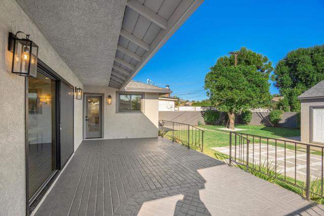 Beautifully remodeled, this Mission Hills home blends luxurious design with effortless indoor–outdoor living. Wide-plank flooring leads into a bright living room with a modern fireplace, layered textures, and expansive windows overlooking the landscaped yard. Sliding doors open to a generous covered patio ideal for relaxing or entertaining. The updated kitchen features quartz counters, designer tile, open shelving, and stainless appliances, with an elegant dining area nearby. The serene primary suite includes a refined bathroom with dual sinks and a stunning shower. Additional bedrooms offer versatility for guests, work, or flex space, complemented by an updated guest bath and a well-appointed laundry room. Outside, the spacious backyard showcases fresh hardscape, a manicured lawn, mature trees, a detached garage, tankless water heater, and owned solar for added efficiency. With close proximity to highly regarded schools, parks, dining, markets, and easy access to the 405 and 118, this home offers comfort, convenience, and modern style in one turnkey package.