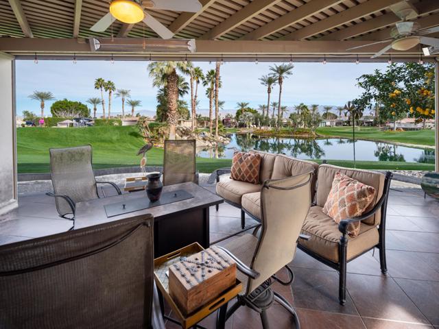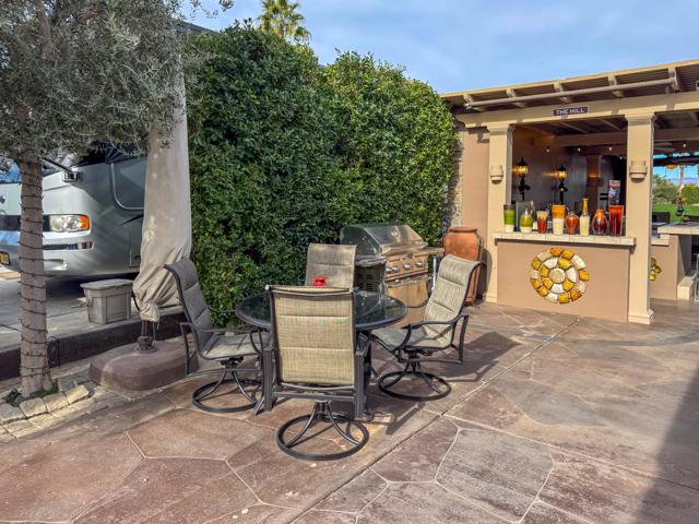 Outdoor Resort Indio is a Class A Motorcoach resort. This is an RV lot. Perched on the coveted 'The Hill' at Outdoor Resort Indio, this expansive luxury RV lot offers one of the most stunning and wide-open views in the entire resort. Enjoy unobstructed panoramic vistas of the Chocolate Mountains, which transform beautifully as the sun sets, along with cascading waterfalls, three tranquil ponds, a charming bridge, and the lush golf course--all perfectly framed by an extra-wide opening in the elegant L-shaped Alumawood pergola. Designed for both privacy and comfort, the lot features a full-height privacy wall, a full rear electric sunshade, and ample accent lighting to create a serene ambiance day and night. Three ceiling fans and four heaters ensure comfort, while decorative pots and stylish bar stools add a touch of elegance to the outdoor living space.The spacious outdoor kitchen is an entertainer's dream, complete with a large island and bar, room for a full-size fridge, BBQ, and tiled cabinets for convenient storage. Hot water is readily available, making meal preparation effortless, while the thoughtfully designed layout provides both mid-lot and original post hookups for added convenience. Whether you're enjoying a peaceful morning coffee while watching the ducks on the ponds or hosting an evening gathering under the pergola's rubber-coated tarp roof with entertainment lighting, this lot offers the ultimate blend of luxury, comfort, and resort-style living. Come see the amazing view for yourself!