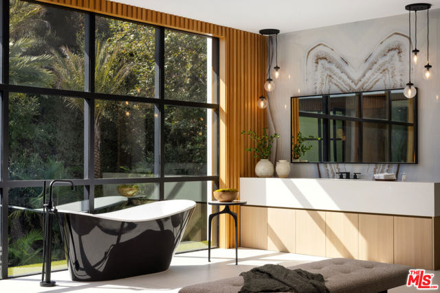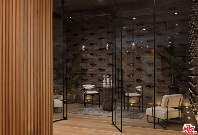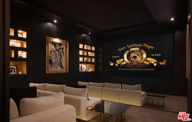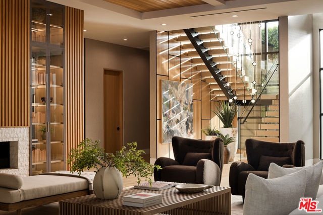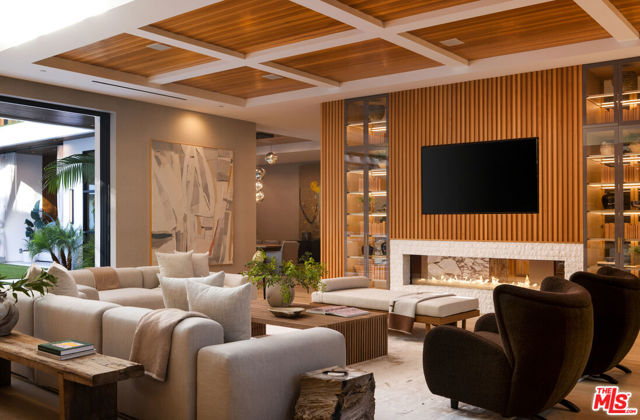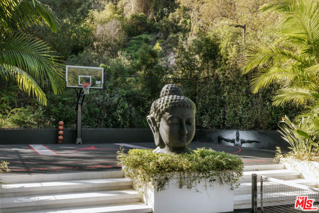 Indulge in an effortless resort-quality lifestyle from this extremely private entertainer's compound surrounded by natural greenery with sumptuous canyon views, showcasing a variety of premier amenities on 1.3 acres of mostly flat usable land. An absolute dream for recreational enthusiasts, growing families, and sports professionals alike, this exquisite haven includes a dedicated pickleball court, a professional-size basketball/sports court, and putting green, all enveloped by a flourishing leafy paradise. An expansive gated motor court provides parking for ten cars, and a striking entry calms the senses with soft organic tones complementing the lush hillside beyond. A gourmet chef's kitchen is outfitted with bookmatched stone slabs, triple waterfall island, and Miele appliances as well as a commercial-grade walk-in refrigerator in the caterer's prep galley. Both bar and wine room are showpiece standouts, and the theatre is expertly configured to match a true cinema experience. Upstairs, the primary wing alone spans 3,000 square feet and offers a lounge, two-sided fireplace, and a marvelous spa-worthy imported European stone-clad bathroom plus dual closet changing rooms, one of which features a walk-out balcony with fire pit overlooking the grounds below. Other amenities include an office, gym, sauna, and mud room. Enjoy a casual, fun-filled lifestyle at this private, family-friendly luxury resort that features a cabana with outdoor kitchen and rainfall curtain, relaxation loggia, a 16-person sunken fire pit with glass view to pool, numerous sitting areas, organic gardens, and 3,000-square-foot rooftop deck optimized for entertaining under California skies. Secluded in a park-like setting with no immediate neighbors, this ideal estate promises joyful existence and enduring, uninterrupted leisure from one of the most highly sought-after locales in the world. Welcome to the peak of contemporary luxury.