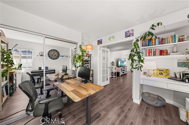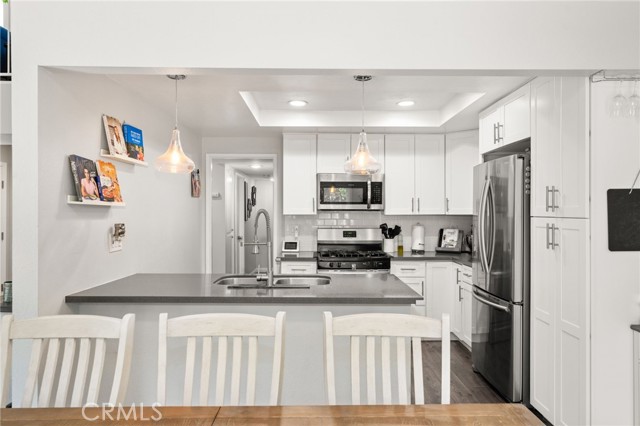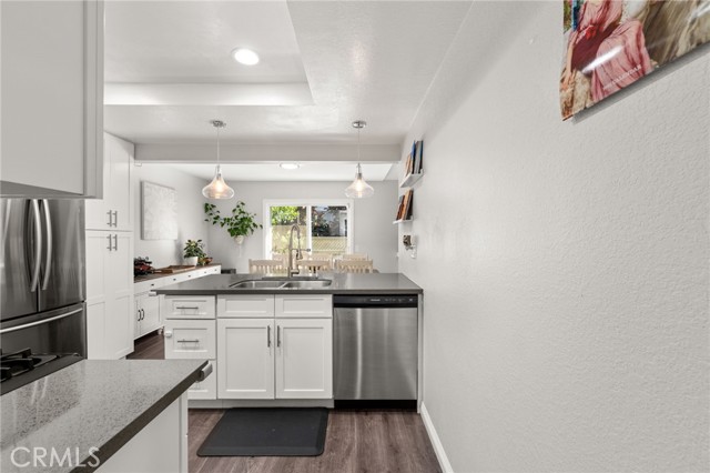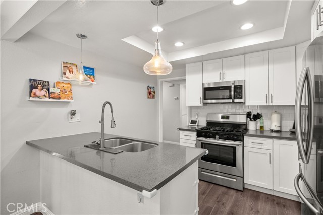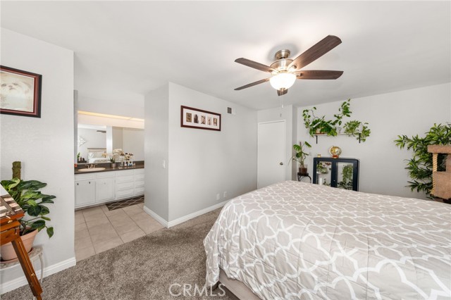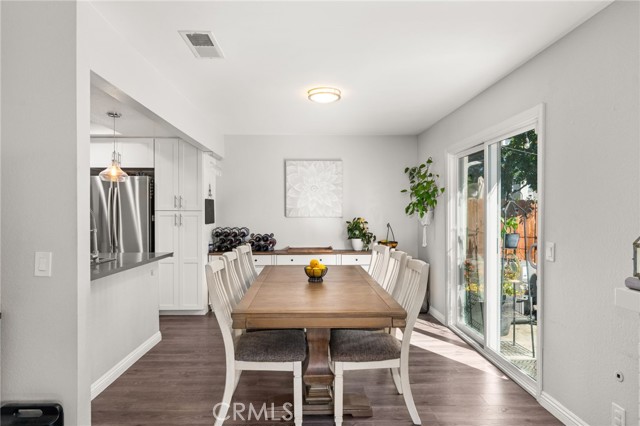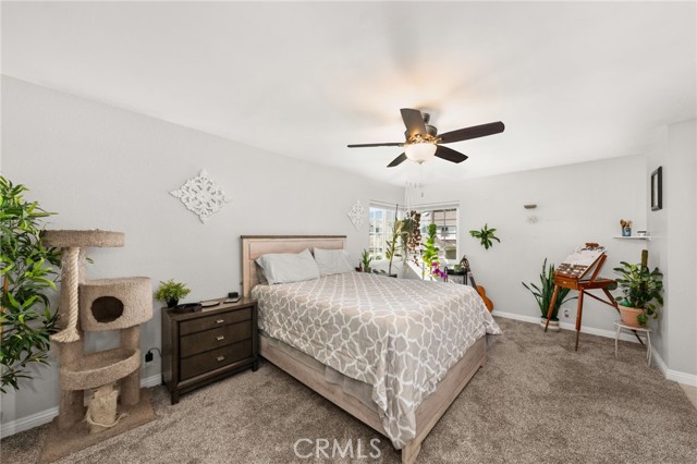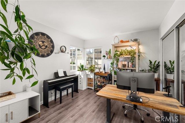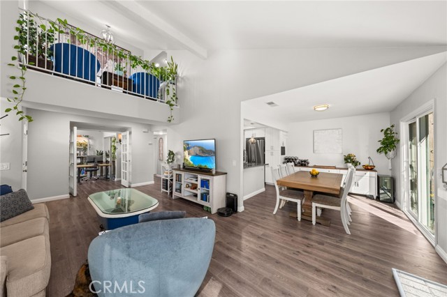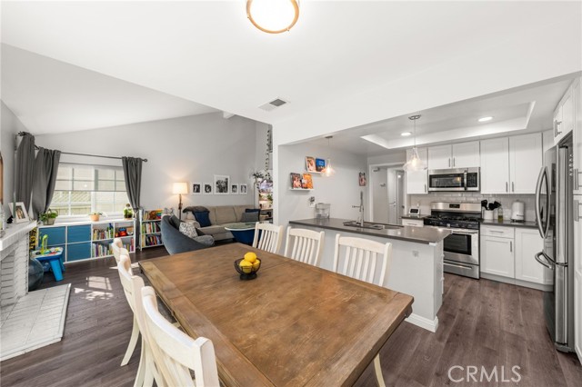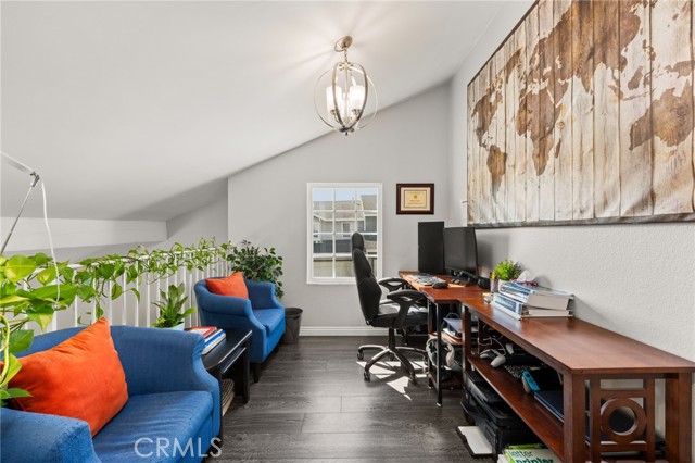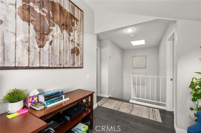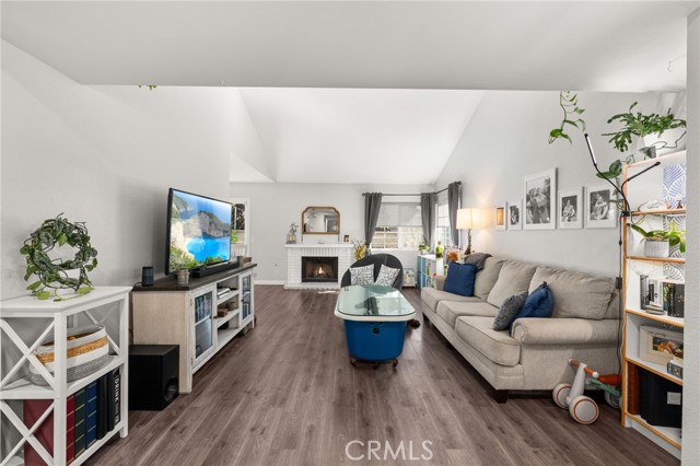 Welcome to this beautifully upgraded and thoughtfully designed 3-Bed, 2-Bath home where modern comforts meet stylish living. From the moment you step inside, you’re greeted by vaulted ceilings, stunning natural light, and designer laminate flooring that flows seamlessly throughout the open-concept main living area complete with a cozy fireplace. The heart of the home is the chef-inspired kitchen featuring quartz countertops, crisp white shaker cabinets, stainless steel appliances—including a gas stove and built-in microwave, stylish pendant lighting, and a breakfast bar that opens to the elegant dining space. French doors lead to a sun filled main level bedroom/office retreat with mirrored closet doors, built-in shelving, and an inspiring view of the lush greenery. Upstairs, a versatile loft serves as a second workspace or reading nook, enhanced by a skylight that fills the space with natural light. The primary bedroom suite is a true retreat, offering a walk-in closet, new carpet, and a beautiful ensuite bathroom with dual sinks, another skylight, and a private toilet room. Another upstairs bedroom is equally inviting, offering a northern view of the neighborhood's community park, and the distant San Gabriel mountain range. The full bath in the downstairs hallway features a fresh design with updated fixtures and classic tilework. Attached is a two car garage with direct home access, with an included EV car charger. Enjoy a newly upgraded Bradford H2O 50-gallon water heater, new HVAC condenser & forced-air units, new dual-pane windows, & new front door. Step outside through a sliding-glass door, to your private fenced backyard paradise with low-maintenance turf, a concrete patio, and a hybrid fruit tree offering peaches, plums, and nectarines from a single tree! Enjoy multiple seating areas, a cozy fire pit, and space to entertain under the stars.