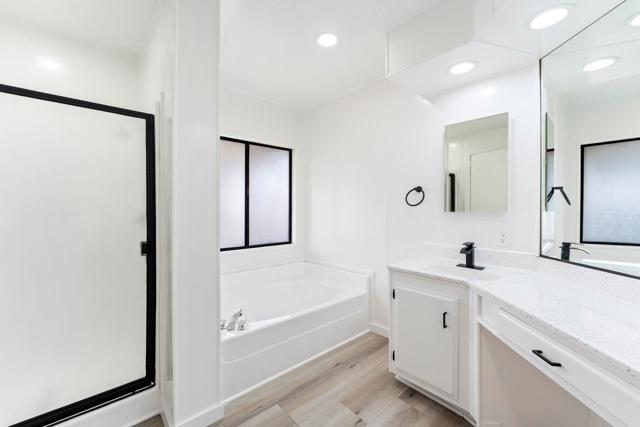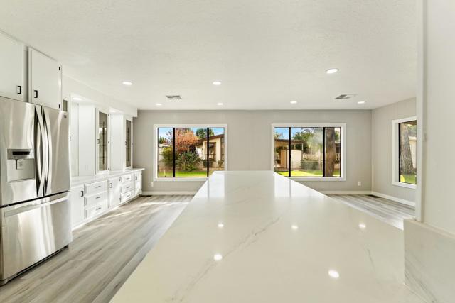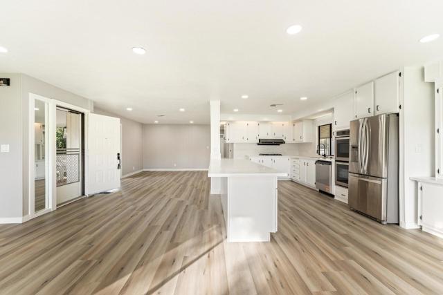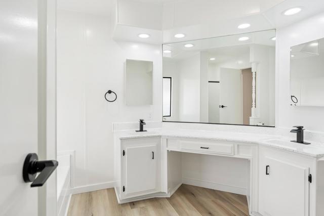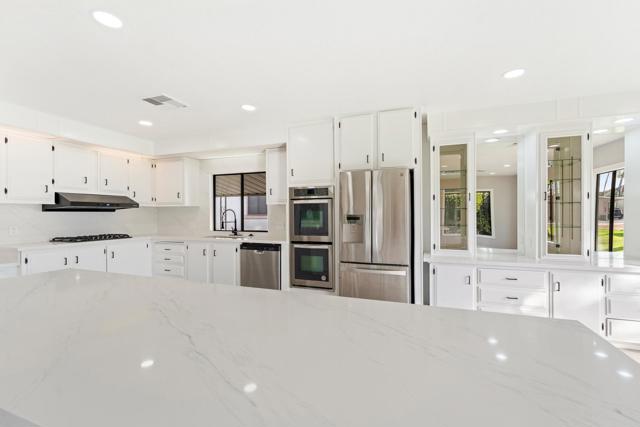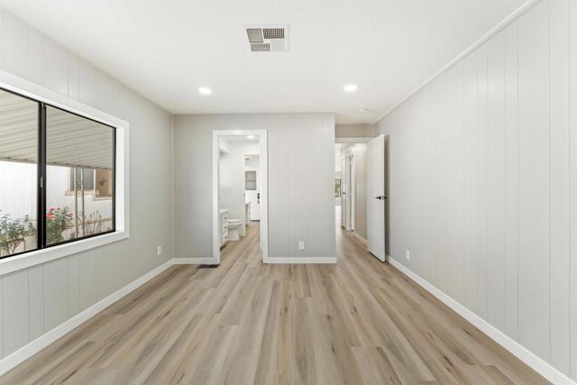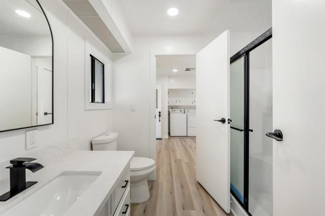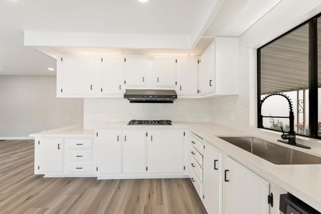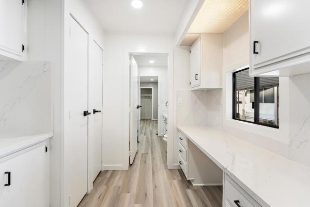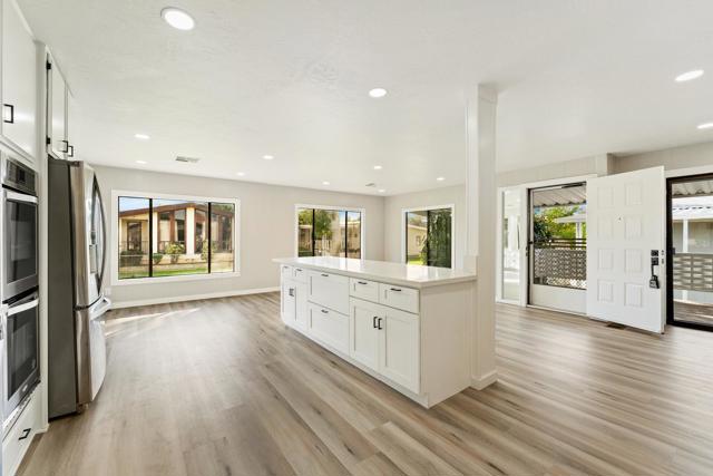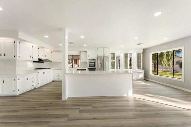 Beautifully remodeled 2-bedroom, 2-bath home located on an oversized greenbelt lot in the highly desirable guard-gated community of The Lakes at Hemet West. This light, bright, and airy home features an open floor plan with vaulted ceilings, contemporary finishes, and new laminate wood flooring throughout. The updated kitchen offers a large center island, ample storage, and a convenient dining bar. All stainless steel kitchen appliances included and washer and dryer. The primary bedroom includes a versatile retreat area ideal for an office or sitting space. The guest bedroom is generously sized with great storage. Both bathrooms have been tastefully updated and include tub/shower combinations. Additional features include a large laundry room, outdoor storage shed, extended driveway, and a private patio perfect for relaxing or entertaining. The Lakes at Hemet West offers resort-style amenities including lakes, waterfalls, fishing, golf, pickleball, tennis, swimming, fitness center, dog walk, card rooms, and frequent social activities. Move-in ready and updated to today's living standards--this is a must-see home.