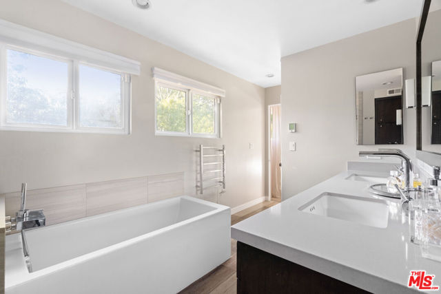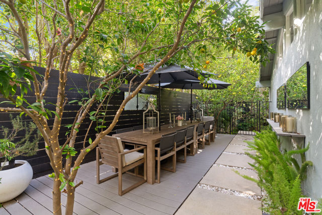A hidden sanctuary in the heart of Beverly Hills. Tucked away on a serene cul-de-sac, this ultra-private contemporary residence exemplifies refined elegance. Set behind a gated entry, a sprawling courtyard lined with lush greenery welcomes guests into this four-bedroom, four-bathroom home. The formal living room, just off the double-door entry, showcases grand arched ceilings and sliding doors, welcoming in ample natural sunlight throughout and providing access to the exterior bar for seamless entertaining. The chef's kitchen is fully equipped with state-of-the-art Viking and Sub-Zero appliances, including a new dishwasher, pristine quartz countertops, and an abundance of cabinetry. The primary suite features a cozy wood-burning fireplace, an expansive walk-in closet with built-ins, and a swanky en suite complete with heated porcelain floors, dual sinks, a generous soaking tub, and a standalone shower. Three additional guest bedrooms, all spacious in size, are located on the upper level as well. A swimmer's pool and spa, with a new heater, is lined by a teakwood bench, idyllically paired with blooming landscaping including avocado and citrus trees. A romantic outdoor dining area is perfect for enjoying meals al fresco. In addition to being fully fenced, a multitude of ADT security cameras throughout provide peace of mind.
