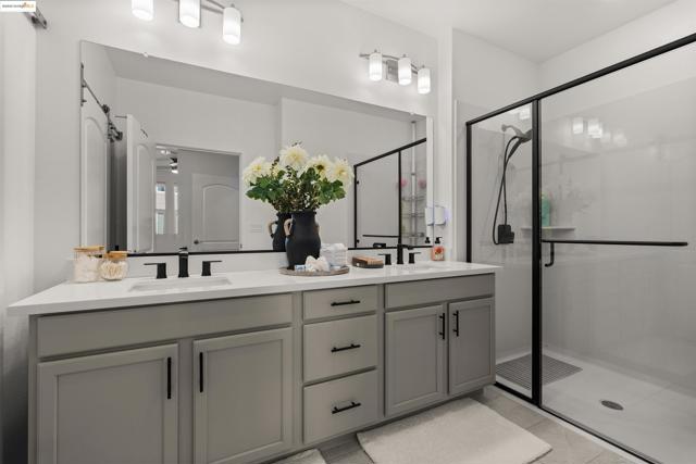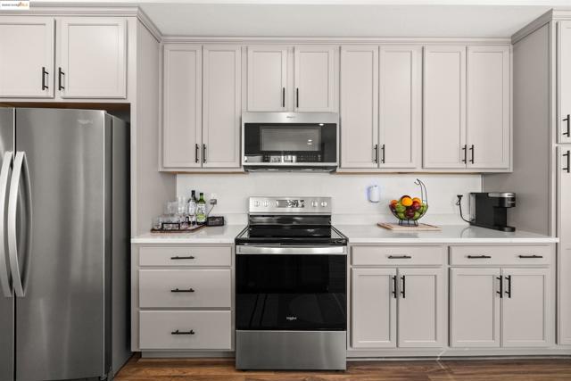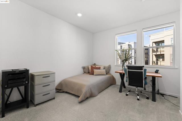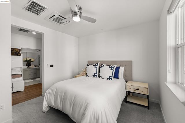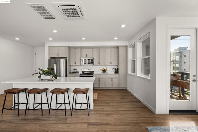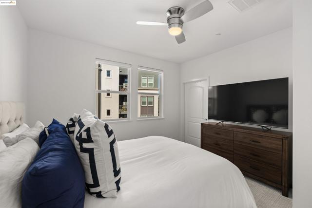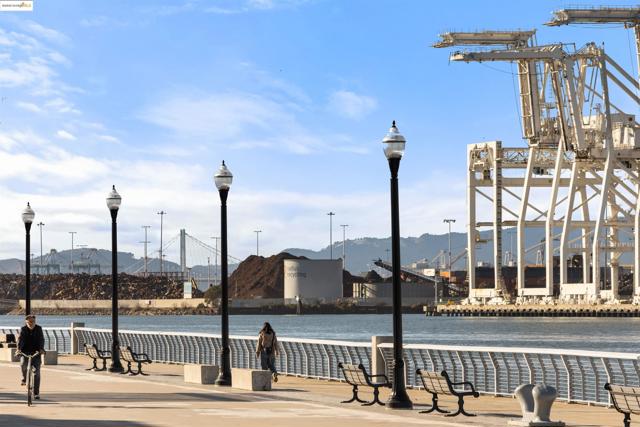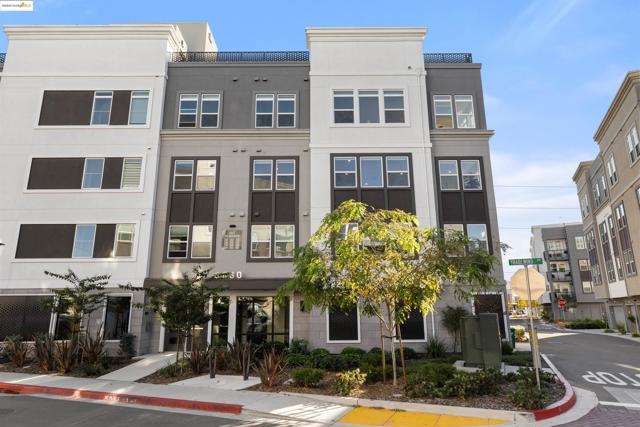 Welcome to this stunning, nearly new, contemporary corner condo in Alameda’s Bay 37 waterfront community, completed in 2023. This two-bedroom, two-bath home features a roomy, open-concept layout, perfect for modern living. The heart of the home is a shining kitchen with a central island, flowing seamlessly into the living room, which is bathed in natural light from sweeping windows. Enjoy a captivating "peek-a-boo" view of Oakland’s Inner Harbor and the distant top of City Hall while dining. For truly panoramic vistas, including the Bay Bridge and downtown San Francisco, residents can enjoy the shared rooftop deck. The home includes many modern conveniences: in-unit laundry, a dedicated garage with EV charging capabilities, and an owned solar system. Bay 37 offers residents an array of amenities, including waterfront walking paths, picnic areas, a park and playground, and a community dock. Commuting is effortless with a complimentary water taxi service to Jack London Square and a free shuttle to the 12th St. Bart Station, providing easy access to SF via ferry or Bart. Plus, neighborhood essentials like Target and Safeway, along with diverse dining options, are all within a half-mile radius!