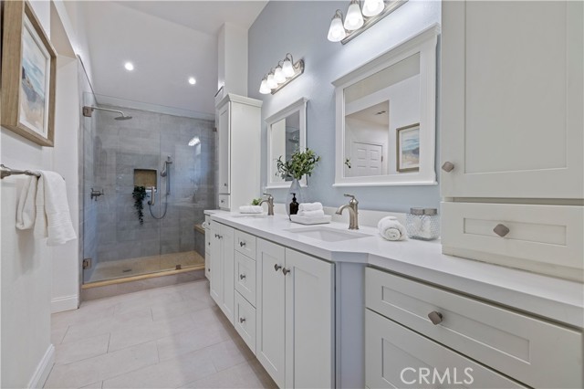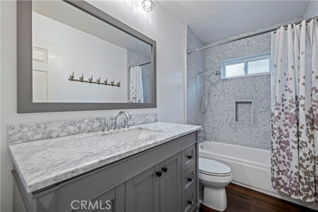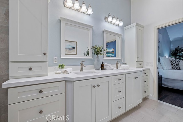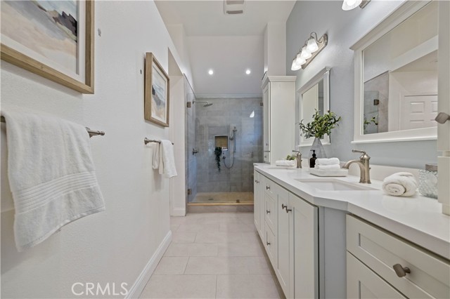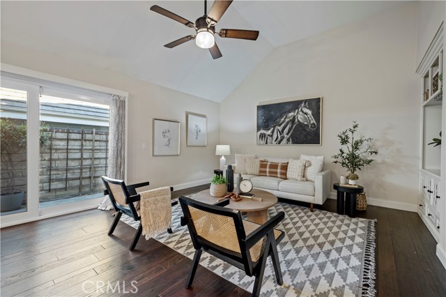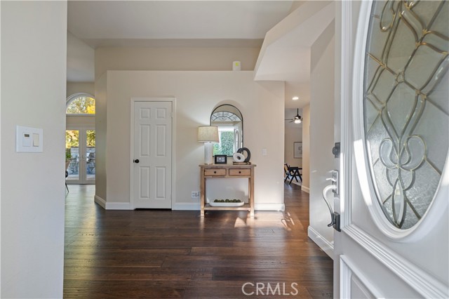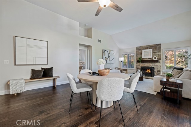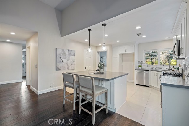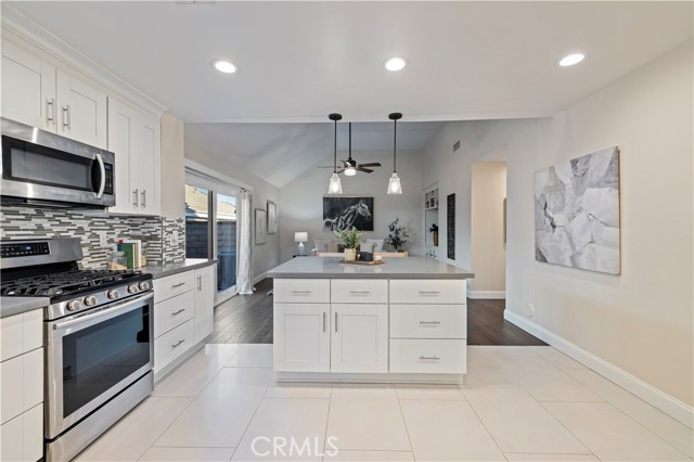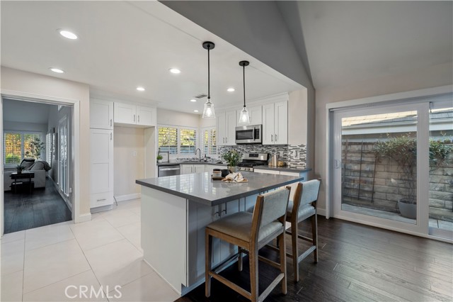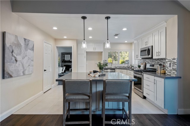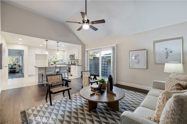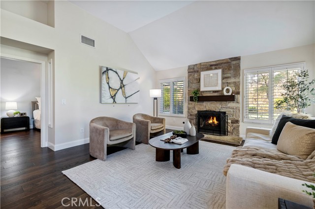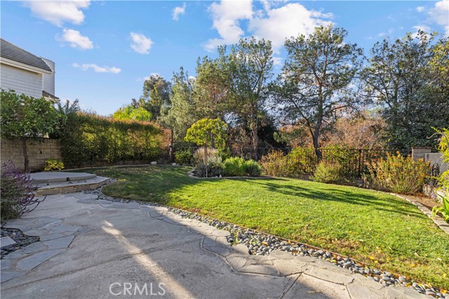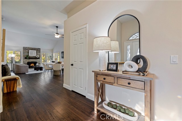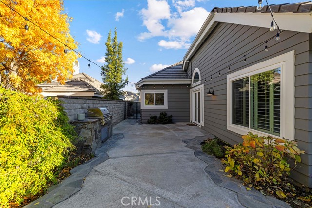 Beautiful, move-in-ready single-story home located on a quiet cul-de-sac in the highly desirable Valencia Summit. This 3-bedroom, 3-bath home features high ceilings, dual-pane windows, and wood flooring throughout. The inviting living room offers a stacked-stone fireplace with a reclaimed wood mantle, while the remodeled kitchen includes a center island with quartz countertops, white cabinetry, stainless steel appliances, recessed lighting, and a walk-in pantry. The primary suite includes backyard access, a dual-vanity bathroom, and a walk-in shower. Two additional bedrooms offer generous space and storage. The private backyard features no rear neighbors, mature trees, an in-ground spa, and a spacious patio. Additional highlights include an indoor laundry room, a two-car garage with a 40 amp/240V EV outlet, and a large insulated attic with lighting and abundant storage. Close to award-winning schools, parks, and trails.