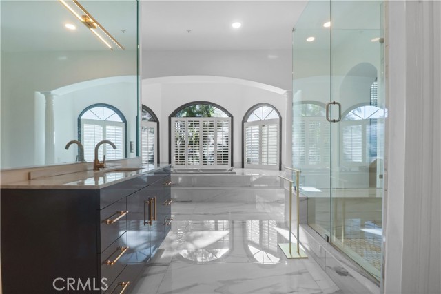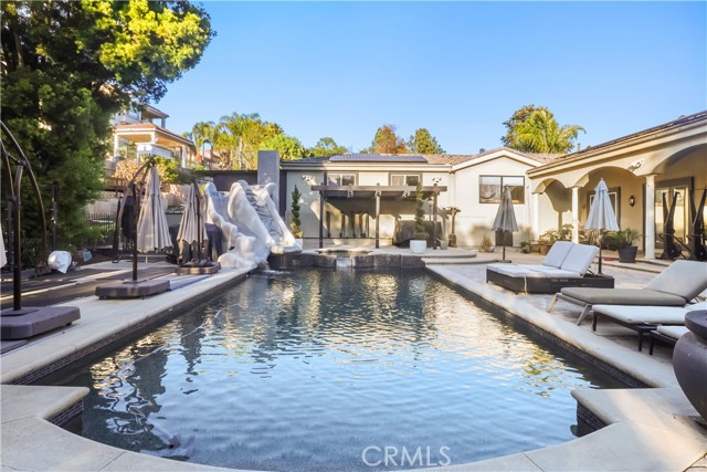 Welcome to this magnificent 5-bedroom, 5-bathroom estate, perfectly situated on a private 1.2798-acre lot bordering Los Angeles and Orange Counties. Surrounded by greenbelts, rolling hills, hiking trails, and parks, this luxurious home offers both tranquility and convenience. The property features a grand circular driveway, a gated entrance, and an expansive 3-car garage for ample parking and storage. Inside, you’ll find an upgraded kitchen with modern appliances and custom cabinetry, and upgraded flooring throughout, adding elegance and warmth to every room. The home also boasts upgraded folding glass doors in the living and family rooms, offering breathtaking golf course views from the balcony. Outdoor amenities include a beautifully landscaped covered patio with custom pavers, a built-in barbecue and sink, a wet bar, and a rock-formed sparkling pool and spa with a water slide. The main part of the house is equipped with a surround sound system, perfect for entertaining both indoors and outdoors. Conveniently located near shopping centers and just minutes away from the 71, 90, and 60 freeways, this estate offers the perfect blend of luxury, comfort, and accessibility.