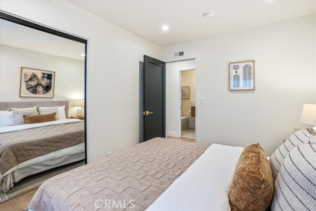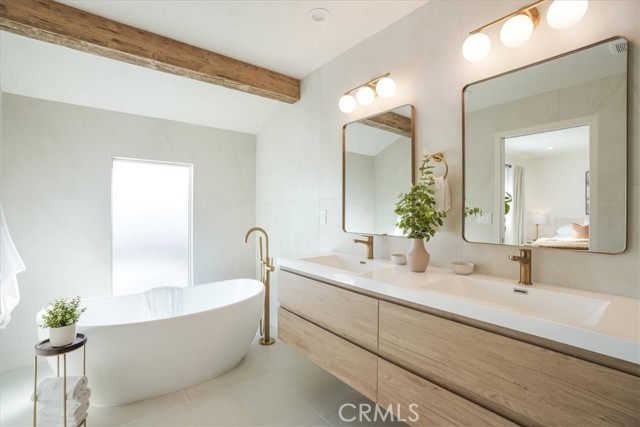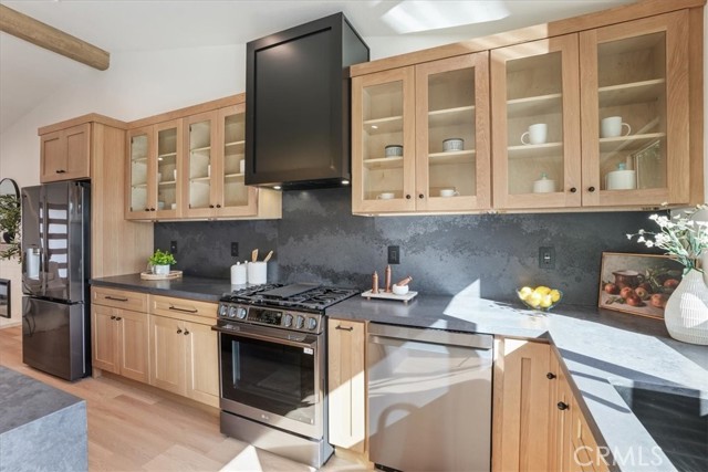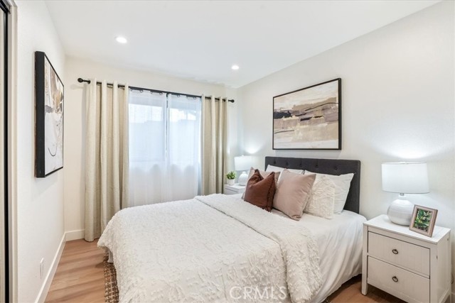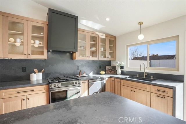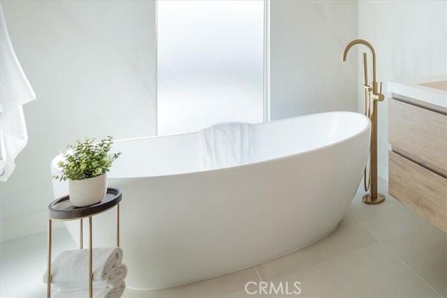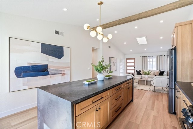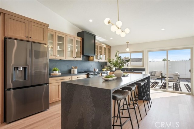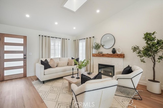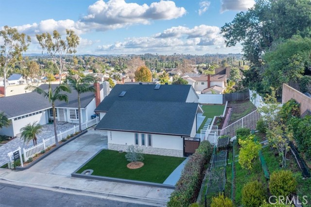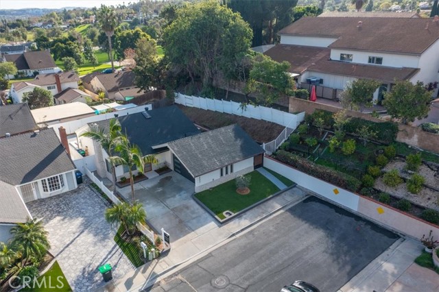 Exquisitely renovated single-level residence tucked at the end of a quiet cul-de-sac on an intimate street of only four homes. This thoughtfully redesigned home showcases a wide-open floorplan filled with natural light and seamless indoor-outdoor flow. Ideally located with easy access to the 5 Freeway, walkable proximity to shopping and dining, and approximately 7–8 miles from the beaches of Laguna Beach. The home has been completely refreshed with new interior and exterior paint, wide-plank luxury vinyl flooring, custom baseboards, new interior doors, and curated recessed lighting throughout. The living area is anchored by a striking electric fireplace with designer tile surround, creating a refined yet inviting atmosphere. At the heart of the home is a stunning chef’s kitchen featuring custom cabinetry, sleek countertops, premium fixtures, brand-new appliances, and an expansive 9-foot island—perfect for entertaining and everyday living. Both bathrooms have been elevated with spa-inspired finishes. The primary suite offers a walk-in shower, freestanding soaking tub, smart bidet toilet, oversized 72” vanity, and elegant wall and floor tile. The guest bathroom mirrors the quality with a new tub, smart bidet toilet, 36” vanity, and designer finishes. Significant system upgrades include a new HVAC system with AC condenser and furnace, new water heater, and a renewed and reconditioned roof with waterproofing and repairs. The garage features a new door and epoxy-coated flooring. Outdoors, the oversized backyard offers serene views, a cemented patio, artificial turf, and a thoughtfully designed garden with fruit trees including grapevines and lime—creating a low-maintenance yet lush retreat. With the large lot, there is ample room for future expansion. This home represents exceptional value with a level of design, finish, and quality rarely found at this price point—an outstanding opportunity for modern coastal-adjacent living.