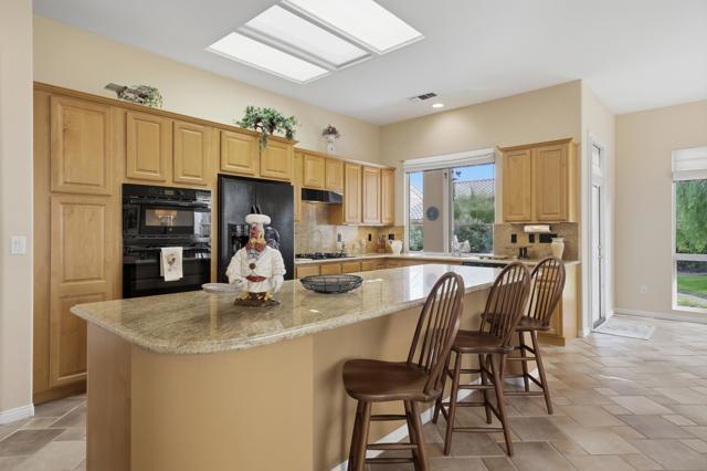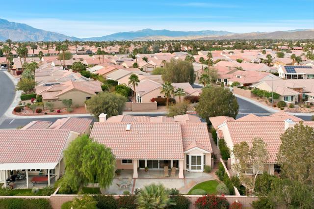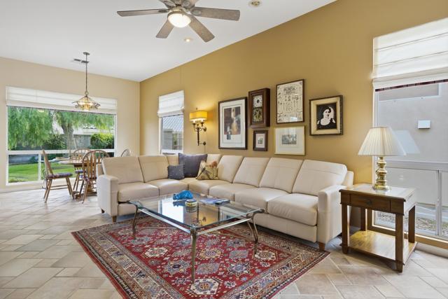 True Pride of Ownership at Sun City Palm Desert! This immaculate Monaco floor plan is 2,323 square feet, with 3 bedrooms and 3 bathrooms. The kitchen has slab granite countertops, oversized island, and is open to the family room. The family room is perfect for entertaining, watching a movie, or just relaxing by the fireplace. The primary suite is spacious and private, with a large walk-in closet, dual sinks, custom seamless shower, and separate jetted bathtub. The attached casita is an enormous guest suite with access out to the entry courtyard. The third bedroom can be used as a guest room or a den/office, with direct access to the guest bathroom. Other features of the home include high ceilings, custom tile work, shutters, central vacuum system, 2 car garage plus golf cart garage. The oversized private backyard faces southeast and offers sun during the early part of the day, and shade in the late afternoon. This home is in move-in ready condition! Sun City Palm Desert is an active 55+ community.