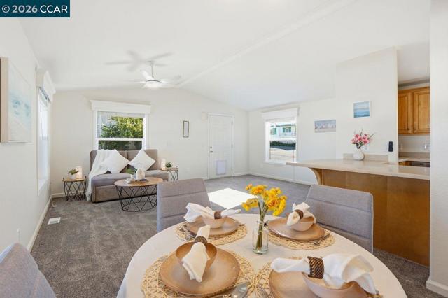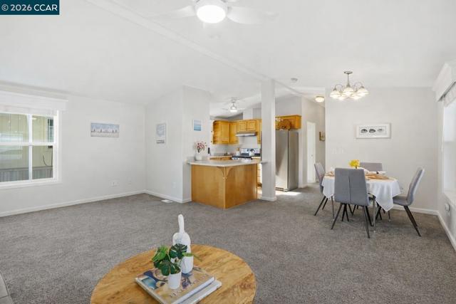 Welcome home to this adorable 2-bedroom, 1.5-bath mobile home that truly checks all the boxes! Immaculate, freshly painted, and filled with natural light, this sun-kissed gem offers effortless living in a quiet, well-kept park with low space rent. The open-concept living area features tall ceilings, dual-pane windows, and ceiling fans that create an airy, inviting feel. The nicely appointed kitchen shines with maple cabinets, stainless steel appliances, and a seamless flow—perfect for everyday living or entertaining. The spacious primary suite offers ample closet space and comfort, while thoughtful touches throughout make this home feel move-in ready. Washer, dryer, refrigerator and storage shed are all included for added convenience. Ideally located just minutes from freeways, shopping, dining, and BART, this home combines comfort, convenience, and value in one charming package. Cute, clean, and easy to love—this is one you don’t want to miss! ???? Fireplaces: NO