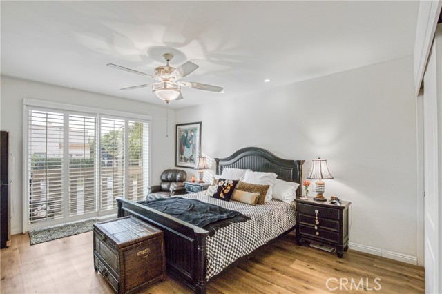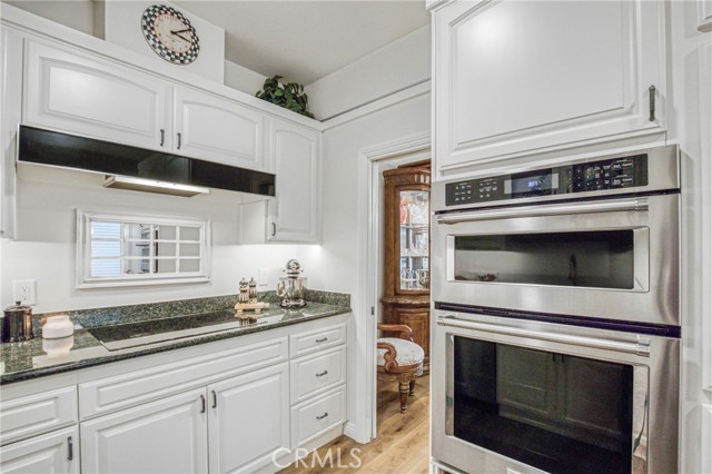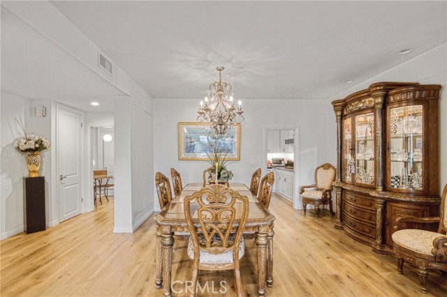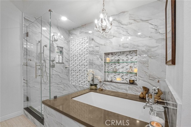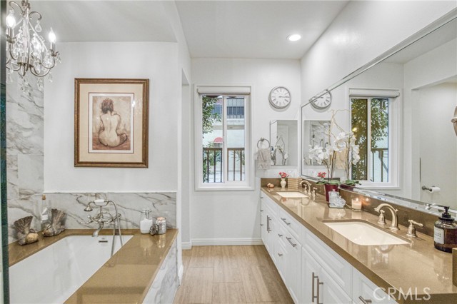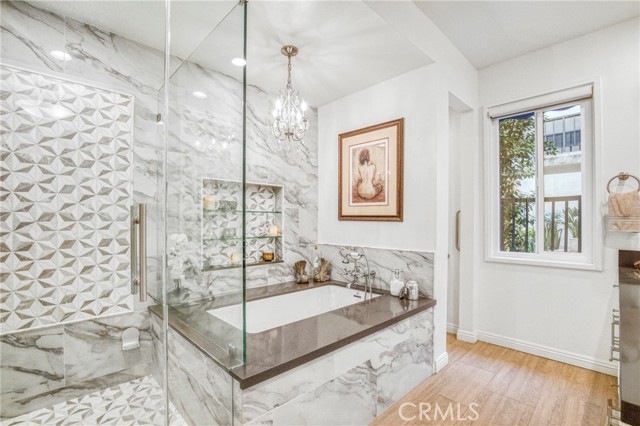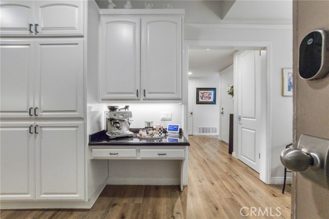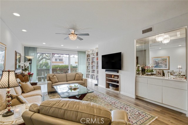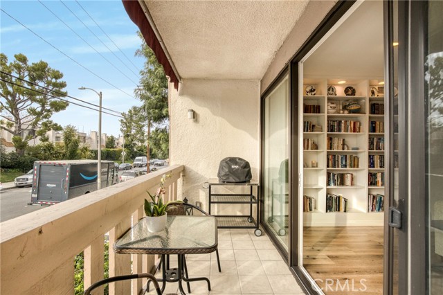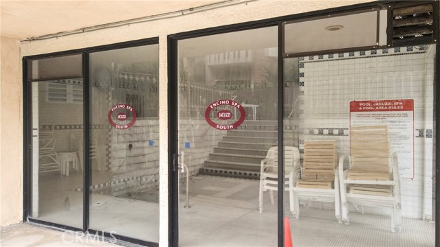 Welcome to Encino Spa South - This beautiful 2 bedroom 2 bath updated condominium is generously sized, west facing, single-story and has only one shared wall. Features include a fabulous granite kitchen with Kitchen-Aid stainless steel appliances, breakfast area, coffee bar or desk area, and a newer stackable washer and dryer unit. Adjacent to the kitchen is a formal dining area that overlooks the living room and opens to the main balcony. The oversized primary suite with balcony is complete with plantation shutters, walk-in closet, large bypass closet, and both closets are equipped with organizers. There is also a floor to ceiling custom cabinet with adjustable shelves. The luxurious primary resort-style bathroom has a deep soaking tub, separate shower, and a custom-made vanity with a quartz counter. The guest bedroom (currently being used as an office) has a large built-in desk area and bookcase. Other special highlights include, LED recessed lighting, rich looking luxury vinyl flooring, custom window treatments in the living room, kitchen, hall and primary bathroom, interior doors that were replaced using precision-measured technology, and all windows and sliding doors were also replaced. The complex has secured parking, meandering walkways, community pool, spas, gym, sauna, rec room and guest parking. The HOA fee covers the maintenance for the amenities, water, reduced internet/cable/phone service and earthquake insurance. The unit has two tandem parking spots in the most convenient location and a private lockable storage cage. The property is conveniently located near major shopping, restaurants, medical and community facilities, public transportation, and freeways.