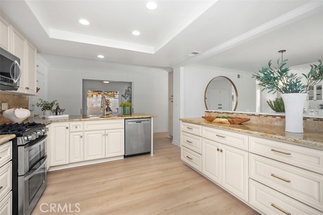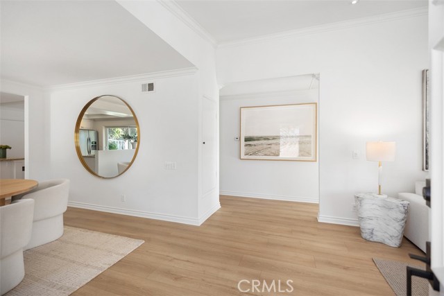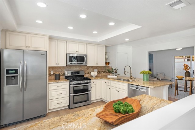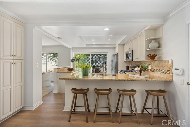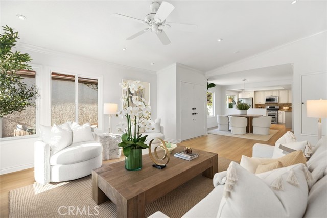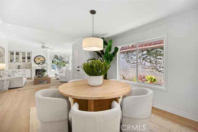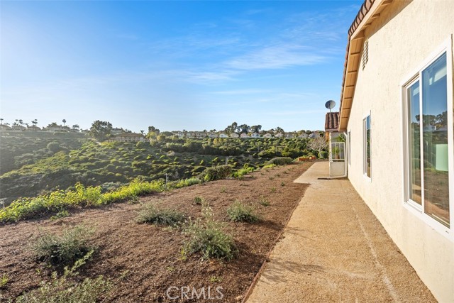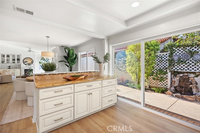 Step into luxury coastal living in the sought-after Flying Clouds at Villa Pacifica community of Laguna Niguel. This exquisitely upgraded single-level home offers 3 bedrooms, 2 baths, and a versatile third bedroom ideal as a home office or guest room, all with stunning unobstructed canyon hillside views and refreshing ocean breezes. Enter through a large, private enclosed courtyard featuring a tranquil fountain and serene hillside views. Double doors welcome you into a bright and spacious living room with vaulted beamed ceilings, abundant natural light, and a cozy gas fireplace—perfect for relaxing or entertaining. The upgraded open-concept kitchen is a showpiece, featuring custom cabinetry, stainless steel appliances, granite countertops, a breakfast bar, modern fixtures, recessed lighting, and direct access to the side yard. With no walls separating the kitchen and dining area, the space flows seamlessly for effortless entertaining and everyday living. Recent enhancements include a new roof, new flooring, fresh interior paint, and energy-efficient double-pane windows. The primary suite boasts vaulted ceilings, expansive canyon views, and generous wardrobe space. Additional highlights include a two-car attached garage with direct access to the kitchen and side yard, plus a private courtyard ideal for morning coffee or evening relaxation. Residents enjoy resort-style amenities including a pool, spa, and clubhouse, all within a quiet and secure neighborhood, just minutes from Badlands Park. This exceptional home embodies the Laguna Niguel lifestyle, offering a perfect blend of elegance, comfort, and coastal charm.