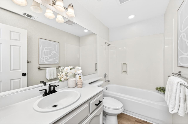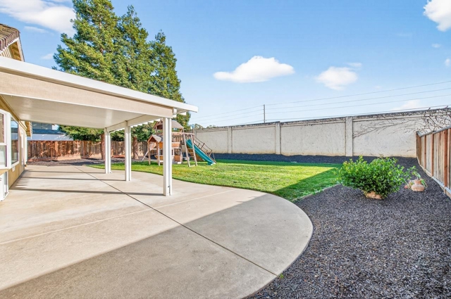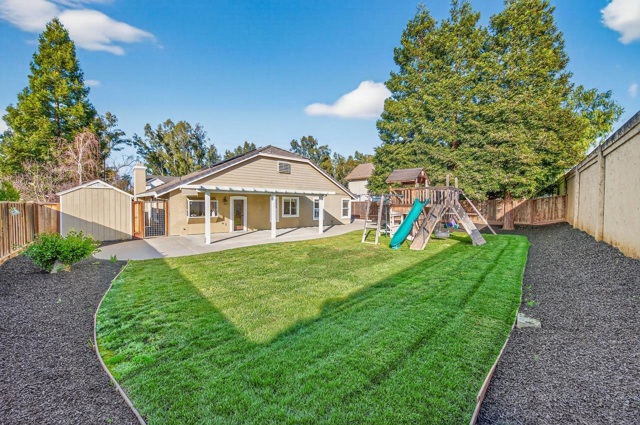 Beautifully updated single-story home in a desirable court location! Turn-key home with recent modern updates!! This 3 bedroom, 2 bathroom home features new flooring through all the living areas, new interior paint, light fixtures and mirrored closets! The updated kitchen shines with stainless appliances, neutral color cabinets, all-new hardware, stone countertops, and a charming bay window that fills the space with natural light. Soaring vaulted ceilings enhance the open feel and brightness of the main living areas. The primary retreat offers dual mirrored closets and luxurious en-suite bath with soaking tub, glass-enclosed shower, double vanity, & private water closet. Gorgeous backyard with a nicely proportioned lawn, fun outdoor play structure, large covered concrete patio with cover, & extra spacious Side Yard Access—ideal RV/Boat parking. Two built-in side-yard sheds for storage & stunning redwood trees! Efficient OWNED SOLAR!!!!