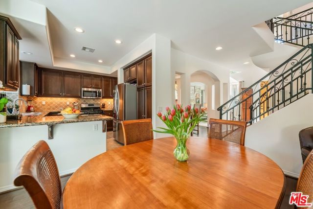 Welcome to 7466 Louise Ave., an elegant, contemporary Mediterranean home in the heart of Lake Balboa. As you enter through a grassy, set-back front yard and into the light & bright interiors, you're greeted by a dramatic formal living room that sets the tone. Soaring two-story ceilings, abundant natural light streaming through oversized windows, arched openings and a Juliet balcony to the home's upper level create a refined yet inviting space. An adjacent formal dining room flows seamlessly into a spacious family room complete with built-in surround sound, and anchored by a gas & wood-burning fireplace. Along with a large gourmet kitchen with quartz countertops and stainless steel appliances. A thoughtfully placed bedroom and full bathroom on the main level provide flexibility as a private guest suite or home office. At the center of the home, a grand staircase with wrought iron railings leads to an upper landing. Off of which you'll find two additional bedrooms with a full Jack-n-Jill style bathroom. And the piece de resistance, a luxurious primary suite with a walk-in closet and a beautifully appointed en-suite bathroom, creating a calm and restorative escape from the day. Enjoy the property's private, hedged-in yard, where you can spend evenings around the outdoor gas fire pit or unwind in the 45-jet Caldera Palatino hot tub spa. Other features include an oversized two-car garage with generous storage space, and a 30-amp EV charger. Smart-home additions include a Honeywell smart thermostat, a six-zone indoor/outdoor sprinkler controller, wiring for Ethernet, telephone, cable, and a security system, and 17 Tesla solar panels under a transferable lease. Centrally located, this home offers the best of suburban tranquility with exceptional walkability. Starbucks, Humble Bee Caf, Ralphs, and a variety of dining and shopping options are a five-minute walk away, while a five-minute drive brings you to the largest park in the Valley, home to the namesake Lake Balboa, swan boats, Japanese Gardens, fishing, miles of cycling paths, three golf courses, and endless outdoor recreation. Come experience refined comforts and an unbeatable location in one of the Valley's most central and desirable neighborhoods today.