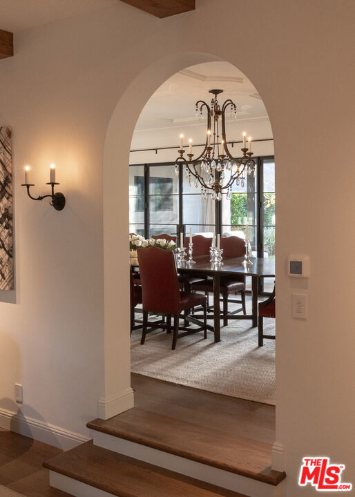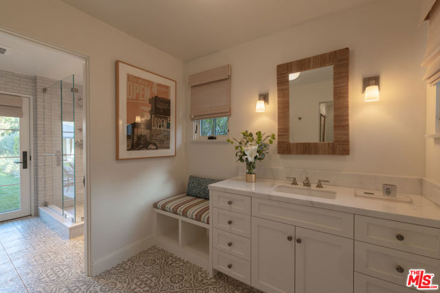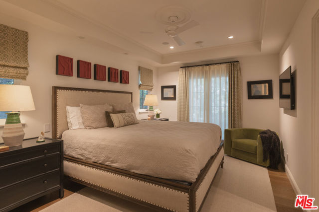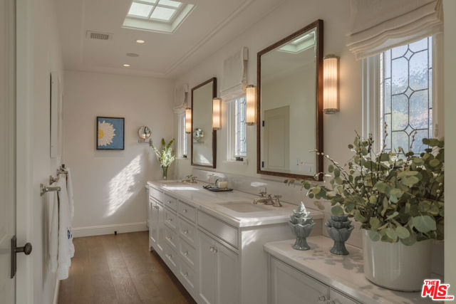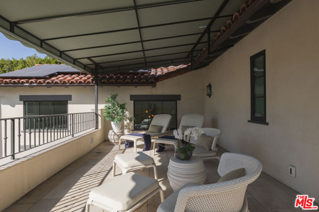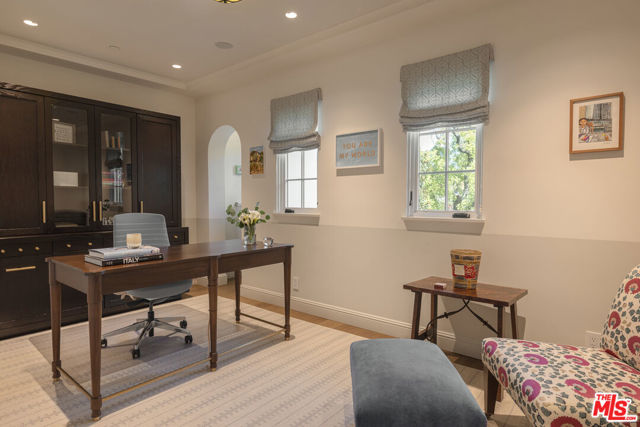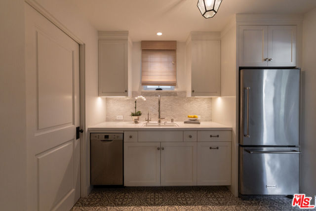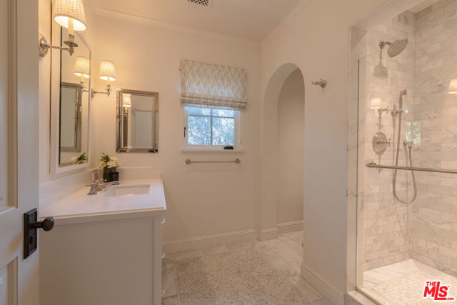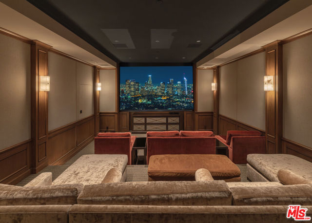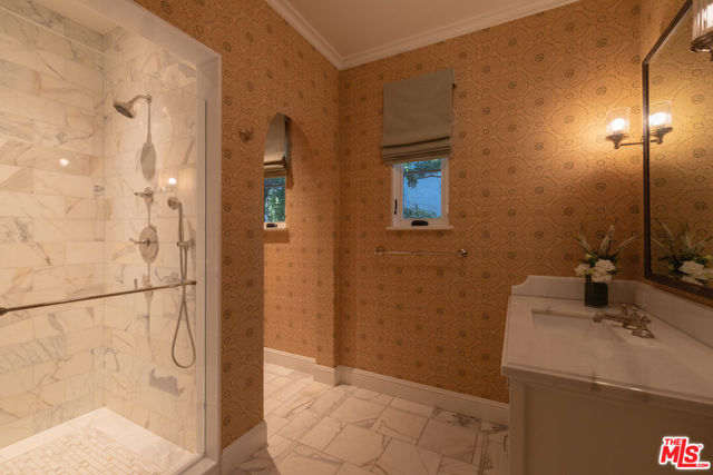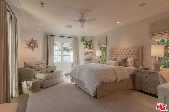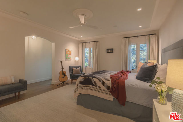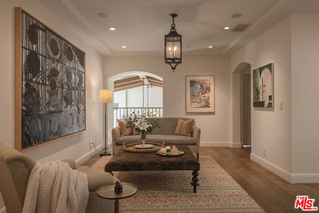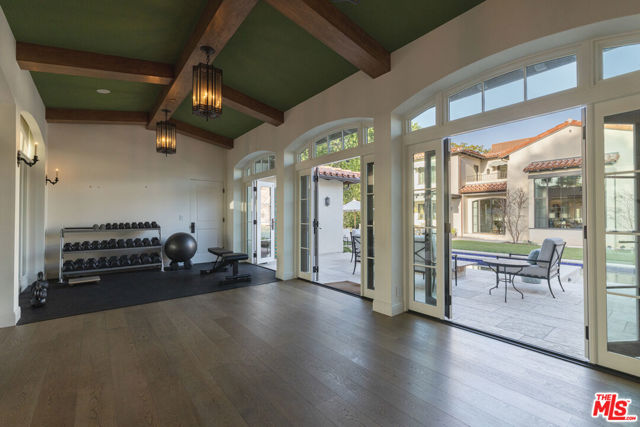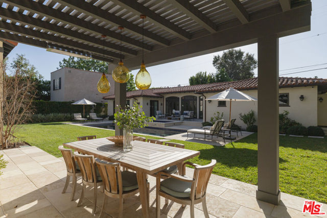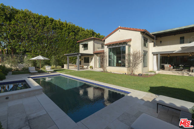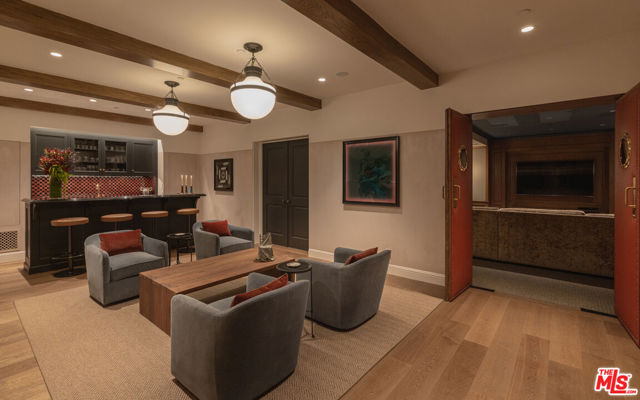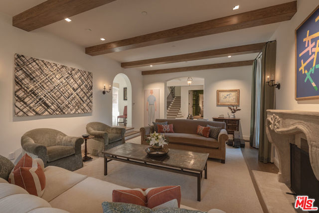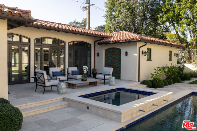 The coveted address is only the beginning of the story. Completed in early 2020, this 1926 Spanish estate underwent a comprehensive, design-forward renovation, including the addition of nearly 3,500 square feet, transforming a lovely residence into a contemporary masterpiece. The soul and character of the original home remain intact, while the aesthetics, infrastructure, and systems have been thoughtfully renewed to deliver every modern luxury and convenience. Design details include herringbone patterned European Oak flooring, wood beamed and finished ceilings, contemporary hand forged wrought iron stairwell bannisters, and perfectly balanced marble and moroccan tile accents, The entry level welcomes you with a warm foyer featuring harlequin-patterned honed marble flooring, leading to gracious formal living and dining rooms. The home's heart is the expansive family room, highlighted by double height beamed ceilings with dual iron chandeliers, opening to the center-island kitchen, supported by a dining area, walk-in pantry, mudroom, and butler's pantry. A main-level library sits adjacent to an en-suite bedroom, perfectly suited for a guest or in-law suite. There is also a powder room for the service of guests. Ascend the staircase to a gracious landing with a Juliet balcony overlooking the family room below. The primary suite is a private retreat, offering a separate office, generous dressing room, and a beautifully appointed bath with a large balcony. Two additional en-suite bedrooms, ample storage, and a generous laundry room complete the upper level. The newly added lower level is designed for relaxation and entertaining, featuring a lounge with a Moroccan tileadorned bar, luxe home theater, meditation room offering great flex space, and powder room. The nearly 1,000 s.f. guest house includes an open living area currently outfitted for as a gym, an en-suite bedroom, kitchenette, and a small laundry area. Outdoor living is equally exceptional, with covered heated patios, fireplace, built-in barbecue area, pool and spa, and an outdoor shower. With countless design details and infrastructure upgrades throughout, this is a rare, turnkey opportunity on what most regard as the best street in The Beverly Hills flats.