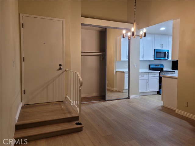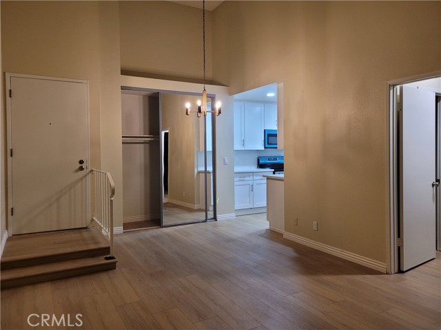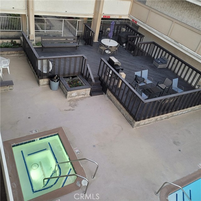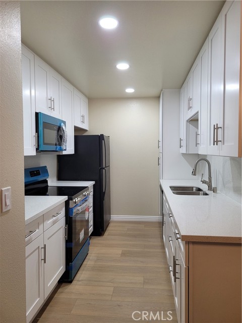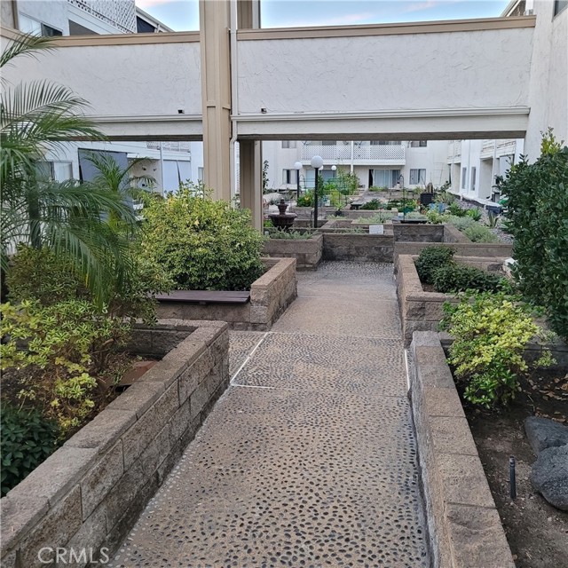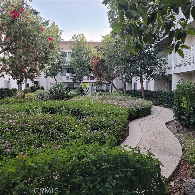 Top-floor 1-bedroom Lindenwood condominium located in the highly desirable Bixby Knolls neighborhood. This light-filled home features high ceilings in both the living room and bedroom, creating an open and airy atmosphere. The updated kitchen is beautifully appointed with recessed lighting, quartz countertops and backsplash, stainless steel appliances, and crisp white shaker cabinetry. New vinyl flooring runs throughout the unit, adding a modern and cohesive touch. Two spacious closets provide generous storage. Enjoy your private balcony overlooking the serene, landscaped interior courtyard — a perfect setting for morning coffee or evening relaxation. Conveniently situated just steps from the elevator, trash chute, and community laundry room. The unit includes one secured ground-level parking space. Lindenwood residents enjoy a variety of well maintained amenities including two elevators, a recreation room, sparkling pool and spa, BBQ area, and lushly landscaped courtyard.