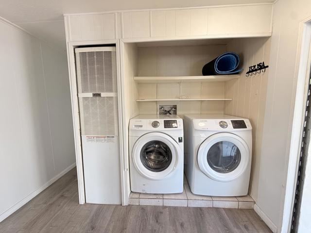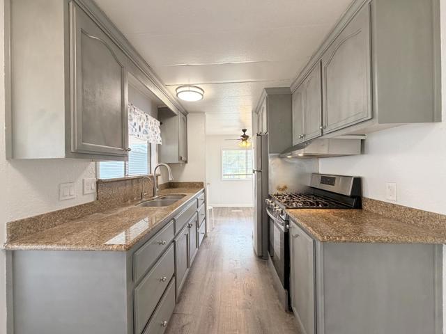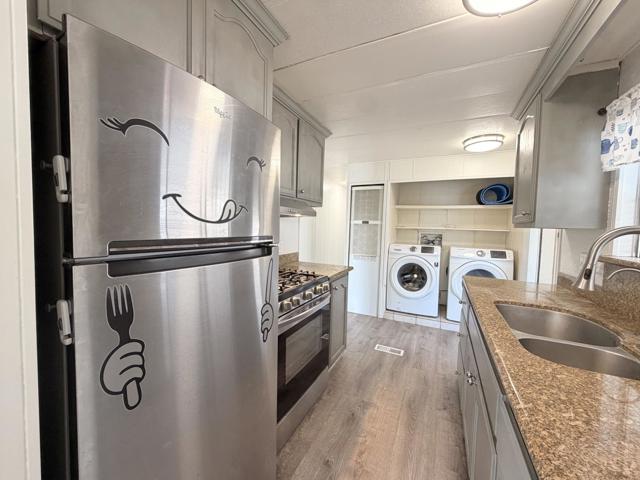 Charming and well-maintained home ideal for first-time buyers, newlyweds, or a small family. This residence offers 2 bedrooms and 2 bathrooms with a functional and comfortable layout. The living room and bedrooms feature durable laminate flooring, while the kitchen is appointed with ample cabinetry, and granite countertops. The primary bathroom has been upgraded, providing a fresh and modern feel. Central A/C was installed in 2024 for year-round comfort. Dedicated laundry area includes washer and dryer. Located directly in front of a beautiful paseo walkway, perfect for daily walks and outdoor enjoyment. Situated in a quiet and friendly mobilehome community with convenient daytime street parking available from 6:00 AM to 10:00 PM. Community amenities include a clubhouse, exercise room, swimming pool, hot tub, sauna, and billiard room. Low space rent of $1,183 per month. Great opportunity for comfortable living with excellent community features.