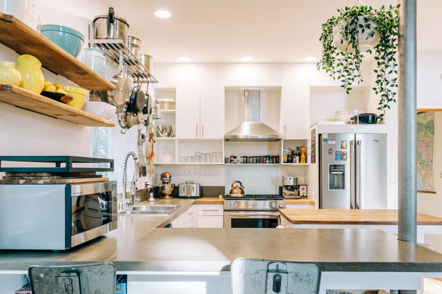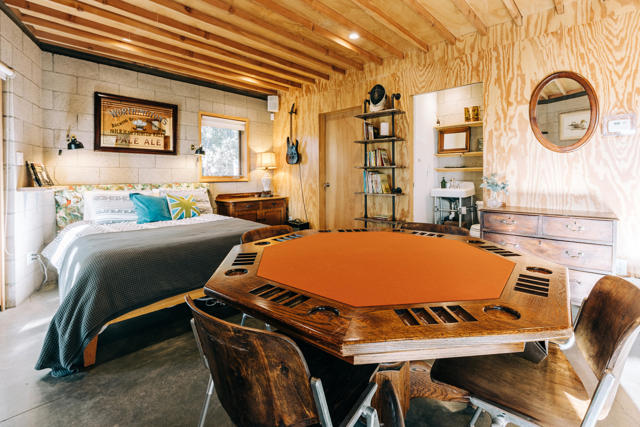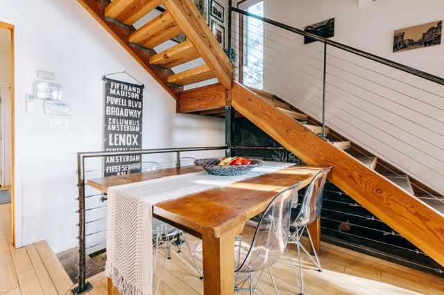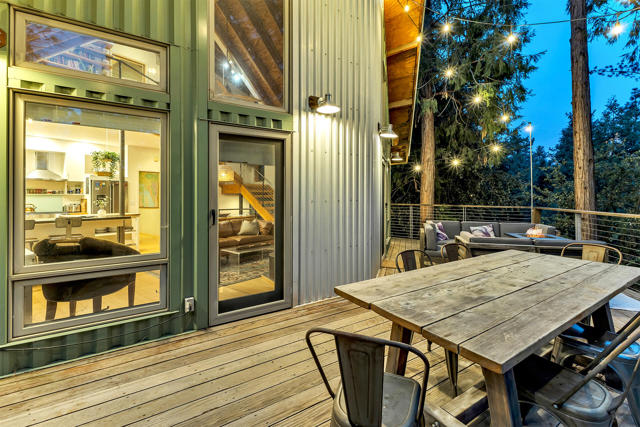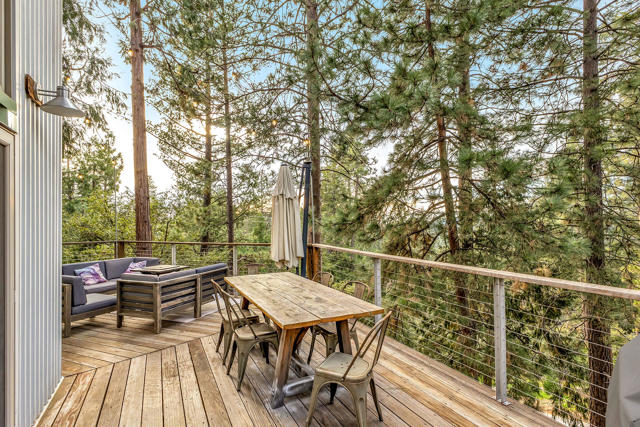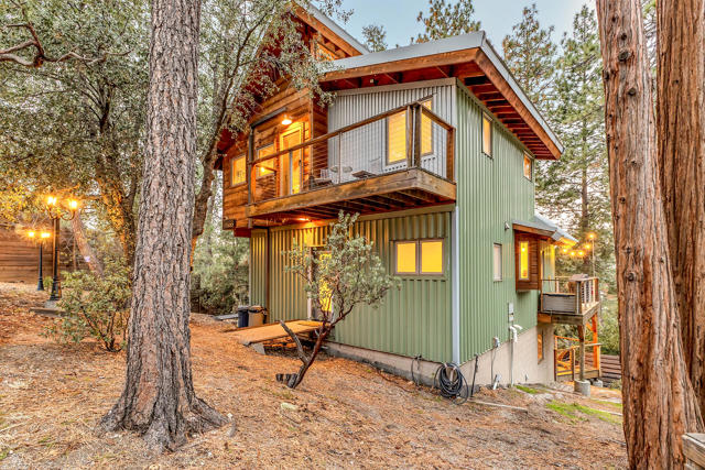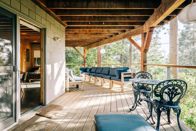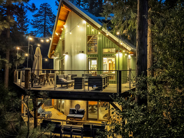 Tucked among the pines, this updated A-frame blends an industrial edge with rustic mountain charm. Vaulted ceilings with exposed wood beams soar above an open-concept living space anchored by a freestanding wood stove and warmed by heated floors. The bright, modern kitchen with breakfast bar flows effortlessly to the open living area. The spacious deck was designed for sunset views and easy entertaining. A dedicated mud room adds everyday function & the main level also offers a comfortable bedroom and full bath, ideal for guests or single-level living. Upstairs, a private bedroom suite features its own bath and deck for treetop morning coffee. The lower level includes a third bedroom with covered deck access, an additional bath, laundry, and ample storage. Mini splits provide efficient year-round comfort. Outside, unwind in the hot tub under the stars or gather with friends on the expansive deck. Additional amenities include: Generac generator, low maintenance siding, parking on Crestview and off of Live Oak, near hiking trails and within minutes of the artsy town of Idyllwild. Cozy yet refined, this mountain retreat delivers style, space, and that perfect Idyllwild getaway vibe!