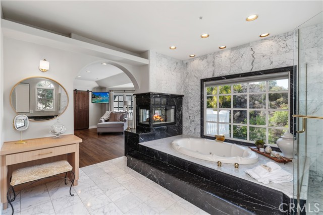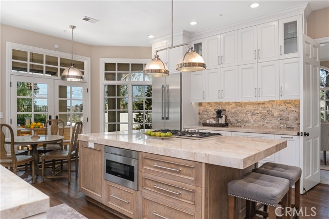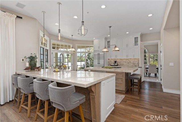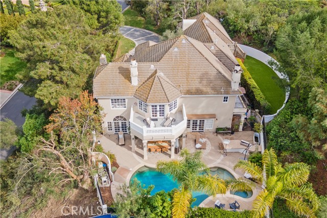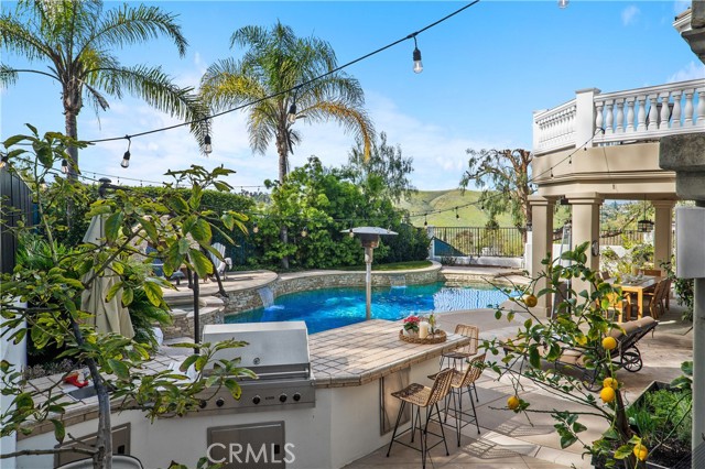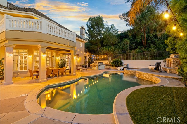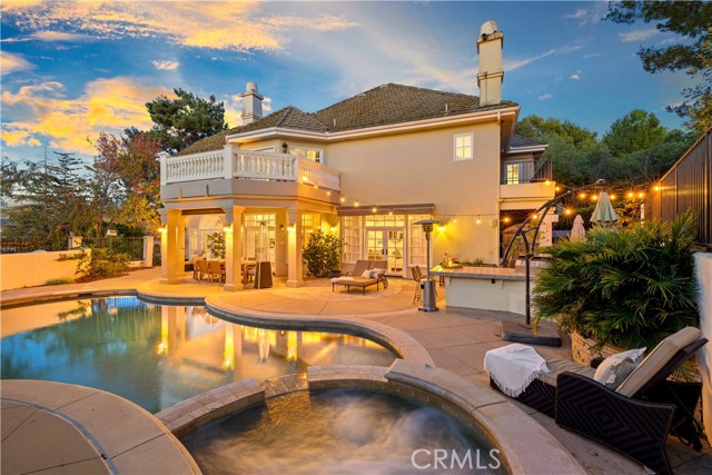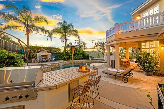 Impressive and secluded this Hunt Club secluded view home offers approximately 5,644 square feet of upgraded 'livable' living space with five bedrooms and four and a half bathrooms to include a bright custom downstairs office and spacious great room that wraps to a Newly Turfed side yard! With over an acre in property, this home offers privacy and an elegant timeless architectural design that includes an inviting entryway with impressive, coffered ceilings, dramatic staircase and an illuminating crystal chandelier. The long driveway provides ample parking for multiple cars while the backyard offers you an intimate and peaceful sunset setting! Enjoy a backyard boasting tranquil saltwater pool, spa, stone fireplace, and built-in BBQ surrounded by lush tropical landscaping and hillside views! The backyard also features a covered outdoor living area, perfect for ‘al fresco’ dining and entertaining guests. Inside, the home offers an abundance of natural light, complemented by charming architectural details. Professionally designed and gourmet inspired kitchen has been gorgeously remodeled in recent years with sophisticated soft tones, featuring Taj Mahal countertops, custom cabinetry, upgraded Thermador appliances and dual ovens, creating an exceptional cooking and entertaining space. Stone tile back splashes and accents adorn the kitchen with a large island, extensive counter area with wine refrigerator and drawer microwave. From kitchen to family room the flow is seamless and an inviting marble fireplace which creates a large setting for entertaining and family gatherings. Sunken living room- ONLY ONE STEP DOWN IN ENTIRE HOME- is a cozy retreat off entry and has a marble fireplace centered with coffered ceilings. Downstairs bedroom with an ensuite is perfect for in-laws or guests for added living flexibility! Primary bedroom is spacious with tall ceilings & a deck that captures sunsets and canyon views! The spa-like suite has Carrera white/black marble shower and tub plus newer cabinetry and black matte marble countertops. Three more en-suited bedrooms encompass the upstairs that also anchors a spacious great room & wet bar that has wraps around a side deck, large turf area to the backyard! The Hunt Club is a guard gated equestrian community that is close to downtown San Juan Capistrano with restaurants/shopping galore. Moments from Dana Pt Harbor & Doheny Bch. Blue Ribbon public schools and well-known private schools of St Margaret's & JSerra are nearby.