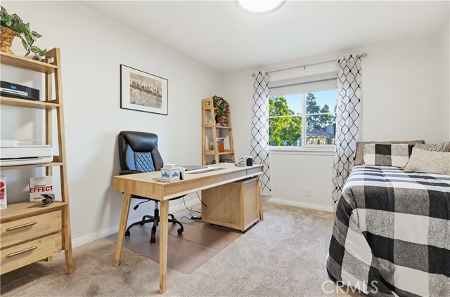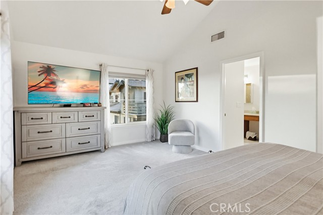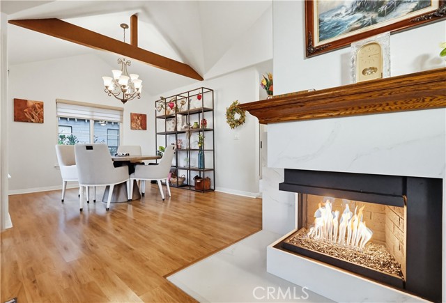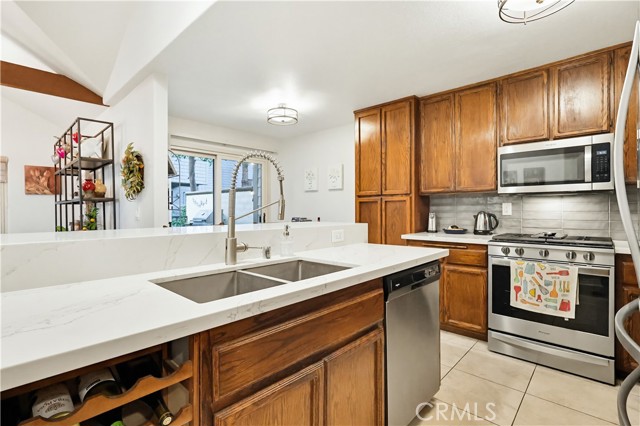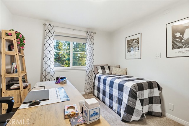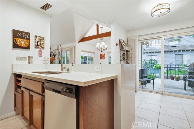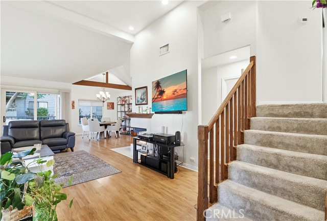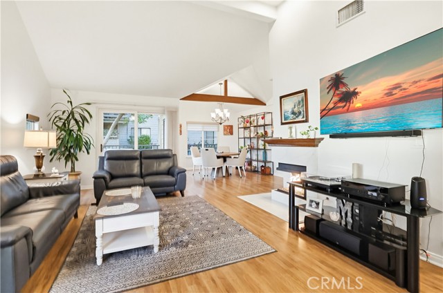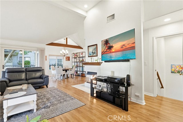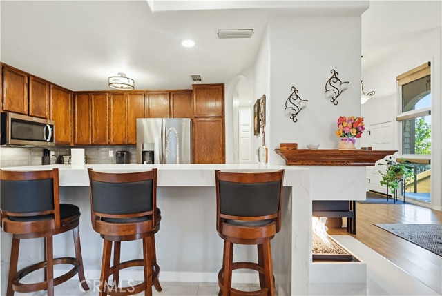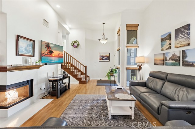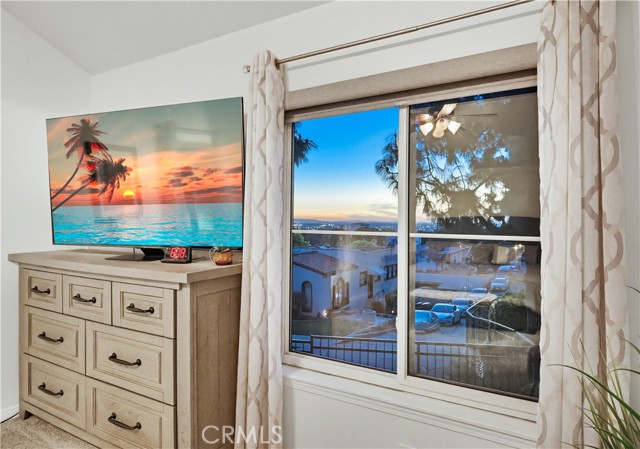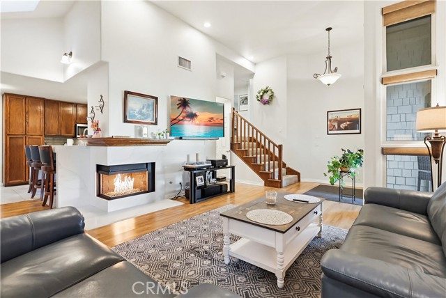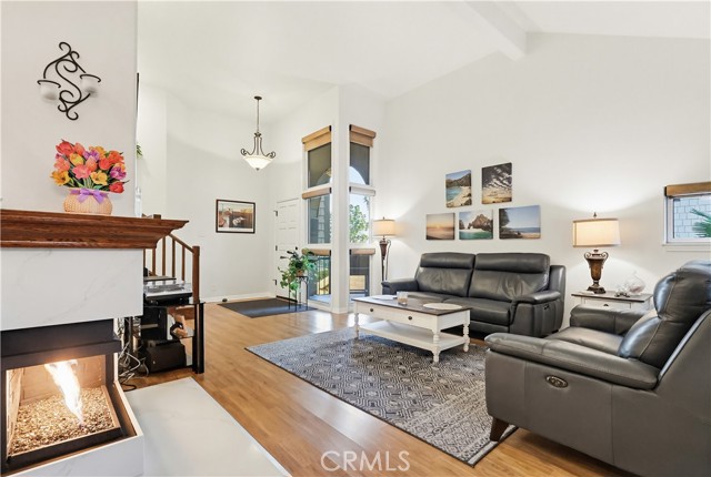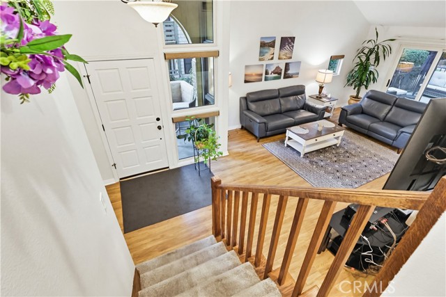 Welcome home to this warm and inviting 2 bedroom, 2 bathroom split-level view home, offering 1,356 square feet of thoughtfully designed living space in a beautifully maintained gated community — an exceptional opportunity in today’s market. Cathedral ceilings in both the living room and primary bedroom create an airy, light-filled atmosphere, while the west-facing orientation delivers stunning sunset and sparkling city light views each evening. The living room centers around a cozy gas fireplace with modern glass rock accents — the perfect place to unwind as the sky changes colors. The updated kitchen features quartz countertops, stainless steel appliances, custom window coverings, and tile flooring. Wood floors add warmth throughout the main living areas, with soft carpet in the bedrooms for added comfort. The spacious primary suite offers a relaxing retreat with a Jacuzzi soaking tub and separate walk-in shower. A second full bathroom provides flexibility for guests or family. Enjoy indoor laundry and a 2-car attached garage with additional storage. The full-size private patio (no balcony) includes a gate with easy access to the pool and walkway — ideal for convenient outdoor living. Surrounded by mature pine trees and beautifully landscaped grounds with soft evening lighting, the gated community feels like a peaceful mountain resort. Residents enjoy a sparkling pool, two hot tubs, ample visitor parking, and nightly security patrol service. Comfort, views, location, and value — all in one.