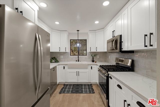 Nestled on a quiet, tree-lined street in the heart of Santa Monica, this beautifully reimagined 2-bedroom, 2.5-bath townhouse blends modern sophistication with timeless coastal charm. Located in an intimate 6-unit building with secure, side-by-side parking, this turnkey residence offers effortless living just minutes from the beach. The main level welcomes you with an open-concept layout that seamlessly connects the living and dining areas to a stylish, contemporary kitchen featuring all new stainless steel appliances, designer tile backsplash, and warm, daylight-inspired lighting. Sliding doors off the living room open to a private patio, perfect for indoor-outdoor living and relaxed evenings at home. A chic powder room adds functionality and flair, ideal for guests and everyday living. Upstairs, two spacious bedrooms each feature their own thoughtfully designed ensuite bathrooms, while a skylight above the hallway bathes the upper floor in natural light, creating an airy ambiance. The convenience of in-unit laundry completes this thoughtfully updated home. With nothing left to do but move in and start enjoying the Santa Monica lifestyle, 1807 10th Street #4 is a rare opportunity to own a low-maintenance, design-forward home in one of L.A.'s most coveted coastal communities. Whether it's morning coffee at Layla Bagels, sunset sips at Bodega Wine Bar, or weekend rides along the oceanfront, your perfect Westside retreat awaits.
