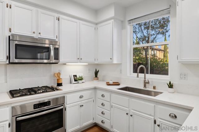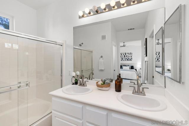Experience a stylish, remodeled townhome with dual primary suites in the Monaco community of Torrey Highlands. Inside, luxury vinyl plank flooring flows throughout, complemented by ceiling fans in every room. The updated kitchen features quartz countertops and stainless steel appliances, while refreshed bathrooms modern fixtures. With no neighbors behind, enjoy a private yard with pavers and turf—perfect for relaxing or entertaining. Close to freeways, top schools, shops, and dining, this home blends comfort and convenience.