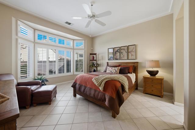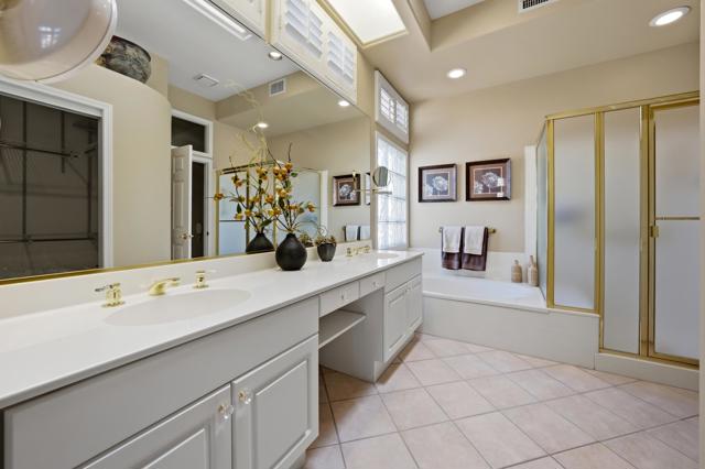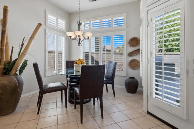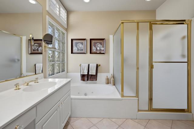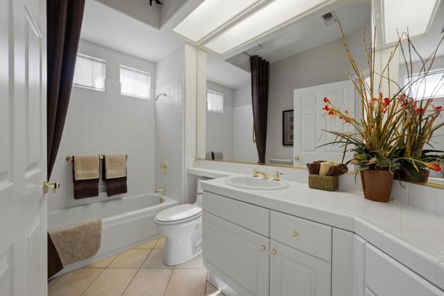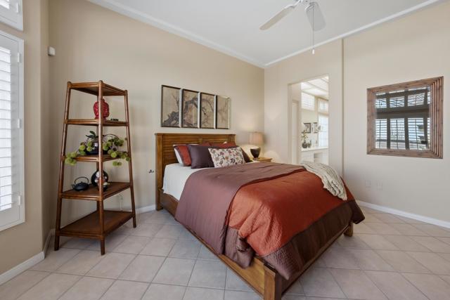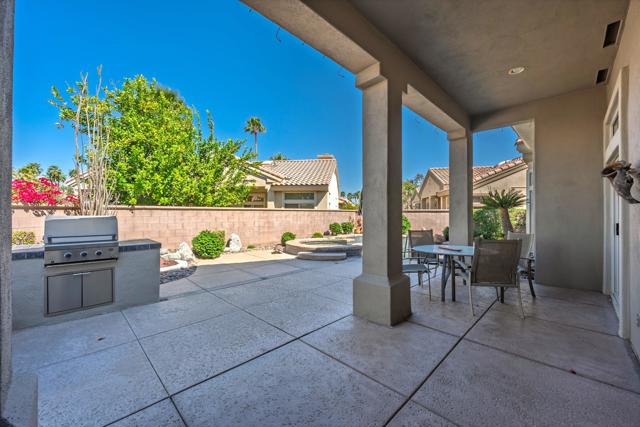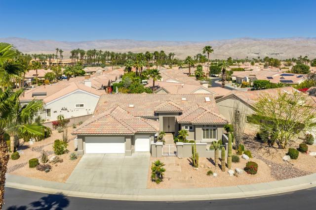 Sun City Palm Desert - Emerald. Ideally located near the Mountain View Clubhouse, this estate-model home sits on a one-of-a-kind oversized pie-shaped yard that provides an open and spacious fee and is in better condition than the day it was built. The north-facing rear yard is designed for resort-style outdoor living with a pebbletec pool with cascading spillover spa, gas fire pit, barbecue island and generous patio space for relaxing or entertaining. Exceptional curb appeal is highlighted by a gated front courtyard, double-door entry, updated paint scheme and salt-finished hardscape. Offered furnished. Inside, diagonally laid tile flooring runs throughout. The foyer and greatroom feature dramatic 12-foot coffered ceilings with uplighting, creating a light and open environment. Shutters are used throughout the home. The spacious kitchen has corian counters, a chef's island with breakfast bar, skylight, raised panel cabinetry with pullout shelves, and stainless appliances including Viking and Sub-Zero. The adjacent family room features a custom built-in media center. The primary suite has a bay window and a large walk-in closet with mirrored wardrobe doors. The primary bathroom includes dual sinks, a sitting vanity, skylight, stall shower with textured glass doors and an oversized spa tub with cultured marble surfaces. The guest suite also has mirrored wardrobe doors and an ensuite bathroom with shower/tub and tile surrounds. The guest bedroom includes a custom built-in desk and shelving along with French doors that open to the front courtyard. Additional features include a laundry room with utility sink and extensive cabinetry, a 2+ golf cart garage with abundant built-in storage, dual American Standard A/C systems new in 2017 and a 50-gallon water heater installed in 2016. This beautifully maintained home combines space, quality and an outstanding location within Sun City Palm Desert.