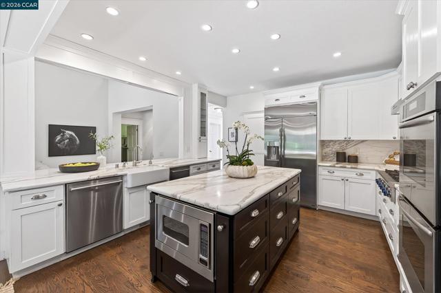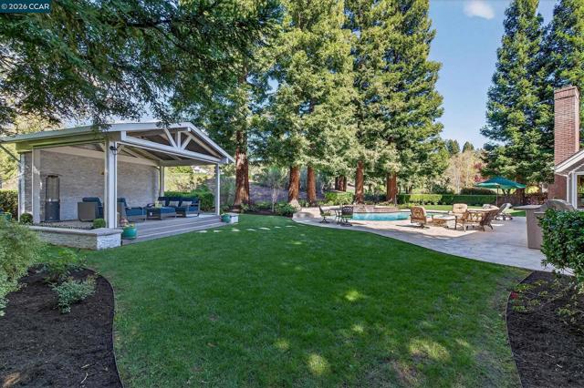 Standout Home in Blackhawk designed by Dahlin Group Multiple French doors and welcoming wraparound porch set the tone for this iconic home with timeless character. Enjoy hardwood floors, extensive molding & decorator features Remodeled kitchen w/gorgeous marble counters, island, & pantry, opens seamlessly to family room, wet bar & private backyard. The downstairs includes an oversized office that could easily convert to a bedroom, along w/1.5 bathrooms. Upstairs: 4 oversized bedrooms, including an impressive primary suite, three bathrooms, built in desks, & 3 spacious turrets showcasing sweeping 360-degree views. The primary bathroom is beautifully appointed with marble flooring, a large separate shower, soaking tub, & more Situated on nearly ½ acre, the flat backyard is designed for year-round enjoyment. Beautiful Pergola w/stone and remote shades creates an exceptional outdoor living space. The yard also offers a refreshing pool, built-in BBQ & firepit Recent upgrades include: new roof, gutters, solar panels, garage doors, epoxy flooring, remodeled landscaping front & back, pavilion, etc. Open Sat & Sun 1:30 - 4:30 360 tour: https://www.zillow.com/view-imx/f82c4518-9779-4185-9455-bdbf9d26f846?setAttribution=mls&wl=true&initialViewType=pano&utm_source=dashboard