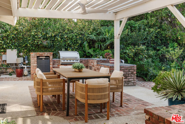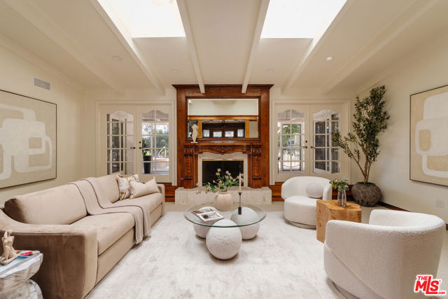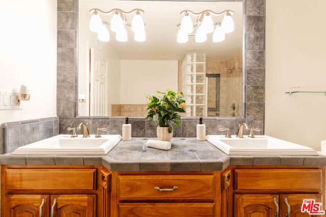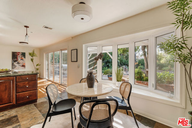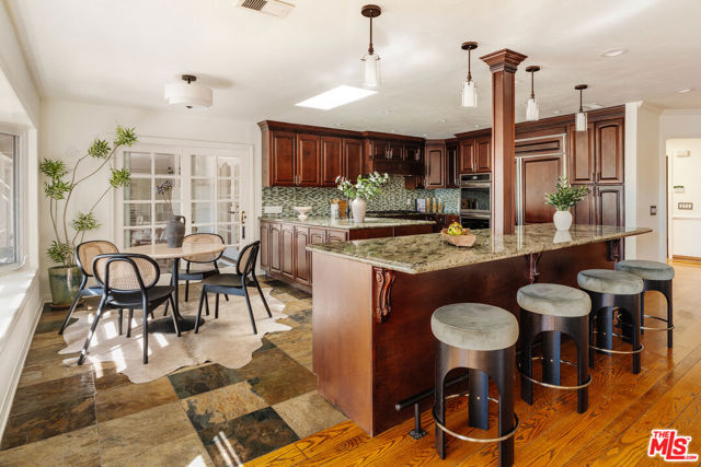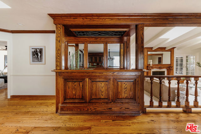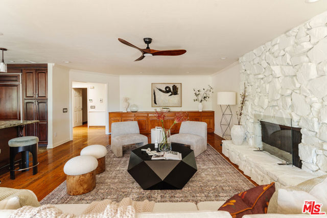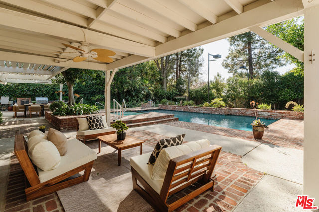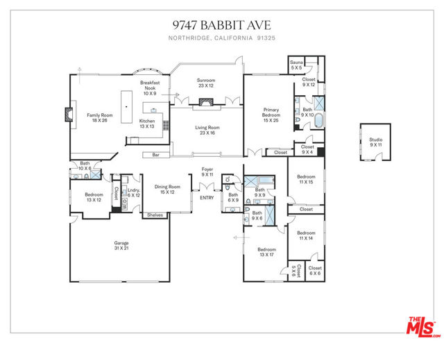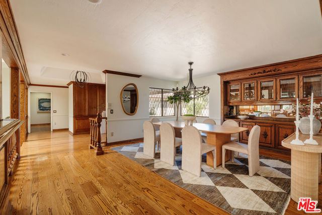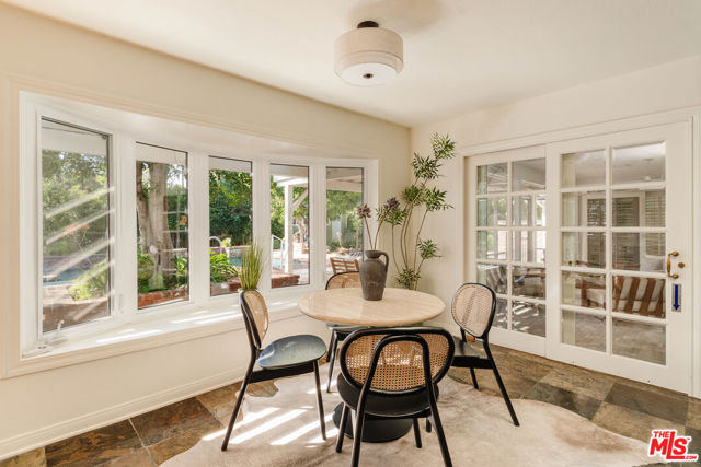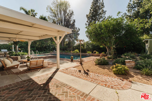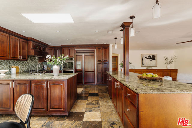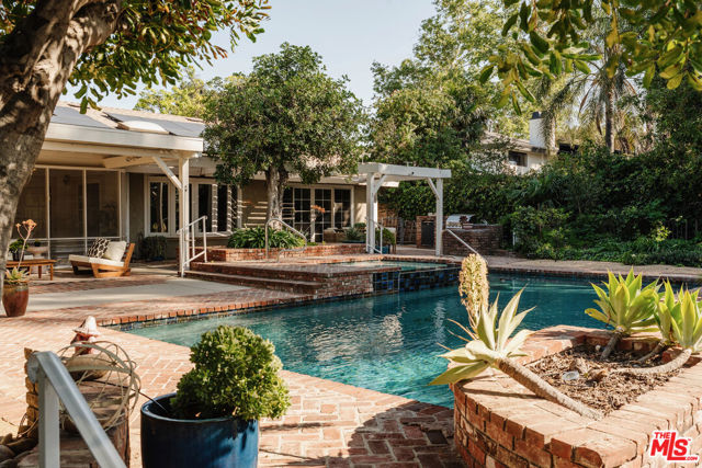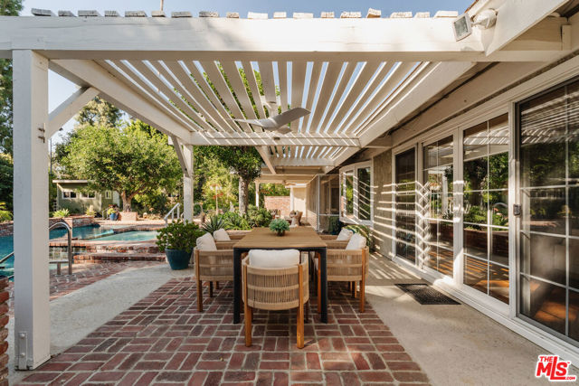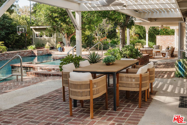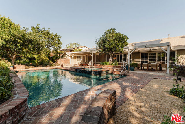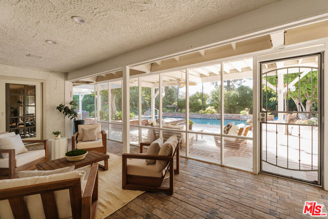 Imagine life in this stunning estate set on a rare double cul-de-sac! A gated courtyard guides guests toward the dramatic glass-inlaid entry of this sprawling one-story home, where rich woodwork frames the foyer and refined dining alcove. The adjacent pub-style bar glows beneath stained glass, an inviting spot for conversation or preparing your favorite cocktail. The sunken living room's elegant fireplace is illuminated by a pair of skylights and flanked by French doors that open into a screened in sunroom filled with natural light. Hardwood flooring, recessed lights, and crown molding enrich the expansive family room, where a striking fireplace and glass doors create a seamless connection to the outdoors. Your kitchen blends style and function with handsome cabinetry, ample counter space, and a multi-seat island. Retreat to the impressive primary suite and rejuvenate within its sauna, dual dressing areas, and ensuite's soaking tub. Outside, your entertainer's backyard feels like a resort with drought-tolerant California native plants and citrus trees, too, including a perfect spot to start your vegetable garden. The yard also features a built-in grill, a sparkling pool and spa, and a pickleball/basketball court! A detached shed becomes an ideal remote office and a fabulous attached 3-car garage, too! Paid-off solar panels add everyday practicality, and other notables include the 2-year-old roof. You're only moments from CSUN, CA-118, I-405, Northridge Fashion Center, and a wide selection of fabulous restaurants. Come experience a residence where entertaining and comfort come together effortlessly!