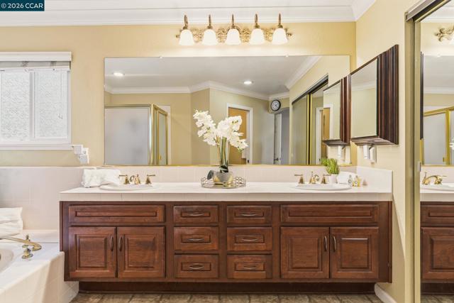 Welcome to this stunning Deer Ridge residence offering five full bedrooms plus a versatile bonus room, set on an expansive quarter-acre lot designed for both everyday comfort and exceptional entertaining. Backyard is a true private retreat featuring a sparkling solar-heated pool, basketball area, pergola, outdoor BBQ, and a spacious grassy play area—all surrounded by mature trees creating a serene, park-like setting. Dramatic entry to soaring vaulted ceilings, engineered hardwood floors, and elegant crown molding throughout. The thoughtfully designed floor plan includes formal living and dining rooms, enhanced by abundant natural light and energy-efficient dual-pane windows. Beautifully upgraded functional kitchen showcasing stone countertops, newer appliances, double ovens, a large island, bay window oversees yard, and a sunny informal dining area that opens to oversized family room- features rich wood flooring, a stone fireplace with gas insert, and a stylish buffet bar—perfect for hosting gatherings. The flexible layout includes two bedrooms on the split landing including the primary suite, plus an additional room with front-facing views of the beautiful hills. Upstairs, you’ll find three bedrooms and a full bathroom and bonus room. A spacious three-car garage and low HOA!