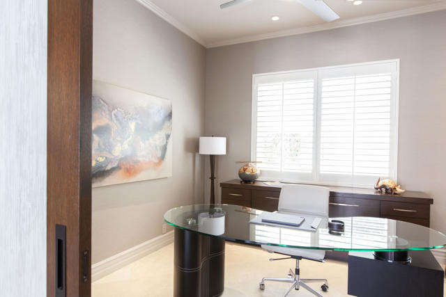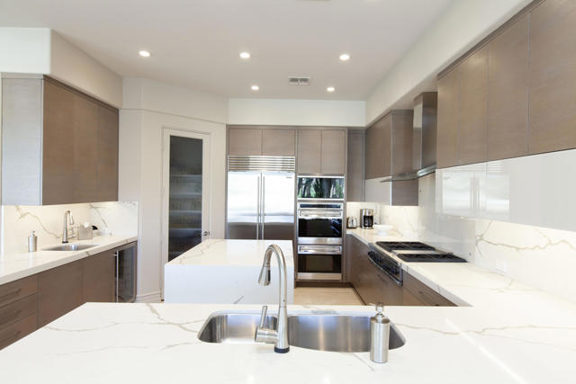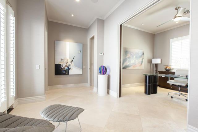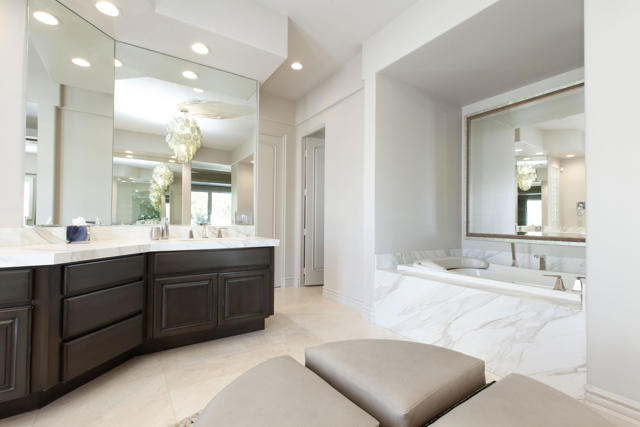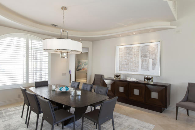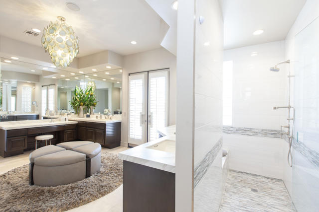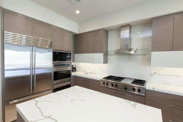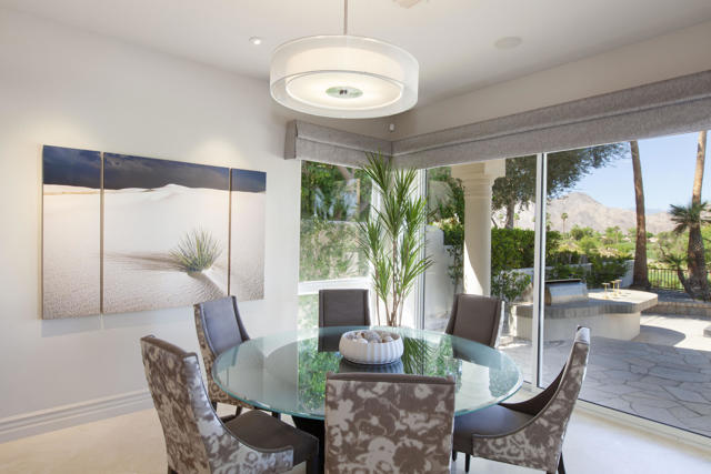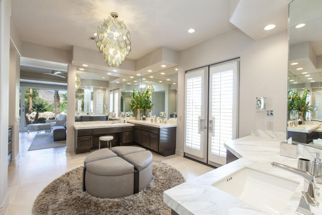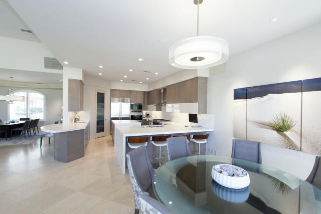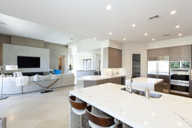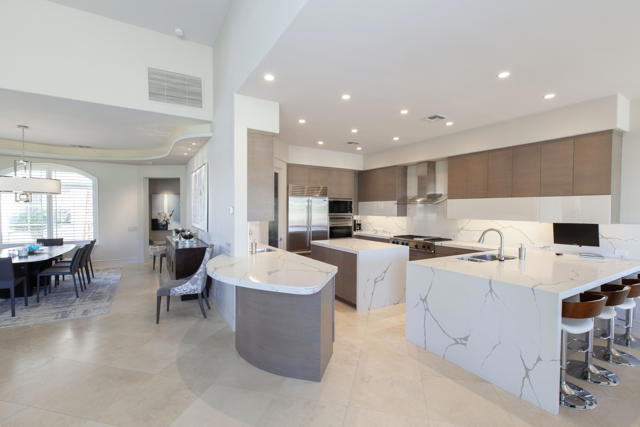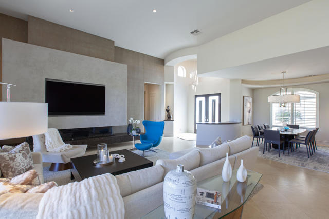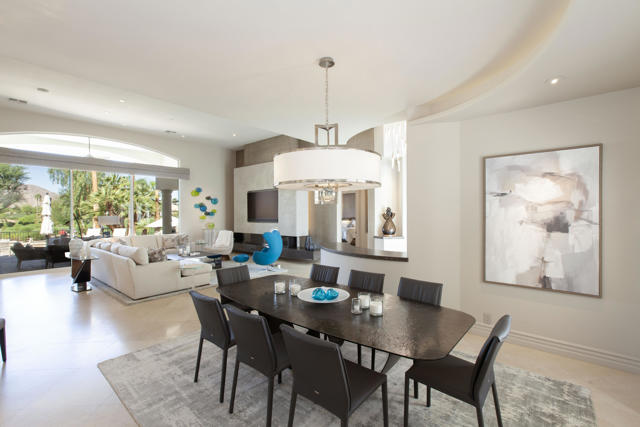 Set within the prestigious gates of Rancho La Quinta Country Club, this one-of-a-kind reimagined Montana I residence evokes the elevated design and refined aesthetic of a custom home, offering a rare blend of architectural sophistication, modern luxury, and breathtaking natural beauty. Positioned on an expansive 15,246 sq. ft. cul-de-sac lot, the home is elevated to capture sweeping views of the Santa Rosa Mountains, rugged foothills, and multiple fairways--creating a dramatic and ever-changing desert backdrop. A striking arrival begins with contemporary dual wood and frosted glass entry doors, opening to a custom half-moon marble-topped foyer accented by an art niche, designer lighting, custom paint, and curated wall coverings. Inside, the home has been completely redesigned to deliver a modern, gallery-like living experience. Expansive great room living is anchored by a cantilevered floating 8-foot fireplace beneath a sleek suspended TV wall, all set atop 24'' x 24'' travertine stone flooring that flows seamlessly throughout. The reimagined floor plan includes a reshaped dining area and a sophisticated open-concept layout ideal for both intimate living and grand entertaining. The designer kitchen is a true showpiece, featuring quartz countertops, a large center island, and premium stainless appliances including a Sub-Zero refrigerator, Wolf microwave and double ovens, Bosch dishwasher, and wine refrigeration.The primary suite is a luxurious retreat, thoughtfully redesigned with a floating 5-foot fireplace and modern TV wall, while the spa-inspired bath offers a step-in, step-out shower, soaking tub, and French doors opening directly to the resort-style backyard. One guest bedroom has been transformed into a contemporary office, while two guest casitas provide exceptional privacy and flexibility for visitors. Outdoor living reaches new heights with a spectacular resort pool environment featuring a large swimmer's pool, separate party pool, dual waterfalls, spa, and an elevated viewing deck--all designed to maximize the stunning panoramic setting. A spacious BBQ island anchors the entertainer's patio, while the fenced backyard adds both definition and functionality. Additional enhancements include custom window coverings with electronically controlled shades, newly painted exterior, and professionally redesigned landscaping. Three-car garage features air conditioning, epoxy flooring and built-in storage. See Improvements List. Furnished per Inventory.
