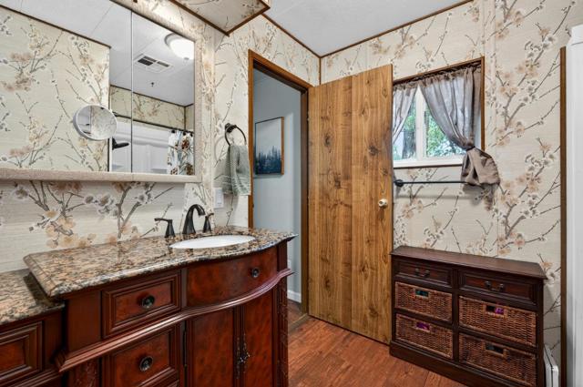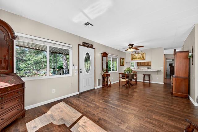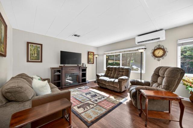 This unit was purchased and remodeled last year. Set in an inviting woodsy park, New composition roof, new 2 split unit heat/ac, new flooring water and scratch resistant, new windows, new appliances, Refrigerator, dishwasher, glass top stove, microwave. New tankless water heater, update Primary bathroom has newer walk in shower, vanity, toliet,laundry room has new flooring and laundry sink, Interior and exterior paint done with in the last 12 months, gravel and pavers to add to the easy to care for yard, fenced area for your pets and privacy, good size shed out back, club house across the road, swimming pool and spa, pool table, game room, upgraded electric.