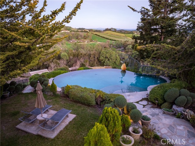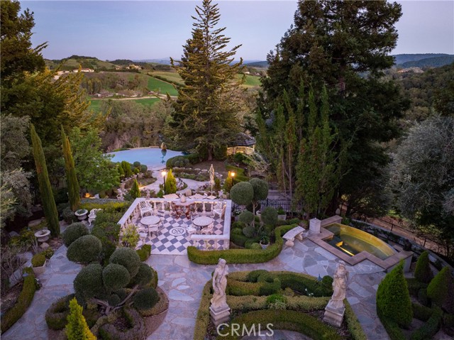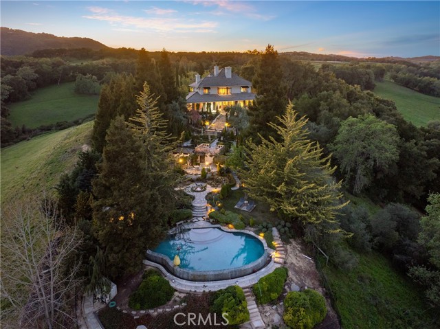 Set in one of California’s most desirable Central Coast regions, this 33± acre estate offers elegance, serenity, panoramic views, and unmatched pride of ownership. Surrounded by lush redwoods, fruit trees, and manicured gardens, the gated and fully fenced property features a Monet-inspired lagoon, koi pond, Japanese meditation house, grotto waterfall, treehouse, and dedicated gym/game area—creating a peaceful, storybook setting. At its heart lies a 7,200± sq. ft. Hampton-style main residence with 5 bedrooms, 6 bathrooms, and a separate en-suite with private balcony. Interiors showcase cherry hardwood floors, exotic stone, and 4 fireplaces. The gourmet kitchen includes high-end appliances, butler’s pantry, and designer lighting. Recent upgrades include new hardwood floors, roof, fencing, 3 HVAC systems, pavers, and a 60-panel solar system. Outdoor amenities include an infinity pool/spa with Tuscany-like views, full kitchen, grill, and fireplace. A separate 2,800± sq. ft. guest house with 4 beds/3 baths, 2 barns, horse stalls, and a 300-tree pomegranate orchard add function and flexibility. One barn offers event venue potential. With 4 wells (2 in use) and close proximity to town, this rare legacy property combines privacy, timeless sophistication, and lifestyle or business potential.