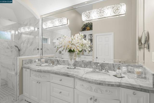 Beautifully remodeled move in ready home offers single-level living with refined finishes throughout. Featuring 3 beds plus a versatile loft and 2.5 baths, the home blends comfort with modern sophistication. The 3rd bedroom is currently an office & could be easily converted to a bedroom. The newly remodeled kitchen impresses with custom cabinetry, stone countertops, premium Thermador appliances & an expansive island. The open-concept layout seamlessly connects the kitchen, dining & living areas, creating a bright & inviting atmosphere. The primary suite is a true retreat with vaulted ceilings, a spacious walk-in closet plus an additional closet, and a spa-inspired bathroom with custom cabinetry, stone countertops & designer lighting. The private loft provides flexible space ideal for a home office, bonus room, or fitness area. Additional highlights include: Multiple oversized sliding glass doors for indoor-outdoor living, custom millwork, vaulted ceilings, hardwood floors, newer carpet, designer chandeliers, plantation shutters & a finished garage with epoxy floors. Outside is a charming courtyard with a soothing fountain. The private backyard oasis features panoramic views of the open space. Community amenities include pool & tennis court. House is 2415 sqft, Loft is 364 sqft.