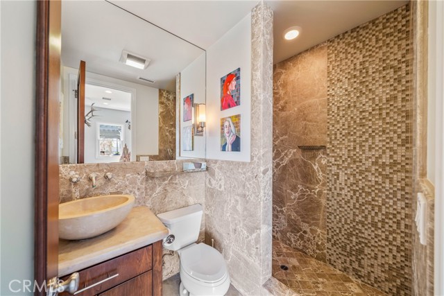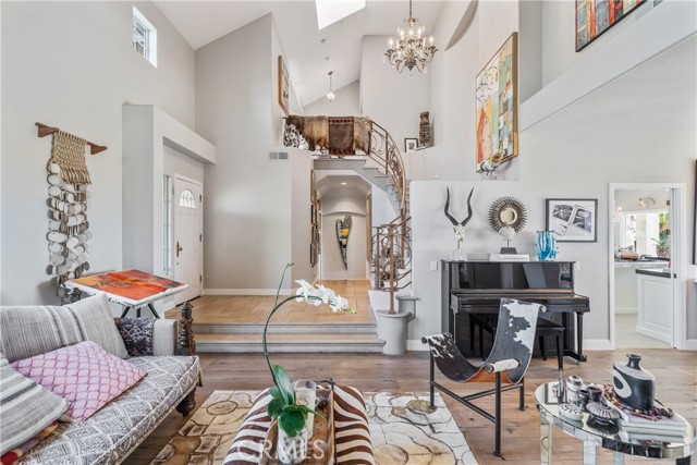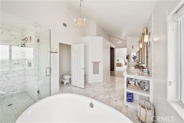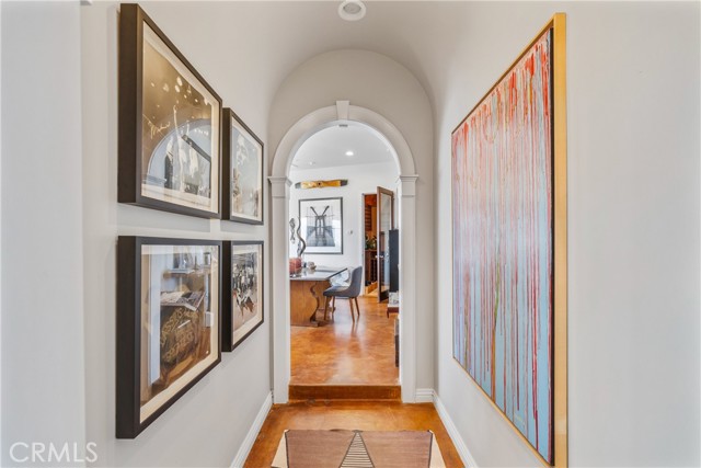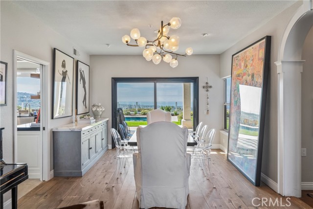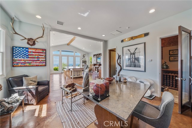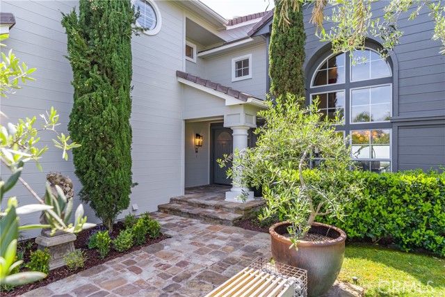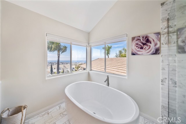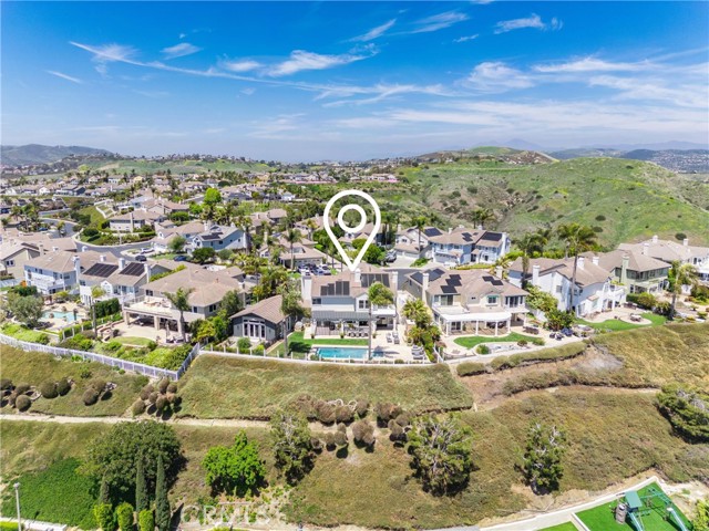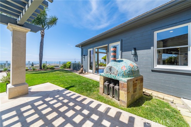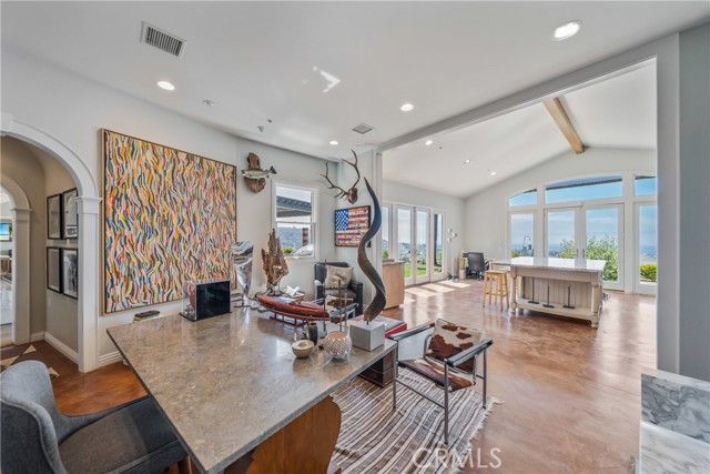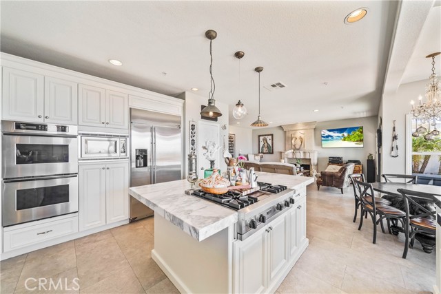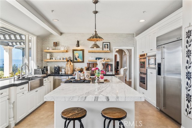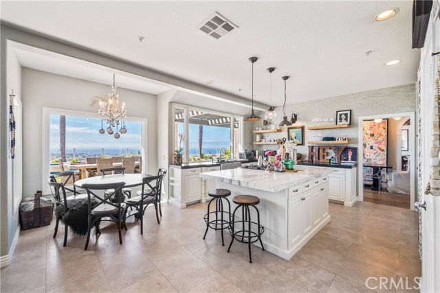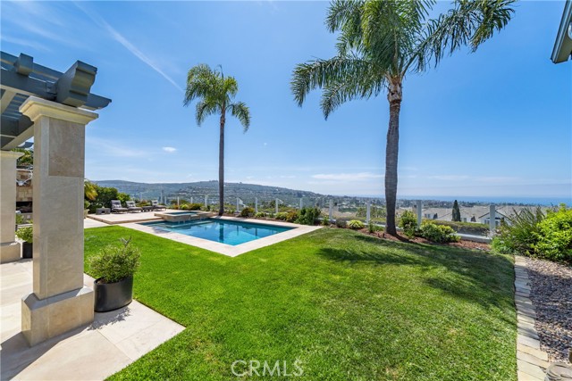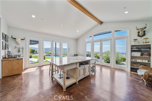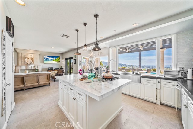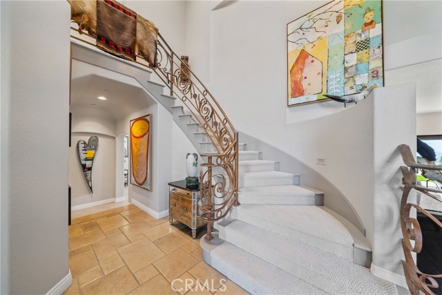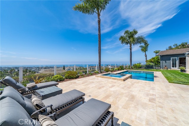 This light filled home is set on a premier San Clemente terrace, with sweeping 180 degree ocean, Catalina Island, and city light views in a refined coastal setting. This private enclave is a thoughtfully designed 4409 sq ft estate, featuring 5+ bedrooms and 6 bathrooms. A Dakota stone pathway leads past Cypress and a majestic olive tree, setting the tone of timeless European influences with quintessential Southern California style. Inside, a voluminous entryway with limestone and custom ironwork handrail, leads to vaulted ceilings, carved stone fireplaces, and generous living spaces with seamless indoor outdoor flow. The sunny attached casita, with ADU possibilities, has a private entrance, full bath, and temperature controlled wine room that is ideal for guests, creative use, wine pairing, or a wellness studio. The panoramic ocean views are on full display from most every room. The eat in family kitchen is cooking, showcasing top tier appliances, a statuary marble island, honed black marble countertops, a large pantry and open wood shelving. Even the kitchen sink has amazing views. Off of the kitchen is a den/tv room with an amazing hand carved fireplace, wine fridge and more sit down ocean views. A second, main level guest suite with full bath adds flexibility for all. The formal living room soars with 22 foot ceilings, walls of glass, and another amazing hand carved stone fireplace. The dining room offers perfect ocean views. The primary suite is a true retreat with commanding ocean views a custom built walk in closet, and glass doors that open to a breathtaking sundrenched deck with panoramic ocean views. The primary bath is a luxurious retreat with custom stonework, and a soaking tub with more ocean views. Outside, enjoy an expansive French limestone patio with French limestone columns under a huge shade trellis. Towering palms frame the solar heated French blue pool with waterfall spa and the custom Dakota stone and limestone finished fireplace. A sleek glass back fence offers unobstructed views. The teak outdoor shower adds a luxurious resort touch. Located at the end of a quiet cul-de-sac within the prestigious guard-gated community of Marbelhead, this home offers a 3 car garage and 3 additional parking spaces in the driveway. Moments from world class beaches, restaurants, shopping, schools, and recreation. This is a rare coastal soul offering combining elegant craftsmanship, ocean view serenity, and resort caliber amenities.