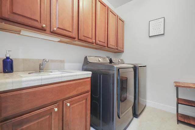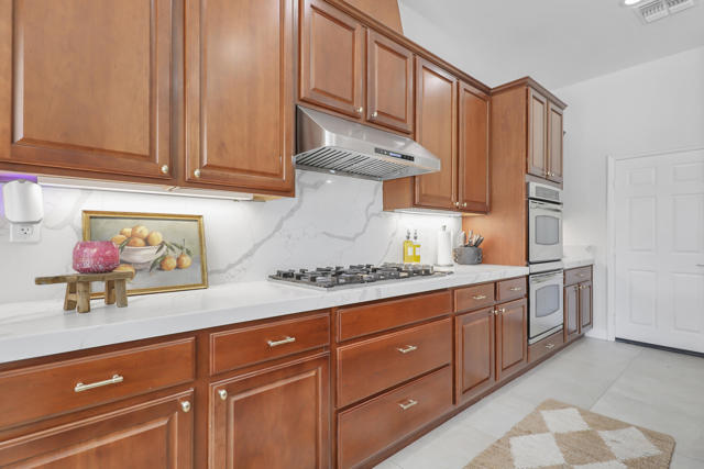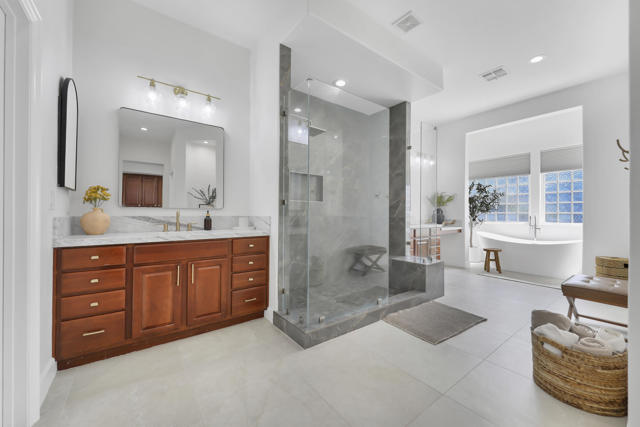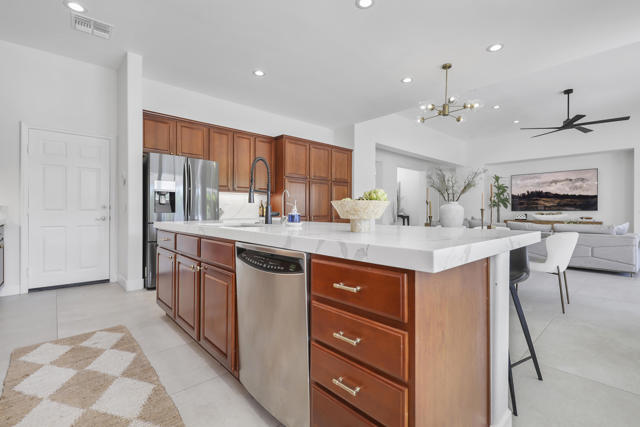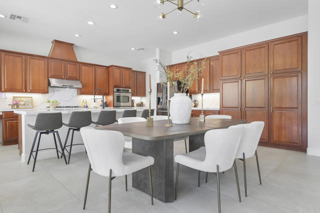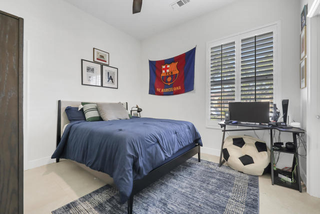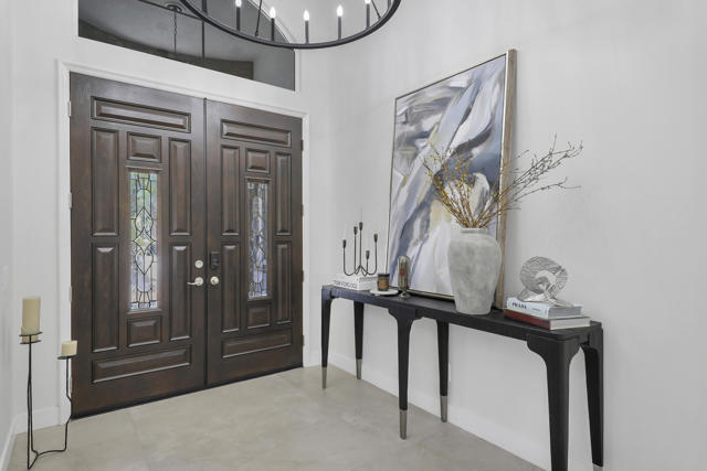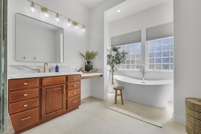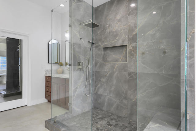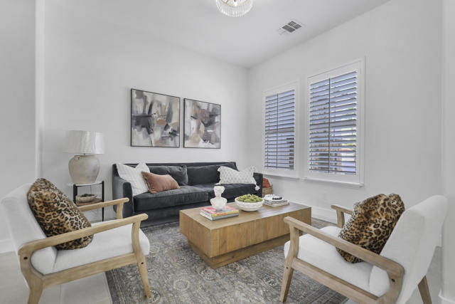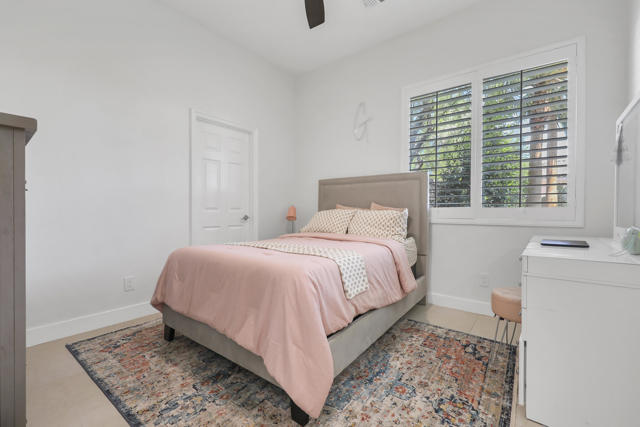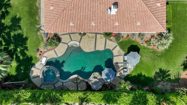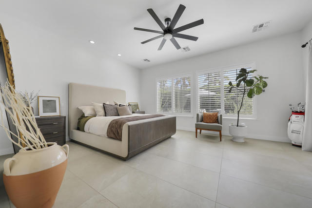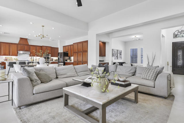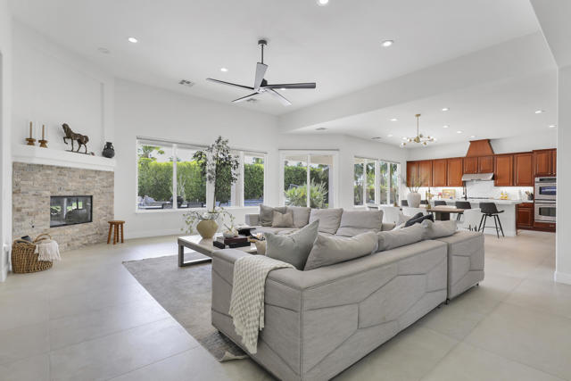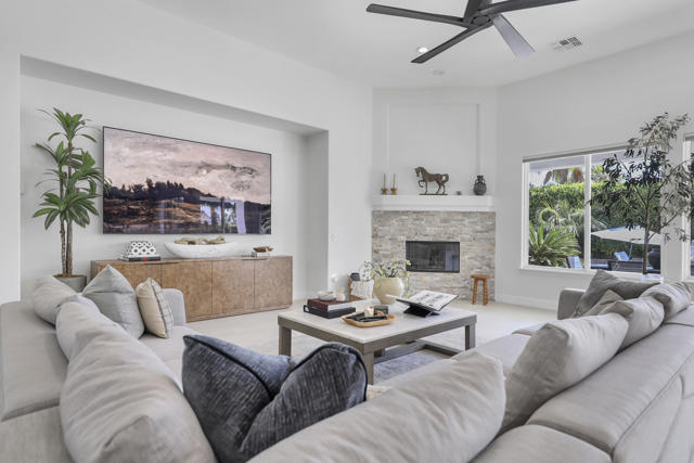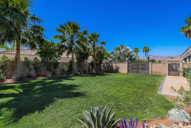 Perfectly positioned on an interior lot in Desert River Estates, this beautifully updated 4-bedroom + office, 3.5-bath home offers privacy and an ideal East-facing leisure yard with no road noise. The 2023 exterior refresh features crisp white paint and natural stone accents, creating striking curb appeal. A gated courtyard with a gas fireplace provides a welcoming entry. The true ''wow'' moment happens as you step inside--high ceilings, expansive windows, and immediate views of the resort-style pool, spa, and rock waterfall.The home features new 2' x 4' modern tile flooring throughout, fresh interior paint, and fully remodeled bathrooms plus upgraded kitchen. At 3,150 SF on a 22,216 SF lot, the open Great Room floor plan offers both spaciousness and warmth. The kitchen overlooks the large family room and includes generous counter space, quartz counters matching the baths, and an island with seating for 5. A dining table sits between the kitchen and living area, all oriented toward the fireplace and media wall. The formal dining room is currently used as a cozy sitting area, showcasing the home's versatility.The primary suite includes a built-in buffet, two large walk-in closets with combo locks, and a luxurious bath with dual vanities, a freestanding soaking tub, an oversized shower and private commode. Nearby is a well-appointed laundry room with utility sink and storage, plus a convenient powder room for guests. A den--currently used as a 5th bedroom--sits along the bedroom wing. Three additional bedrooms are thoughtfully separated for privacy: one en-suite with walk-in closet, and two sharing a spacious bath. Plantation shutters enhance many of the windows.The expansive backyard features a large covered patio, pool with rock waterfall and spa, along with two generous side yards offering excellent flexibility. A 3-car garage and wide driveway, gives ample room for multiple vehicles, RVs, or recreational toys. The oversized lot also provides outstanding potential for a future Casita or ADU, with easy access and plenty of space to design.Conveniently located near Jefferson Street, this home offers quick access to La Quinta shopping, dining, golf, and essential services, with Costco & other major retailers, daily conveniences and I-10 freeway just minutes away.Desert River Estates maintains a peaceful residential environment with longer-term rental guidelines.
