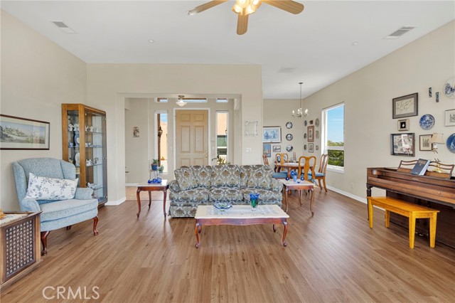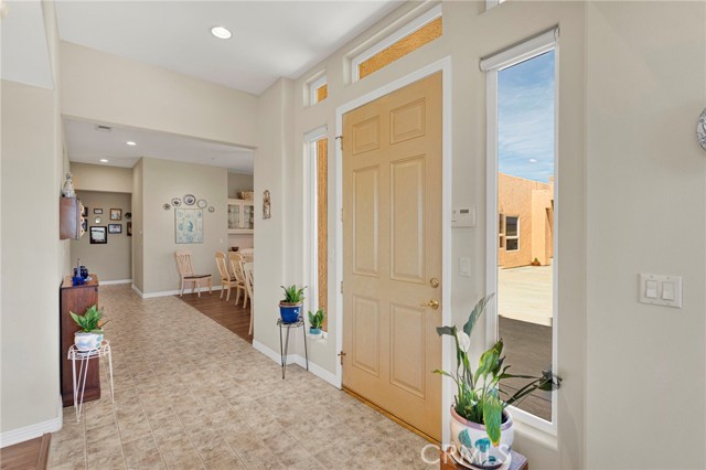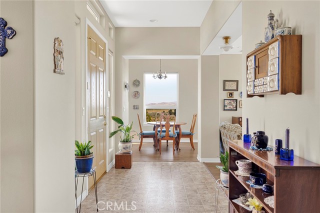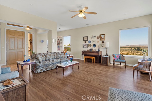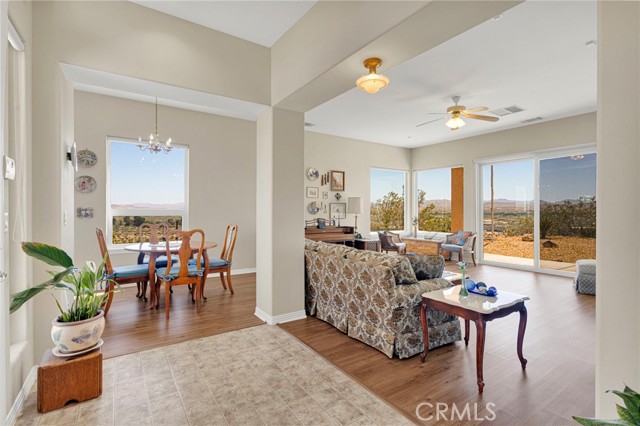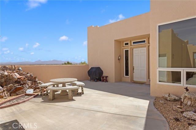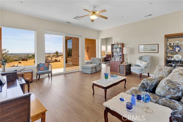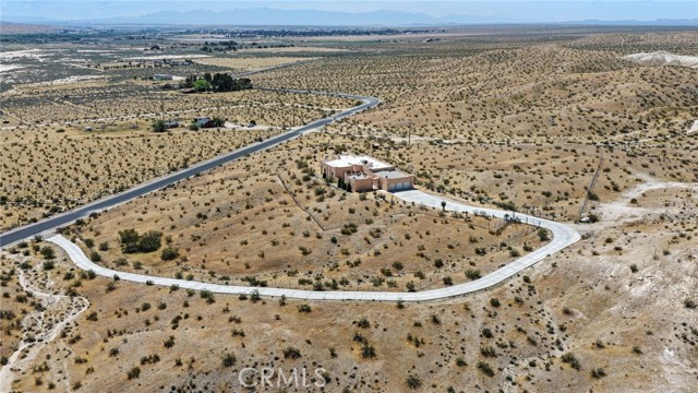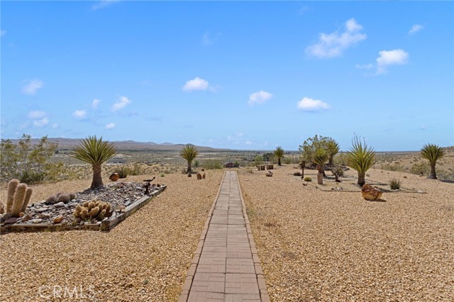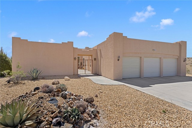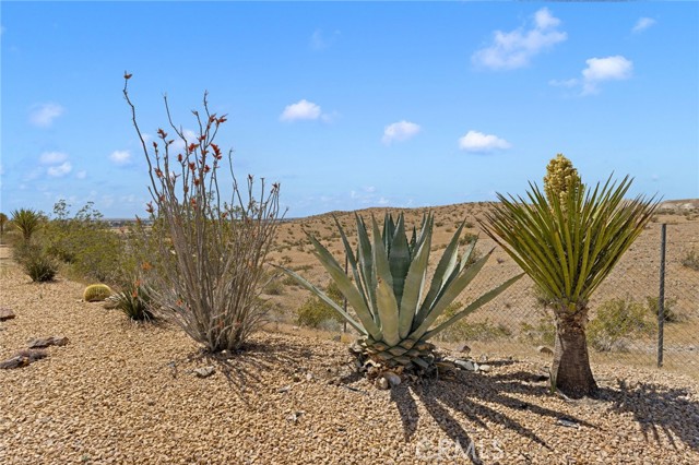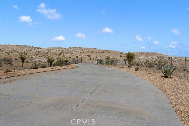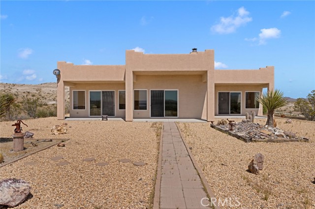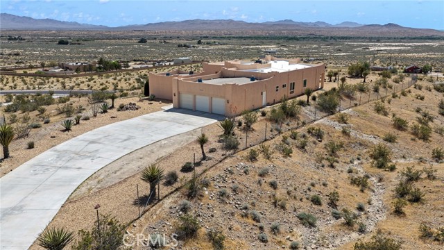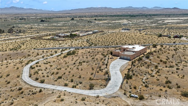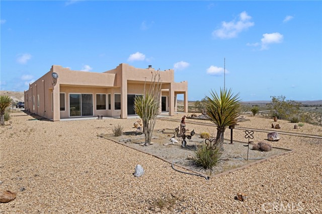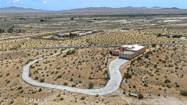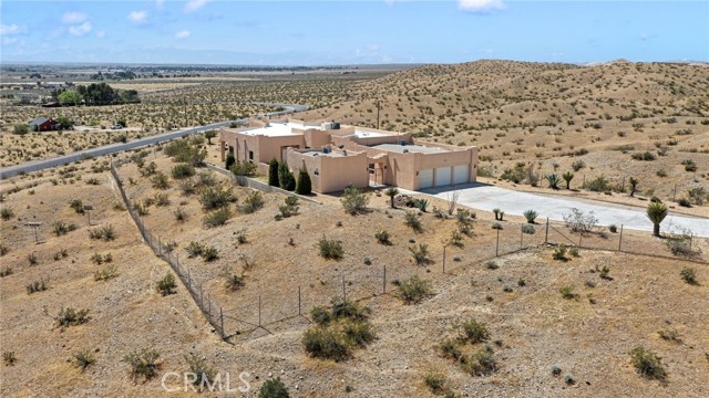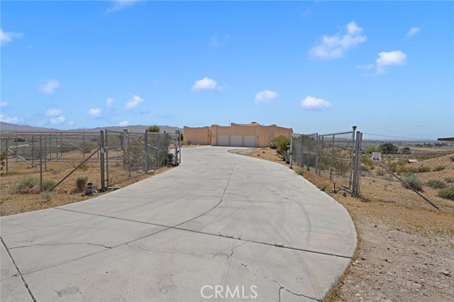 Stunning Santa Fe-style custom estate on 14 acres in Helendale with breathtaking 360° views! This 2,938 sq ft home offers 3 bedrooms, 2.5 baths, plus a detached 480 sq ft casita with full bath—perfect for guests or multigenerational living. Inside, enjoy soaring 12’ ceilings, formal living and dining rooms, and a massive farmhouse-style kitchen that serves as the heart of the home, featuring dual sinks, a large island, and open to the family room for entertaining. Designed to capture the incredible surroundings, the formal living room and family room both feature large sliders and picture windows showcasing the desert landscape and evening city lights. The spacious family room also includes a wood-burning insert with a striking custom petrified wood accent. The huge primary suite includes a walk-in closet, separate jetted tub, and walk-in shower, along with its own large slider offering the same stunning desert and evening city light views. Secondary bedrooms are generously sized. Additional highlights include a large indoor laundry room and water softener. Outdoor amenities include a private courtyard, fully fenced acreage, and electric gates, all set on a paved road. The property also features a 6-car tandem garage and a high-capacity well capable of supporting additional structures or a second home. A rare combination of space, privacy, and custom design! Just minutes from the Silver Lakes Community!