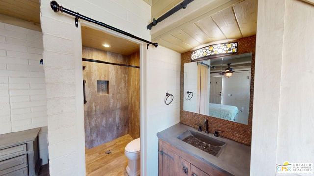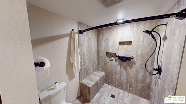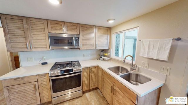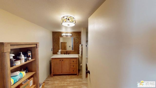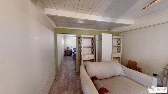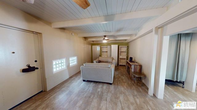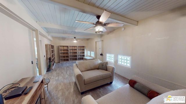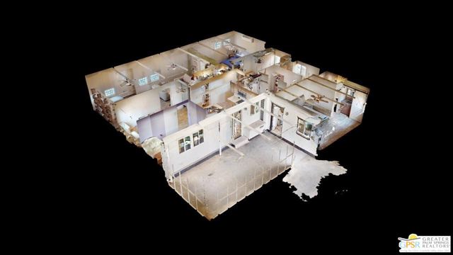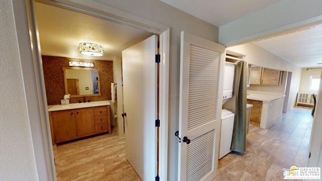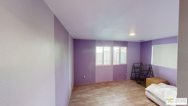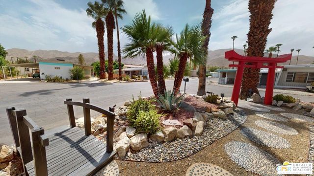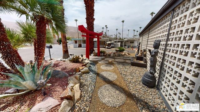 Blue Skies at it's finest and thank you Bing Crosby for opening Blue Skies many years ago for the non - actors who wanted a lifestyle in the desert but couldn't afford a pool home. But I digress. Here is a whimsically designed 3 Bedroom 2 Bath home and one of the bedrooms is actually an attached Casita with it's own bath and private entrance. A 1960's mobile home is surrounded with stick-built construction lending to it's solid feeling and quiet interior space. Approaching this home, one can't actually tell where the living room windows are because of the intricate concrete facade. Once inside, the living room windows are close to the floor, but with some slight upgrading, there is potential for larger windows. Forward from the living room, with built-in bookshelves, is the dining area and access to the second bedroom and then to the left is the well detailed galley kitchen with the walk-in pantry across from it. Further on is the stacked washer and dryer in it's own closet and then beyond that is the Primary Bedroom Suite Closet and large stall shower bathroom - roll in variety. Then to the left is the primary bed chamber with direct access to the front living room. Outside the back door there is access to the Casita with it's own entrance and bath area. There is covered carport parking and extra uncovered parking as well. Blue Skies offers a clubhouse and exercise room and the community pool and spa. Blue Skies is also close to restaurants and shopping especially on El Paseo - the Rodeo Drive of the Desert!