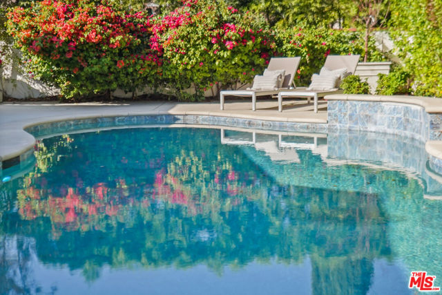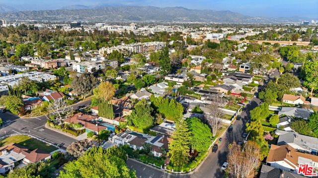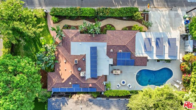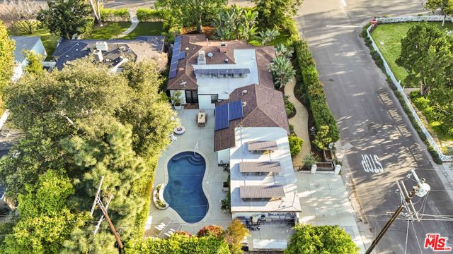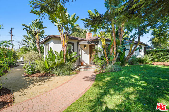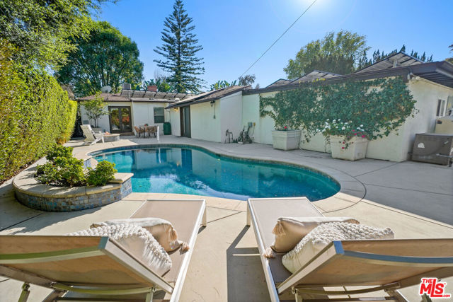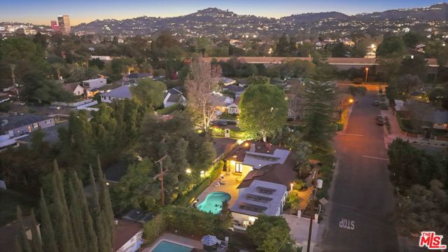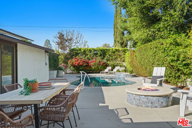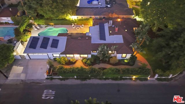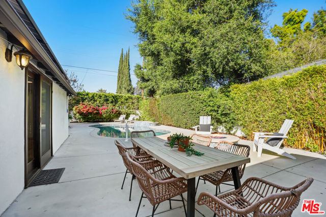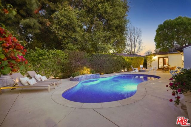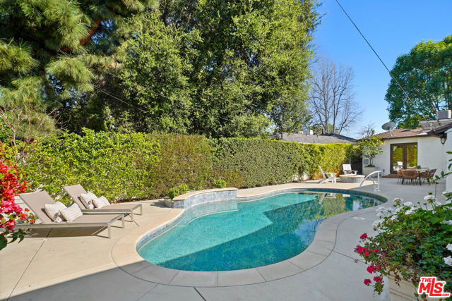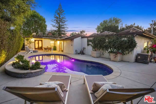 A sublime expression of classic California living, this spacious, updated single-story residence is ideally sited on a sweeping corner lot in the highly sought-after Colfax Charter School District. With generous scale, inviting living spaces, and a backyard designed for the quintessential Southern California lifestyle, the home offers extraordinary comfort and easy, relaxed living and entertaining in one of Valley Village's most beloved neighborhoods. The exterior presentation is a lush fusion of floral, greenery and towering trees with a high hedge enhancing both presence and privacy. Inside, a light-filled floorplan unfolds with gracious transition from room to room. Espresso wood and rich travertine grace the living areas. The remodeled kitchen is a cook's delight adorned with fine stainless steel appliances and adjoining breakfast room. Glass sliding doors bring the outdoors in and give way to a private backyard oasis. Replete with alternating colored pool with waterfall, firepit and dining and lounging patio, it's the ideal venue for warm, relaxed poolside lounging by day, cool gatherings and al fresco entertaining by night. Highlights include a direct access two car garage, solar panel system, Halo 5 water purification system, tankless water heater, speaker system, and mature fruit trees. Four bedrooms and two baths including a lux primary suite with exceptional walk in closet, spa inspired bath and direct pool access provides comfortable accommodations for family and guests. Ideally located just moments from NBC, CBS, Warner Bros., Disney and Universal Studios, beloved Valley Village Park, and the vibrant dining and arts scene of the NoHo Arts District. Here is an idyllic, vibrant tree-lined community and wonderful place to call home. Welcome!