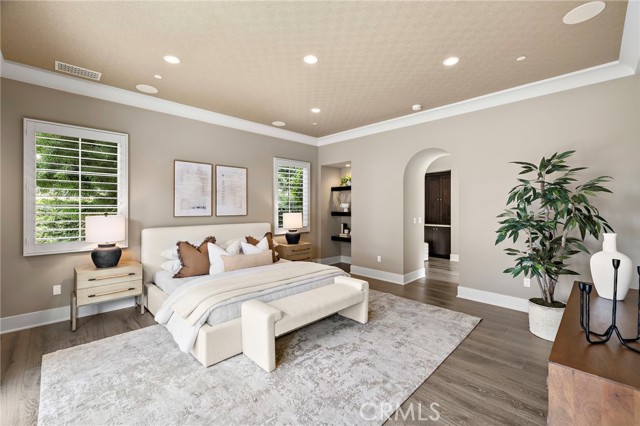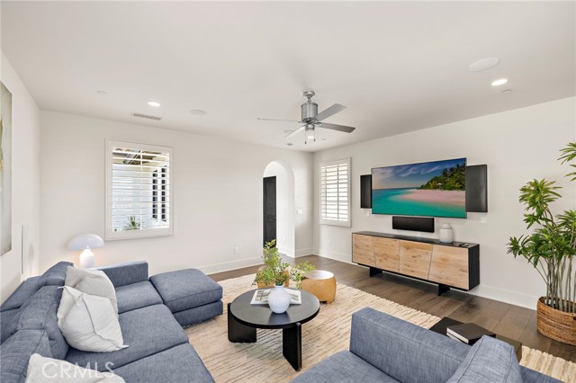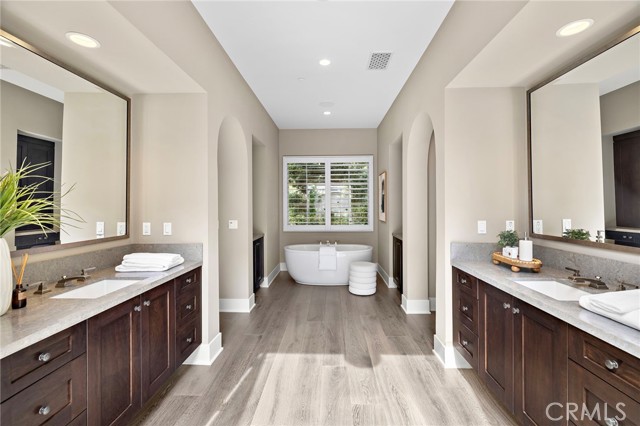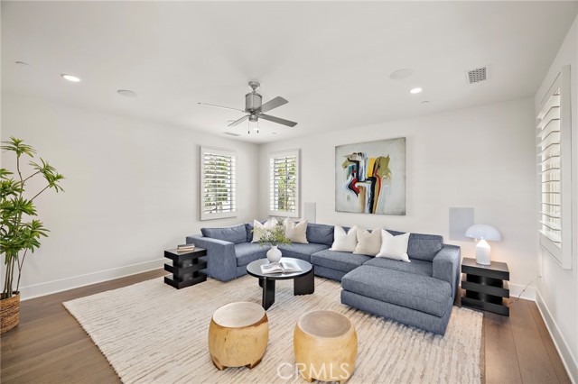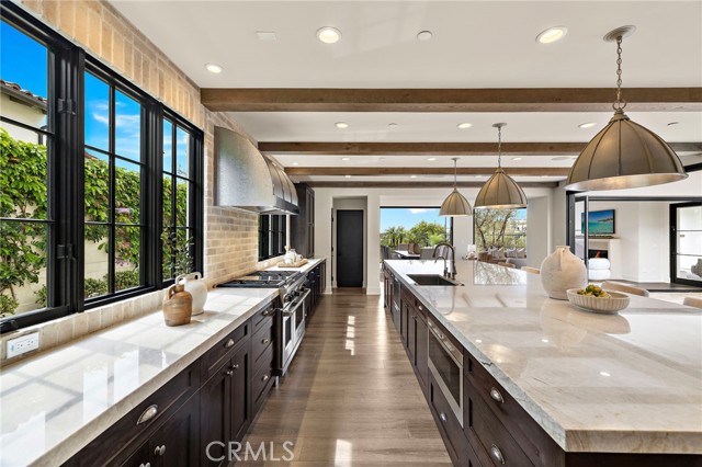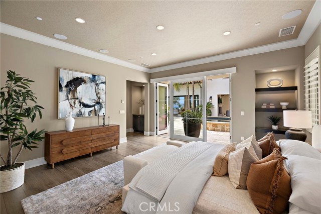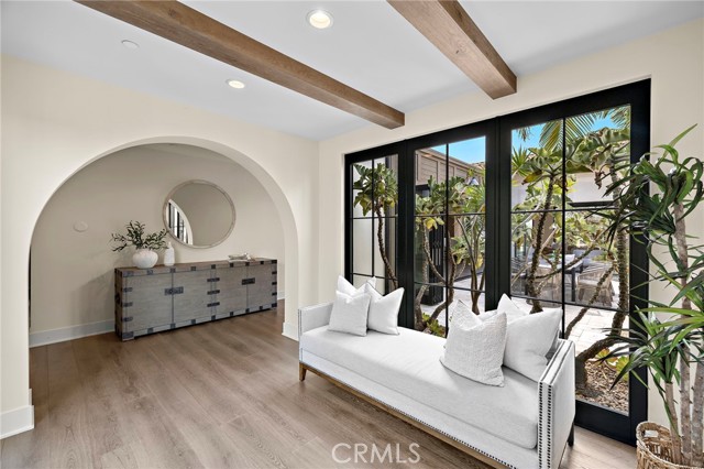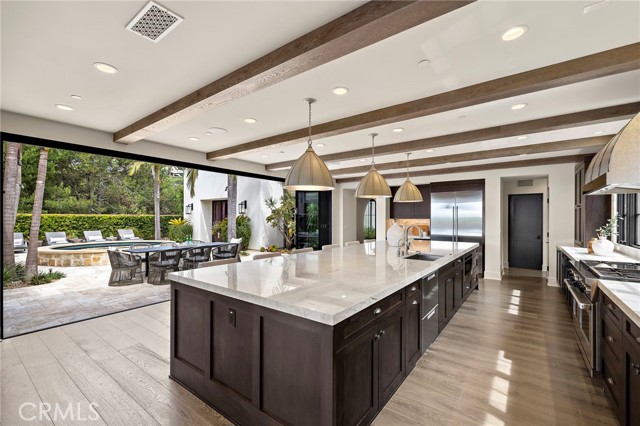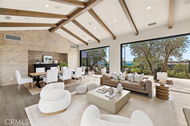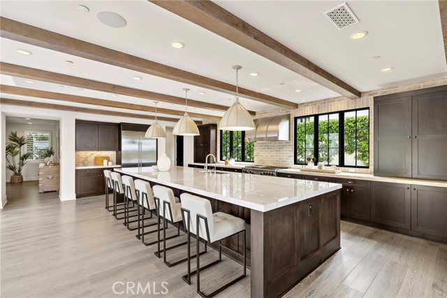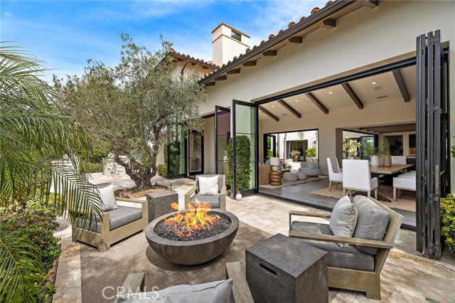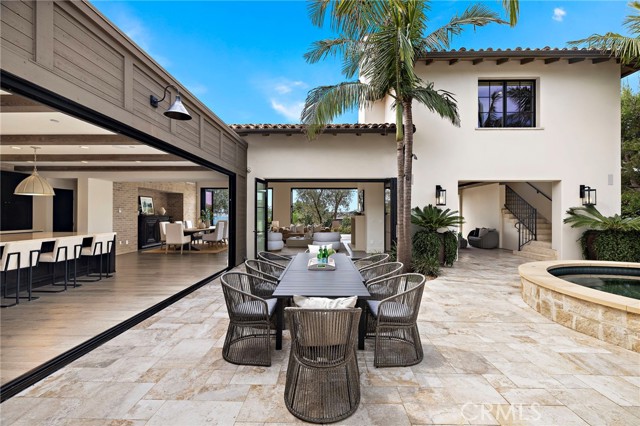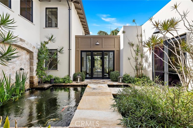 Nestled within the prestigious guard-gated enclave of Crystal Cove, this exquisite 5,300 sqft estate blends coastal elegance with modern sophistication. A grand entry, framed by koi ponds & cascading water features, sets the stage for this serene retreat. Designed for seamless indoor-outdoor living, retractable doors connect the great room & gourmet kitchen to multiple entertaining spaces. A custom outdoor kitchen, oversized spa, and lush landscaping create a private coastal oasis. The chef's kitchen boasts an oversized island, Wolf & Sub-Zero appliances, a spacious butler's kitchen, and ample storage. Wood-beamed ceilings, wide-plank French Oak floors, and marble & quartzite countertops add timeless charm. Smart home features include Savant automation, SONOS sound & solar panels. The main-level primary suite offers a spa-inspired haven, while two upstairs guest suites and a versatile bonus room provide additional comfort. A private guest casita within the gated courtyard serves as an exclusive retreat. Above the loggia, a separate office boasts a secluded workspace. Residents enjoy access to the Canyon Clubs pool, fitness center & sports courts, while Crystal Cove Promenades upscale dining, shopping & the beach are just moments away. Experience the pinnacle of coastal luxury.