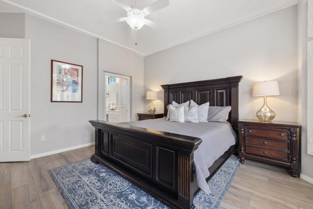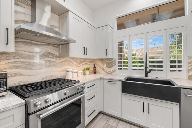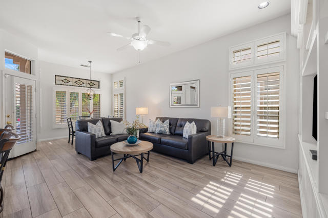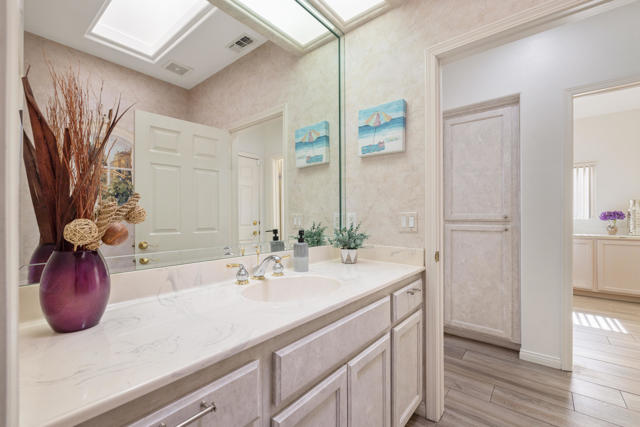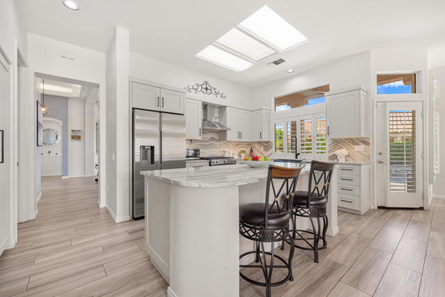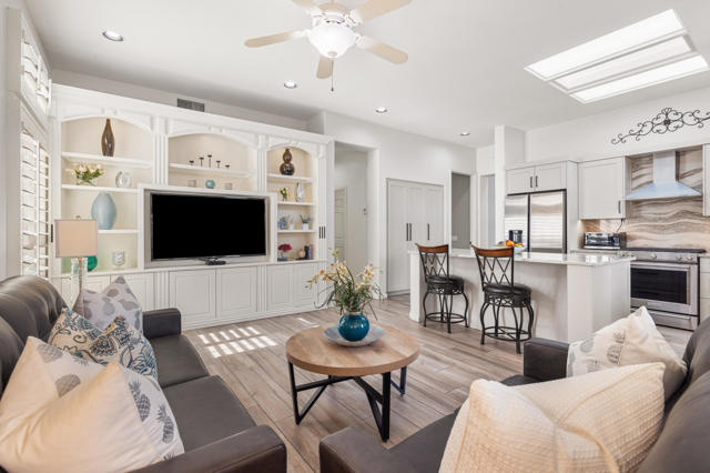 55+ Sun City Palm Desert--The ''Best Bang for your Buck'' in the whole Coachella Valley and beyond. Rarely does an opportunity come along to own one of the most coveted floor plans in this award-winning active lifestyle adult community in the desert. Introducing a truly spectacular Emerald ''Estate'' model home with 3 bedrooms and 3 bathrooms situated on a rare oversized corner lot located close to the main Mountain View Clubhouse. This luxurous home offers unmatched privacy, curb appeal, outdoor living and entertaining potential. You will find premium upgrades featuring a double door entry with custom glass insert, high coffered ceilings, plantation shutters, (4) skylights, wood-like plank tile throughout except guest room, and new HVAC (2025). A gated courtyard leads through double glass doors, opening up to the light and bright main living and dining area, a wall of windows and a sliding door access to the cool north facing backyard. Gather in the heart of the home, the open-concept kitchen and family room that has been transformed with stunning quartz counters, large island offering plenty of workspace perfect for meal prep and entertaining and breakfast bar, white cabinets, double wall ovens, stainless appliances custom farm sink and upgraded faucet. The family room has stylish built-ins and breakfast nook and access to the patio. The master bedroom suite has bay window with a view, bathroom has dual vanity, soaking tub, separate shower, oversized walk-in closet with custom organizing system. The spacious, extended guest suite doubles as an ''attached casita'' with ''french doors'' access to the front courtyard, featuring brand new carpet, closet, and a full bath with tub and shower. The third bedroom is spacious and has an ''en-suite'' half bath that doubles as a guest bath with separate access. The laundry room has washer and dryer, upper cabinets, utility sink, Corian counters and vertical blinds. The extended 2 car plus golf cart garage has overhead storage, storage cabinets. The true highlight of this property is the expansive, private outdoor space taking full advantage of the large corner lot. The backyard is a meticulously maintained oasis with mature desert landscaping and custom pavers, featuring a tranquil water feature, perfect for enjoying a quiet morning coffee or hosting family and neighborhood gatherings.