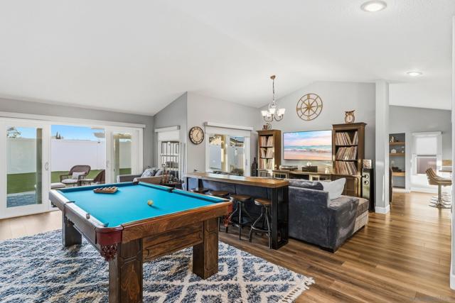 Nestled on a quiet cul-de-sac in a well-established neighborhood, this thoughtfully updated home captures the essence of relaxed Southern California living. Soaring vaulted ceilings and abundant natural light create an inviting sense of openness, while the layout offers a seamless yet comfortable flow between the living, dining, and kitchen spaces, ideal for both everyday living and effortless entertaining. At the heart of the home, the kitchen is designed for connection, featuring generous counter space, bar seating, and direct sightlines to the main living areas. Integrated surround sound enhances the experience throughout the interior and extends outdoors, creating a cohesive indoor-outdoor atmosphere perfect for hosting or unwinding. The backyard is a private retreat, designed for year-round enjoyment. Large sliding doors open to a beautifully curated outdoor space complete with a custom pergola, café lighting, multiple seating areas, and low-maintenance turf. Thoughtful landscaping and curved pavers add warmth and character, making it an ideal setting for quiet mornings or lively gatherings. The primary suite offers direct access to the backyard and a spa-inspired bathroom featuring a freestanding soaking tub, oversized walk-in shower, dual vanities, and rich wood finishes. Additional bedrooms provide versatile options for guests, a home office, or a fitness space. Ideally located near scenic trails, parks, and local recreation—including a nearby skate park and coastal bike paths, this home also offers convenient access to the beach, just a short ride away.