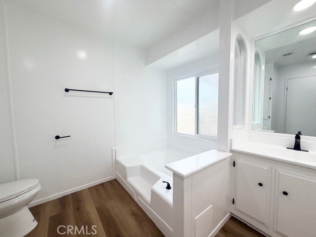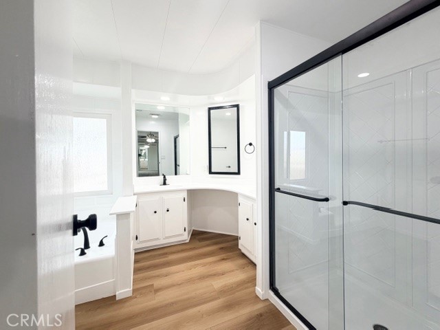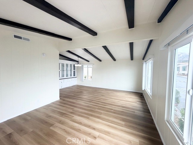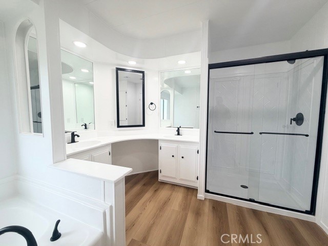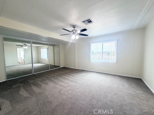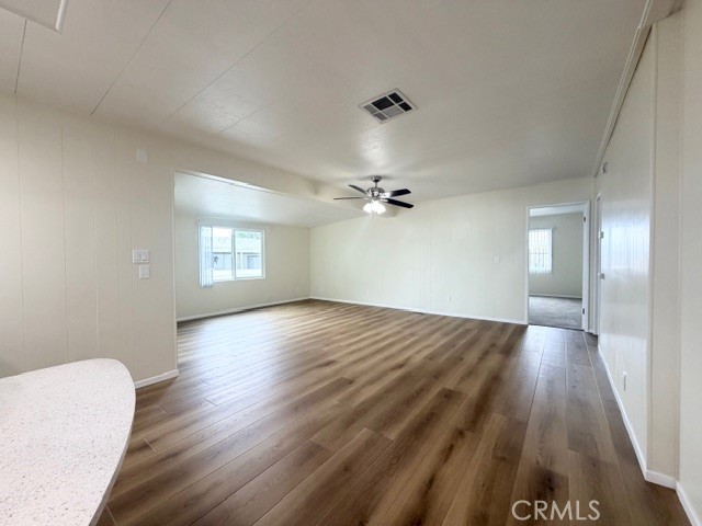 Spacious and like new!!! Welcome to Valencia Lea, Highland’s premier +55 community! This 2 bed 2 bath 1977 Goldenwest 1440sqft, plus bump-outs, home has great curb appeal, located on quite street with mature landscaping, featuring new paint, new dual pane windows and a large porch! This home features new interior paint, new lighting, ceiling fans, and new durable luxury vinyl plank flooring with carpeted bedrooms. The large beam-vaulted living and dining areas have plenty of windows, with new window coverings, letting in tons of natural light, and built-in dining room cabinets. The upgraded kitchen features updated counter tops, deep farm sink and new appliances! The kitchen is open to the family room with a huge bar peninsula, perfect for informal living. The guest bedroom has a large mirrored closet and nearby guest bathroom features tub shower combo. The large primary bedroom features a huge triple mirrored closet and attached spacious bathroom with glass enclosed low-threshold shower, double vanity, linen storage, garden tub and plenty of light! The full-length carport includes storage sheds. Don’t delay in taking a tour!