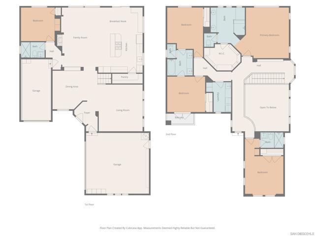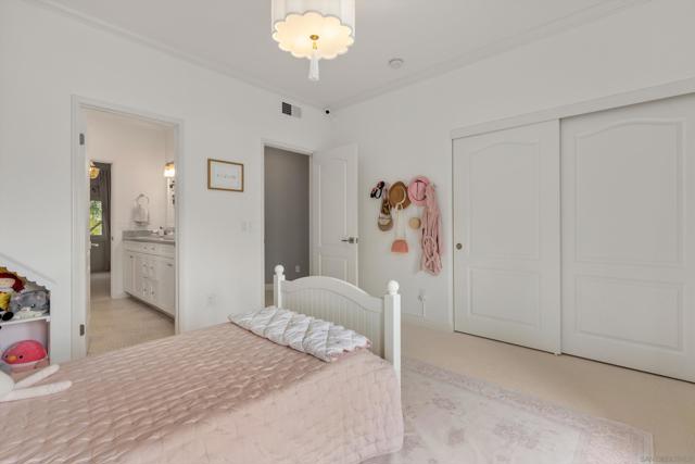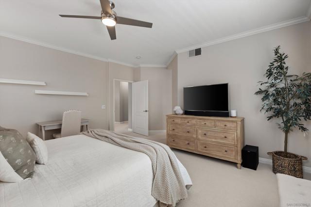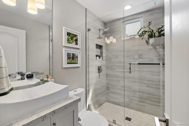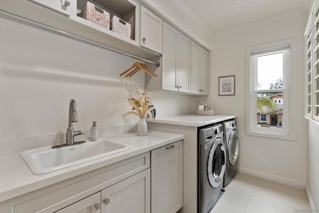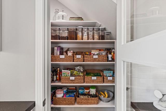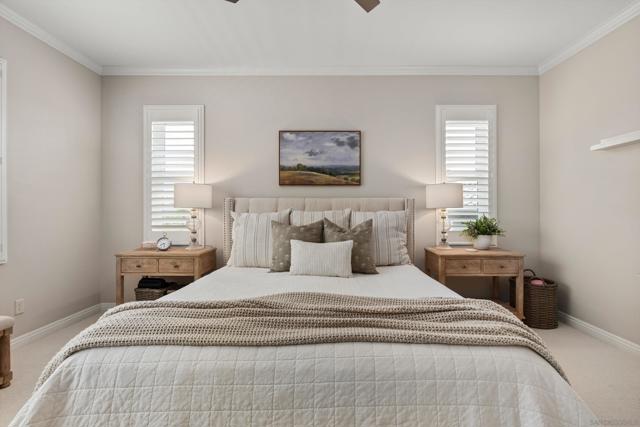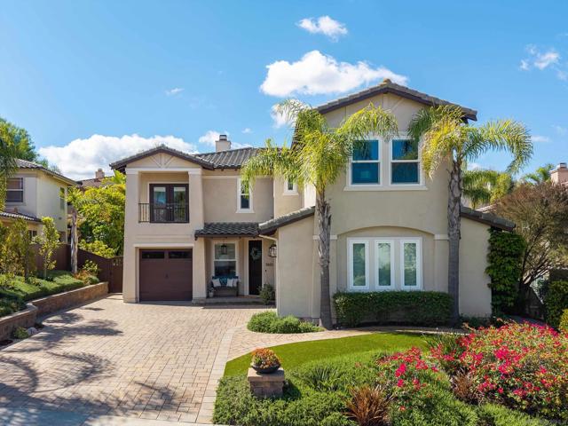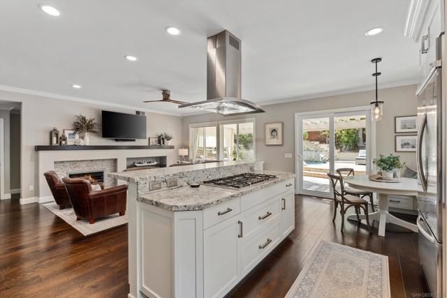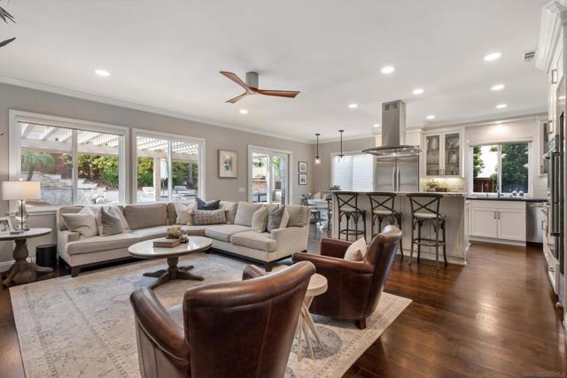 This five-bedroom, four-bath Scripps Ranch home has been genuinely well cared for. The quality updates are already done, adding a layer of confidence on top of the desirability the neighborhood carries. The main level sets the tone. The kitchen opens directly to the family room, with a center island cooktop, granite counters, and an updated linear fireplace anchoring the far wall. Sliding glass doors connect the eat-in dining area straight to the backyard and pool — indoor-outdoor living already established. A built-in KitchenAid fridge, Thermador range, GE double oven, and walk-in pantry round out a kitchen built for quiet comfort or hosting a holiday. The formal living room sits at the front with tall windows and Hunter Douglas plantation shutters, and a full bedroom and bath on this level add flexibility for guests or family. Upstairs, the primary suite has been fully remodeled — marble counters, frameless glass walk-in shower, porcelain tile, and a built-in vanity. The secondary bathrooms have been completely updated too. A second-floor laundry room with built-in sink and cabinetry sits conveniently between the bedrooms. The outdoor space may be what defines living here. A natural stone pool with spa, waterfall, and slide sits surrounded by mature palms and tropical landscaping. A palapa-covered outdoor kitchen with built-in BBQ is its own zone, separate from the main patio. Private, fully fenced, ready for a weeknight or a weekend party. Big-ticket items handled: owned solar, whole-house water filtration, new water heater, dual-pane windows, fresh exterior paint.