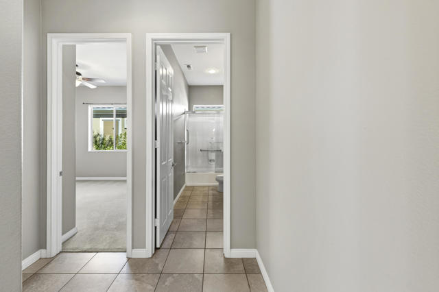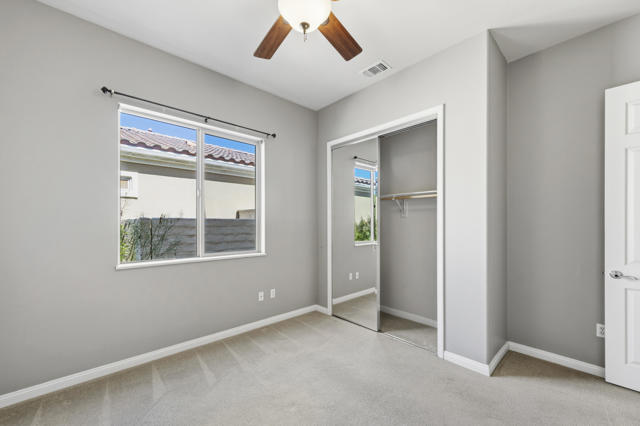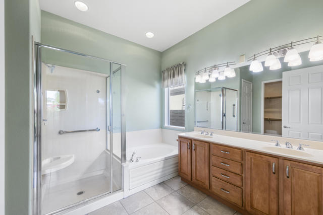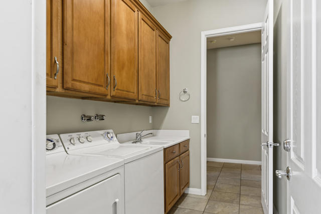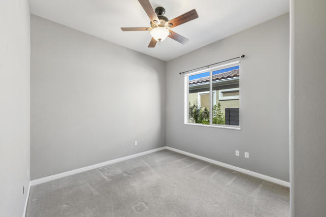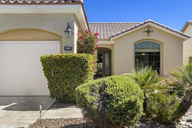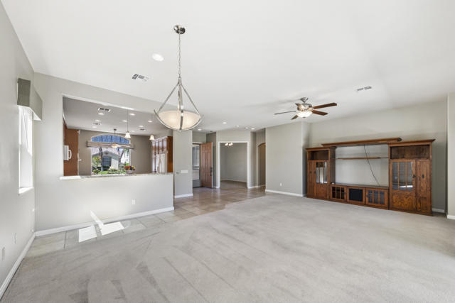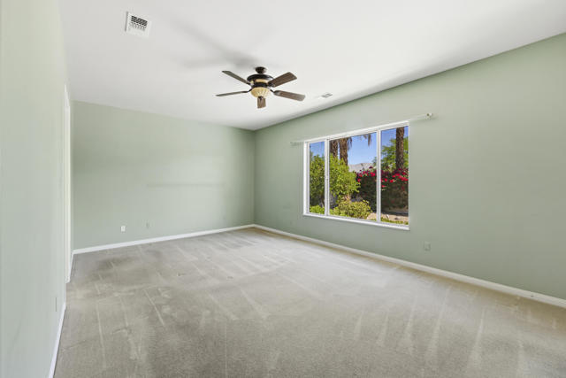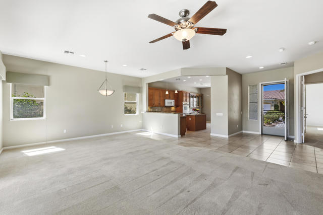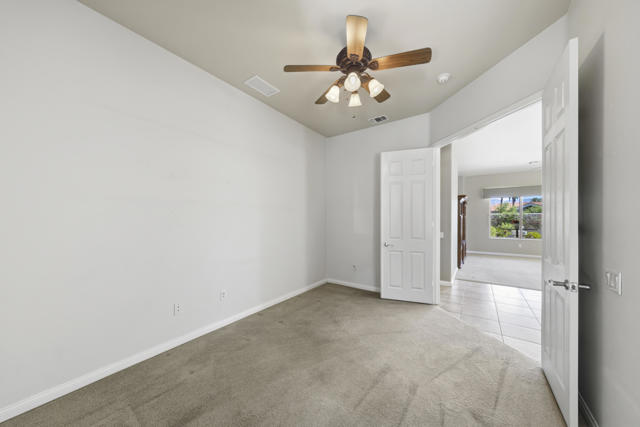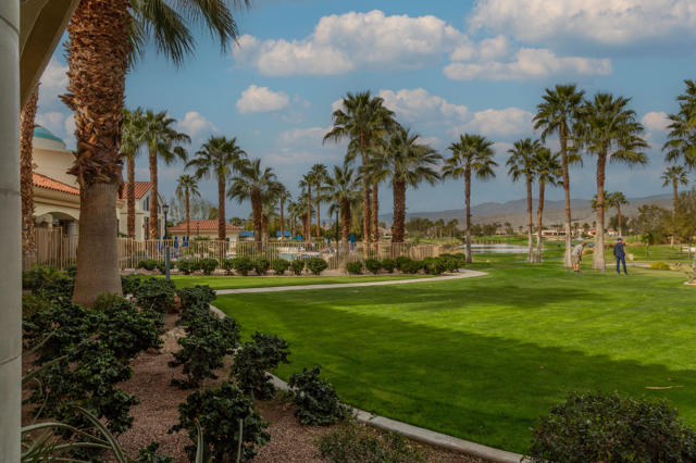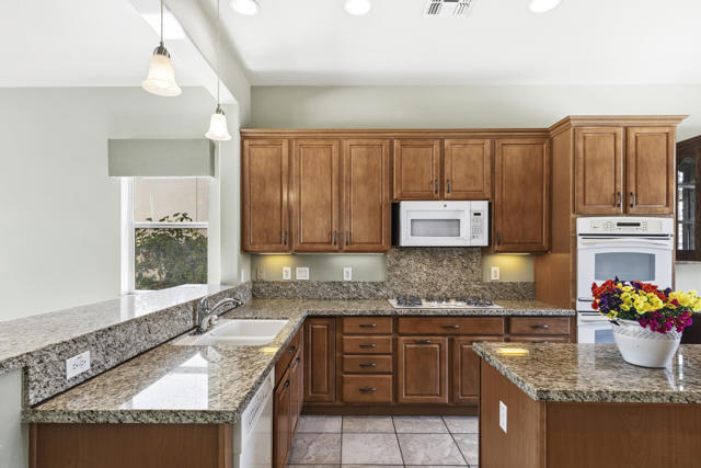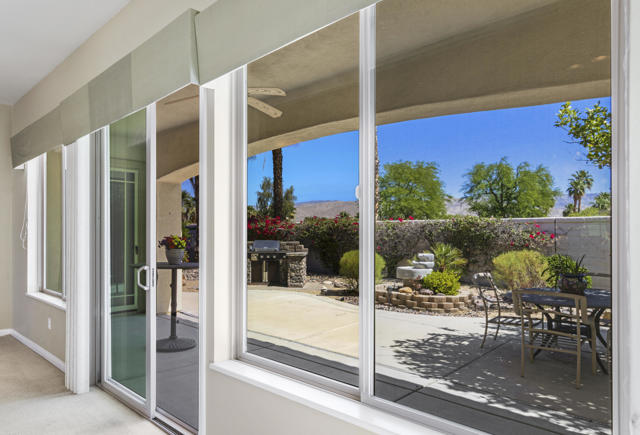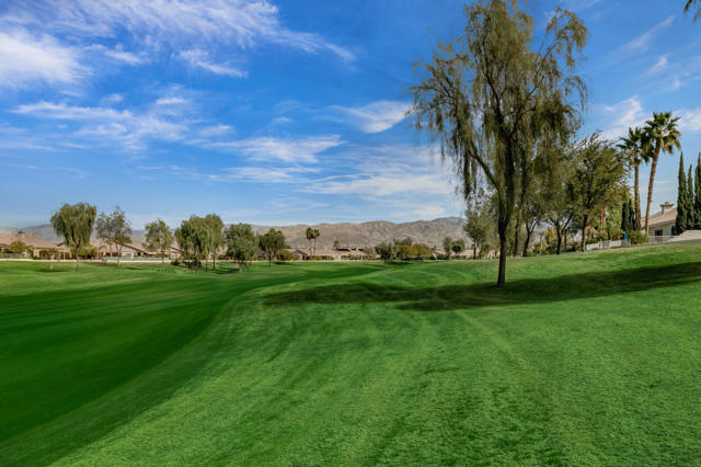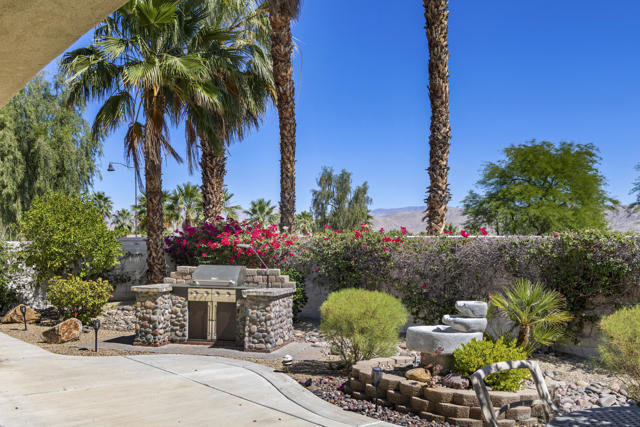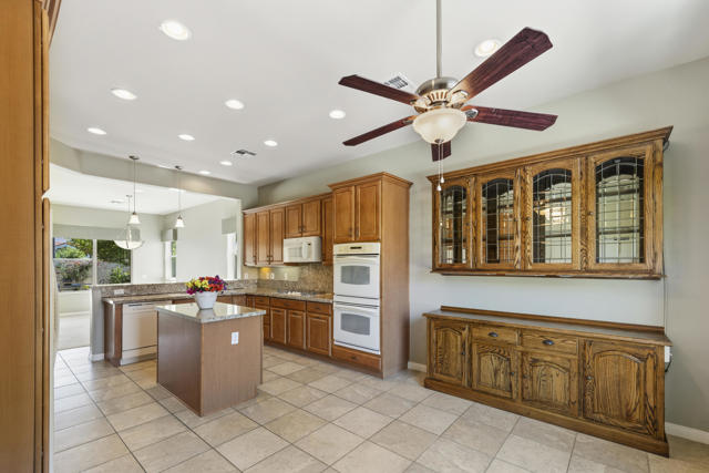 PRICED TO SELL-Don't miss this highly sought-after San Benito model with beautiful views! This spacious home offers an inviting open-concept Great Room featuring an entertainment center cabinet-perfect for relaxing or entertaining. The large primary suite includes direct access to the backyard, while the en-suite bath boasts dual vanities, a soaking tub, separate shower, and a generous walk-in closet. Additional living spaces include a guest bedroom with mirrored doors, a versatile den, bonus room, and a second bathroom-ideal for guests. Ceiling fans are thoughtfully placed throughout the home for added comfort. The well-appointed kitchen is a chef's delight, complete with slab granite countertops, a large center island, double ovens, a five-burner cooktop, built-in microwave, pull-out shelving, and a convenient trash drawer. A bright dining nook with built-in cabinetry provides extra storage and a cozy place to gather. A spacious laundry room with abundant cabinetry and a deep sink leads to the oversized two-car plus golf cart garage, also equipped with built-in storage cabinets. Step outside to your private backyard retreat featuring an extended covered patio, built-in barbeque, and a tranquil water feature-perfect foe enjoying the desert lifestyle. Located in Sun City Shadow Hills, a premier active adult community offering: Two clubhouses, Two fitness centers, a ballroom & activity rooms, a billiard room, Indoor lap pool & outdoor resort-style pools and spas. There are pickleball, tennis & bocce courts, two golf courses(championship & par-3) numerous social clubs and activities. The HOA dues are low and include internet!