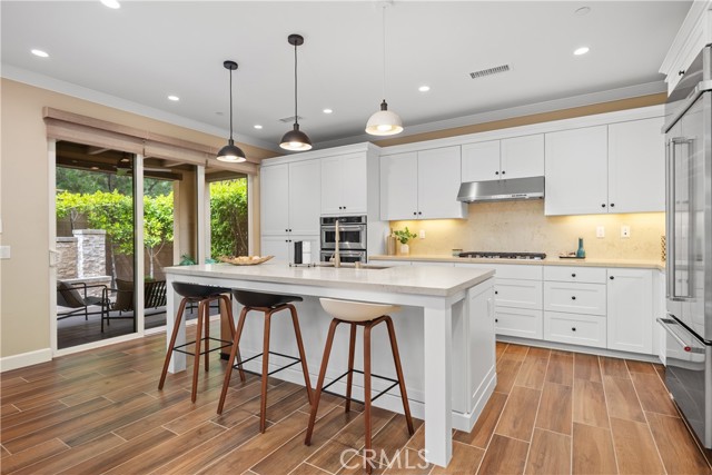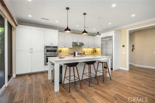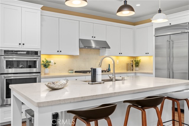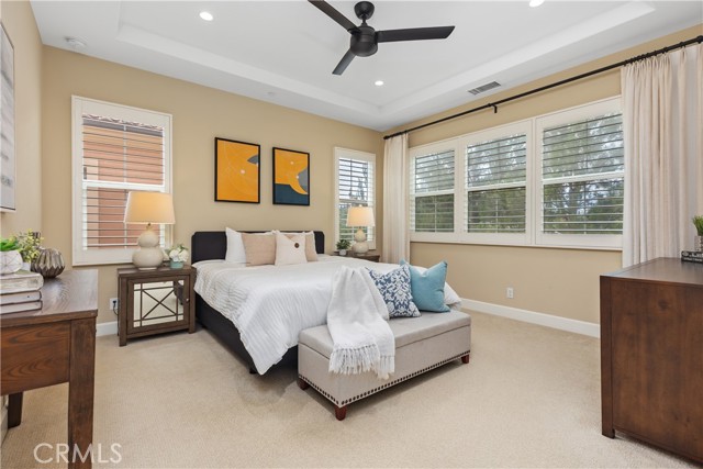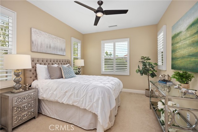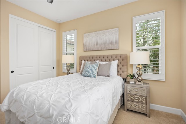 Located in the highly sought-after Eastwood community of Irvine, this beautifully maintained single-family home features 4 spacious beds and 3 full baths, thoughtfully designed for both comfort and style. Step into a bright and inviting interior with tile flooring, recessed lighting, and elegant finishes throughout. The gourmet kitchen is a true centerpiece, showcasing quartz countertops, white cabinetry, and a built-in refrigerator. A sliding door opens seamlessly to the California Room and backyard, creating an indoor-outdoor living. The outdoor space includes a tranquil fountain creating a peaceful retreat. The dining area is enhanced with auto roller shades, custom curtains, and tile flooring, creating a comfortable setting for everyday living. The adjacent living room provides a warm and welcoming atmosphere with a ceiling fan, recessed lighting, and coordinated window treatments for a polished, modern feel. The primary suite serves as a relaxing sanctuary, featuring plush carpeting, window shutters, a ceiling fan, and elegant curtains. The primary bathroom is well appointed with walk-in closet, a glass enclosed shower, separate soaking tub, dual sinks, and abundant natural light. Additional bedrooms are generously sized with ceiling fans and window shutters, sharing hall bath with dual sinks and a tub in shower. First floor bedroom and full bathroom add flexibility for guests or multi-generational living. The laundry room with a sink and built-in cabinetry for added functionality. The garage features epoxy flooring and custom built-in cabinets, providing excellent storage solutions. Step outside to enjoy the beautifully designed California Room complete with a ceiling fan and recessed lighting, perfect for relaxing or entertaining year-round. The cozy backyard, accented with a fountain and lush greenery, creates a private and serene setting. Ideally situated in a private location, this home is just a short walk to the exceptional community amenities, including beautifully maintained parks, resort-style pools and spas, clubhouses, tennis courts, playgrounds, picnic areas, and scenic walking and biking trails. Residents also benefit from access to top-rated schools, Eastwood Village Elementary, Sierra Vista Middle School, and Northwood High School creating a highly desirable lifestyle. This home seamlessly blends modern upgrades, thoughtful details, and an unbeatable location, an exceptional opportunity to experience the very best of Eastwood living.